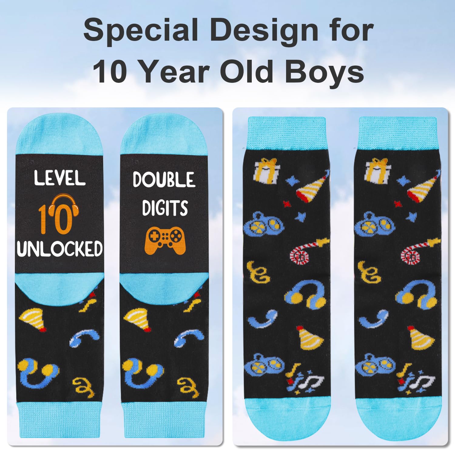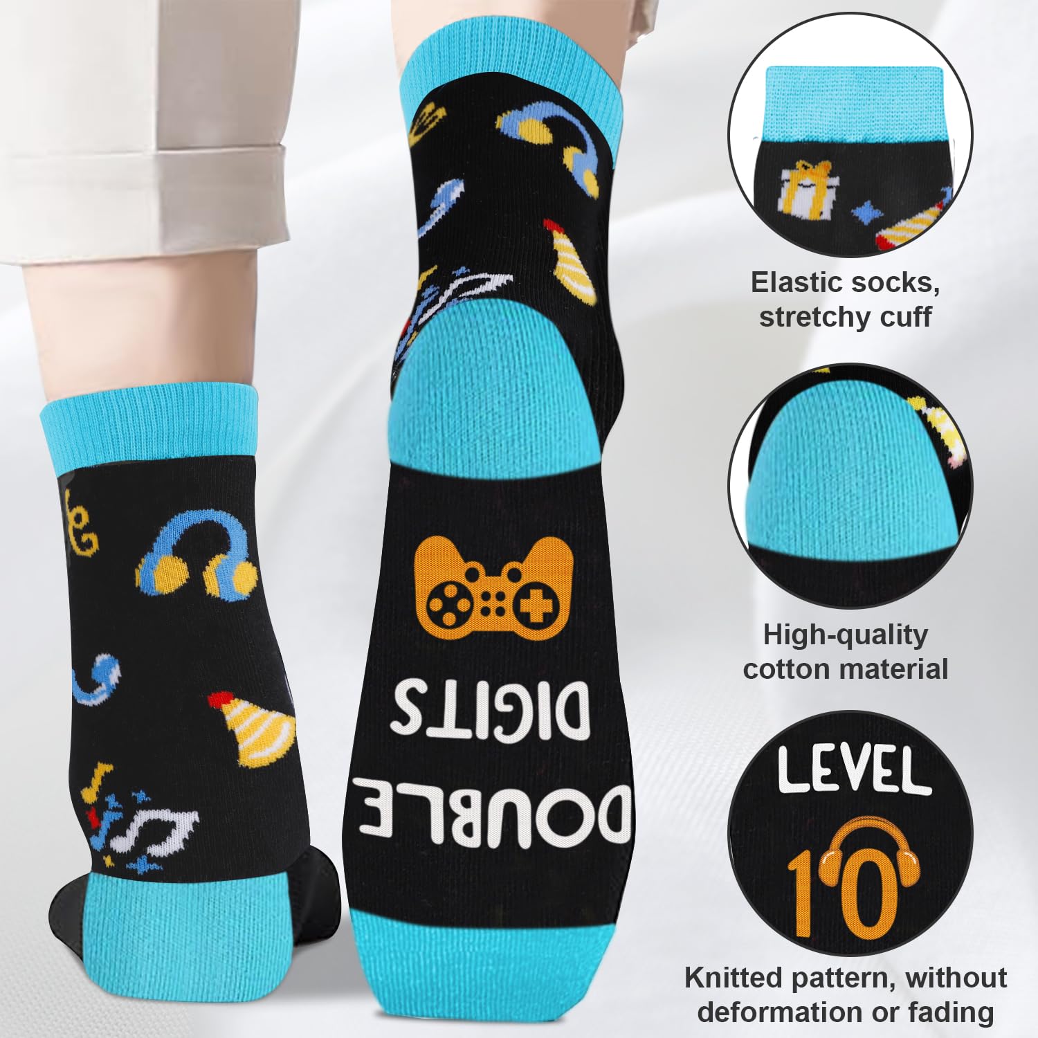 Socks for 10 Year Old Design: Our socks are predominantly black, blue, orange and white, jacquard birthday gifts, balloons, cakes, and other birthday elements on the top, hile the bottom is sewn with a playful hidden message: "LEVEL 10 UNLOCKED, DOUBLE DIGITS," along with a vibrant game-pad design, Suitable for 10th Birthday Gifts, Christmas Gifts, New Years Gifts or White Elephant Gifts