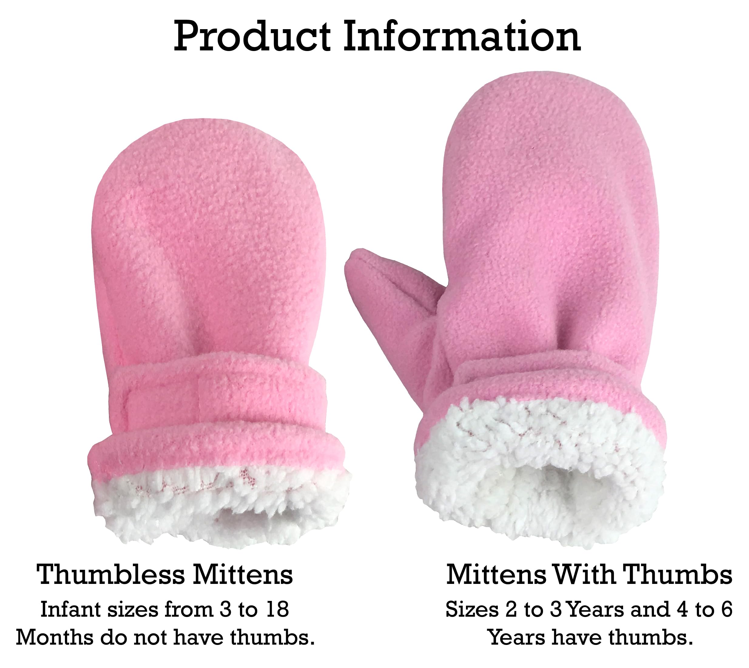 BOYS, GIRLS AND INFANT SIZING INFORMATION: For the baby sizes of 3-6 months and 6-18 months, the mittens do not have thumbs (they are thumbless). For the toddler and child sizes of 2-3 years and 4-6 years, the mittens have thumbs