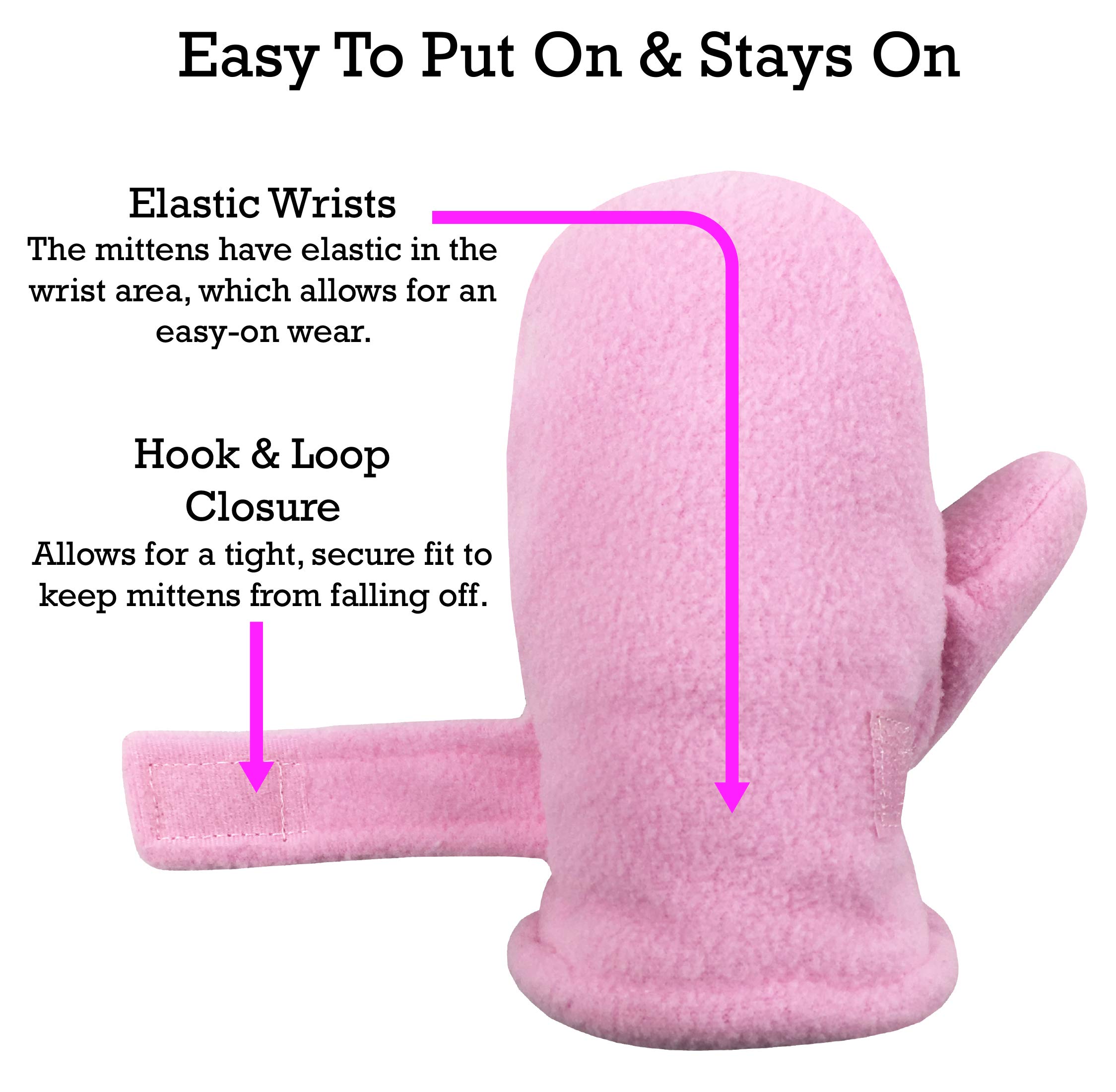 BABY & TODDLER GLOVES THAT ARE EASY TO PUT ON: The infant and child mittens are designed with elastic in the wrist area, which widens and allows for an easy-on fit. The hook and loop closure allows for a tight and secure fit