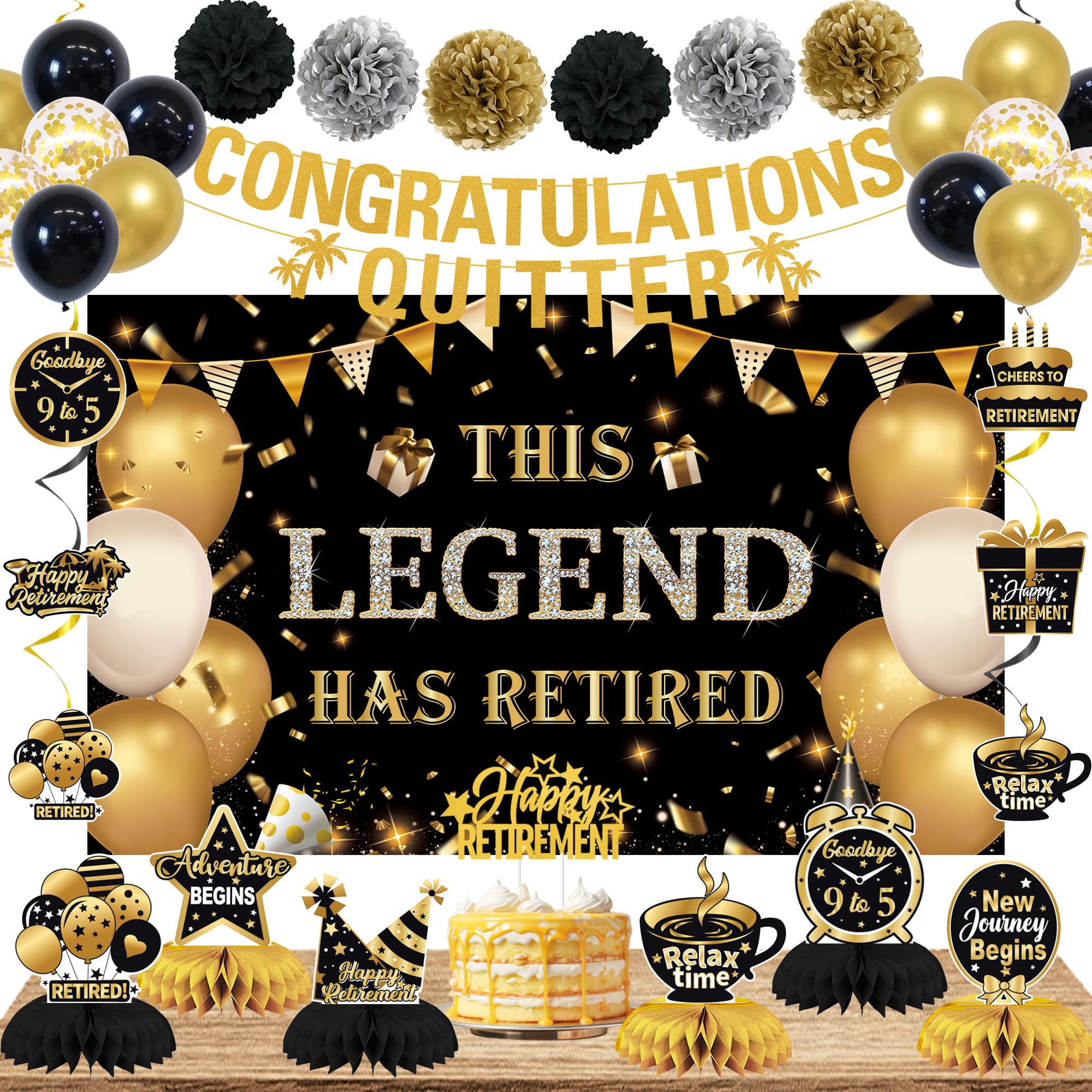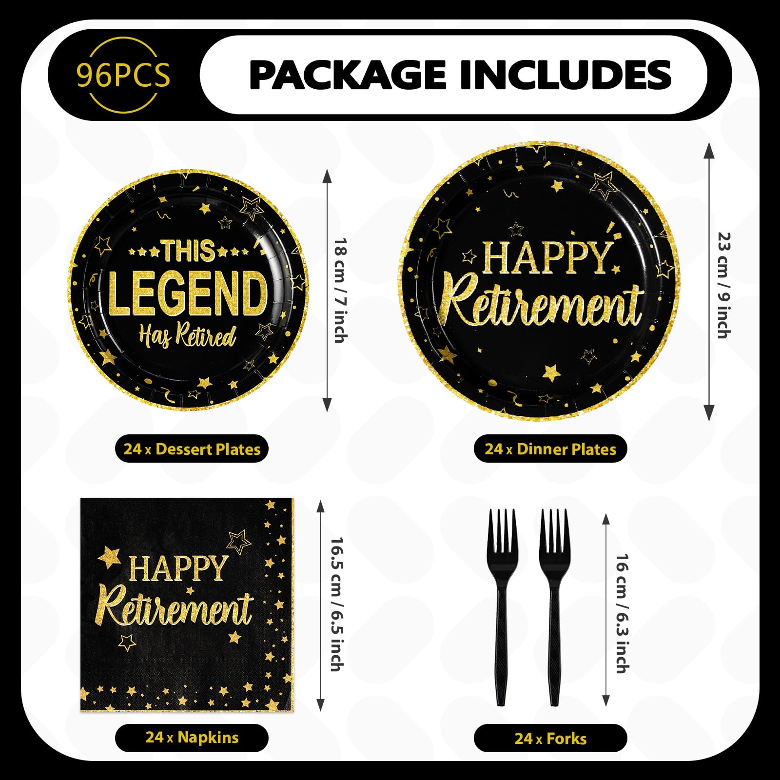 Sophisticated Retirement-Themed Design: Crafted with a sleek black and gold color scheme, this dinnerware set elevates retirement celebrations with elegant, minimalist flair. Each 9" and 7" plate features bold, metallic lettering: “Happy Retirement" and “This Legend Has Retired," while the 6.5" napkins repeat the celebratory “Happy Retirement" motif. The cohesive design ensures a polished look for tablescapes, photo backdrops, or buffet setups, making it ideal for honoring retirees in style