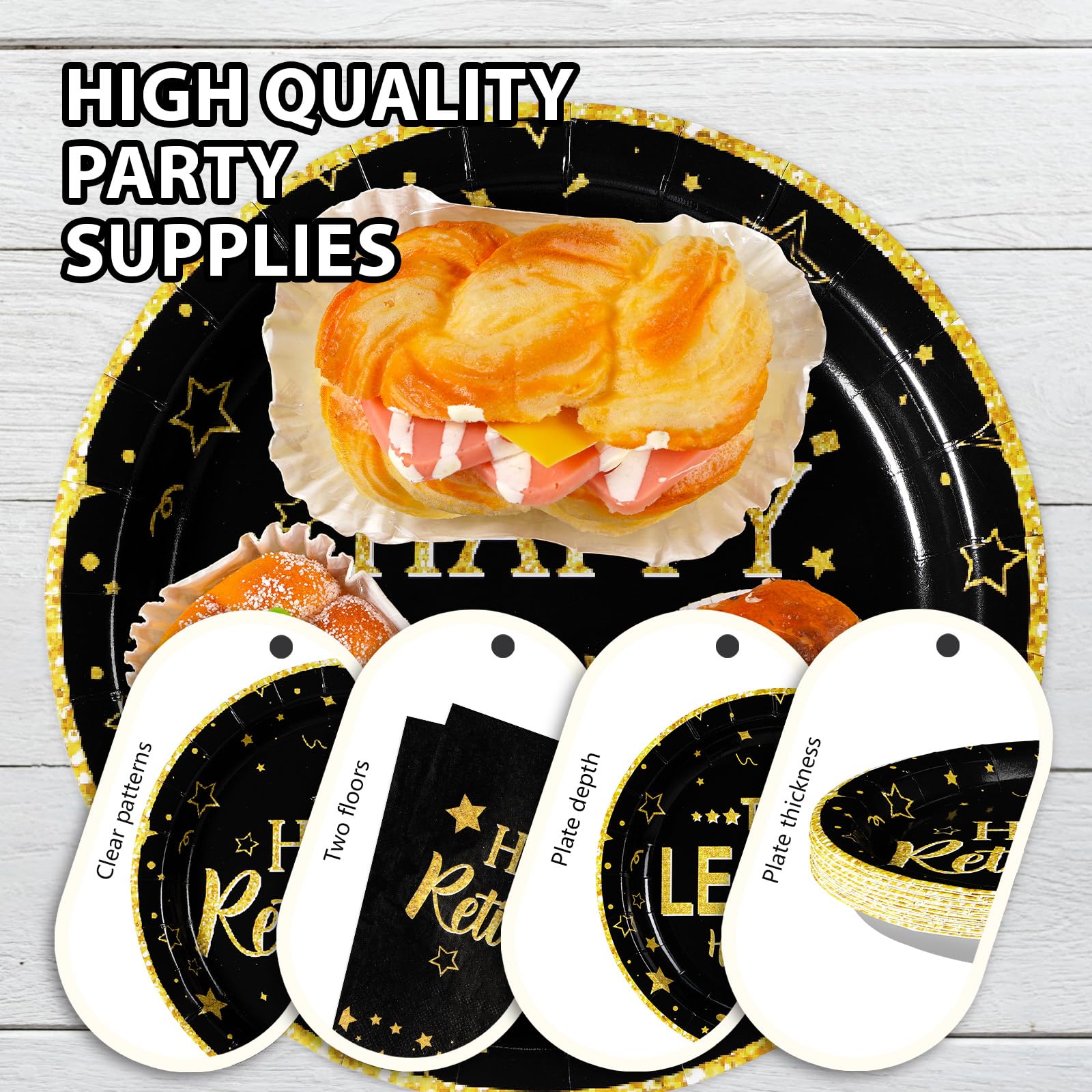 Versatile for Any Retirement Celebration: Whether hosting a formal dinner, casual backyard party, or office farewell, this set adapts seamlessly. The timeless black-and-gold palette complements balloons, banners, and other décor themes. Use the plates for cake displays, appetizers, or main dishes, and let the napkins double as decorative accents beside utensils or wrapped around silverware bundles