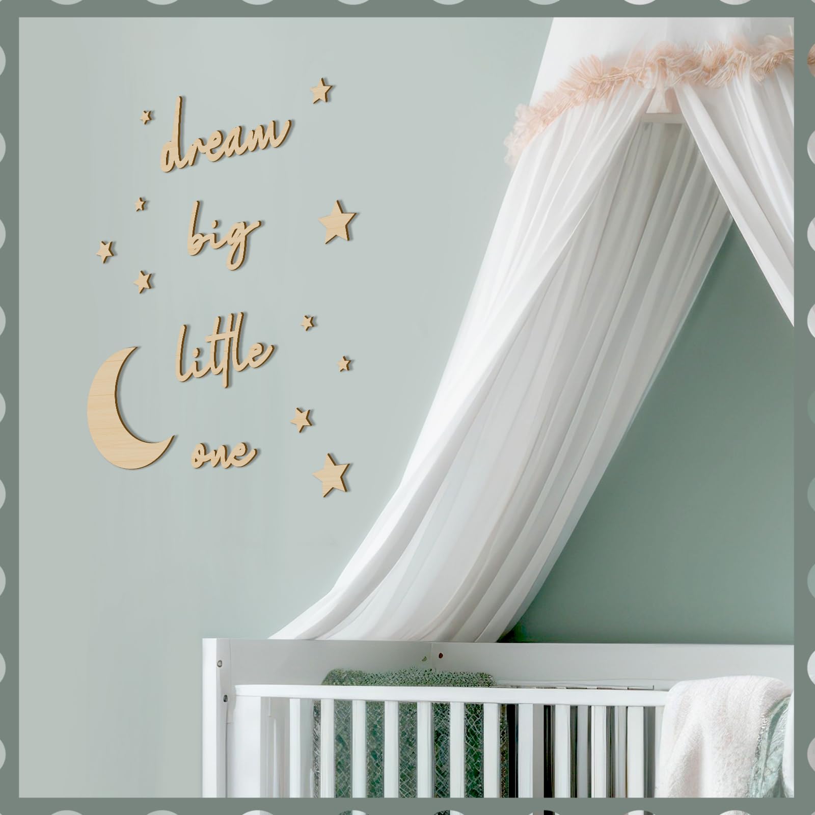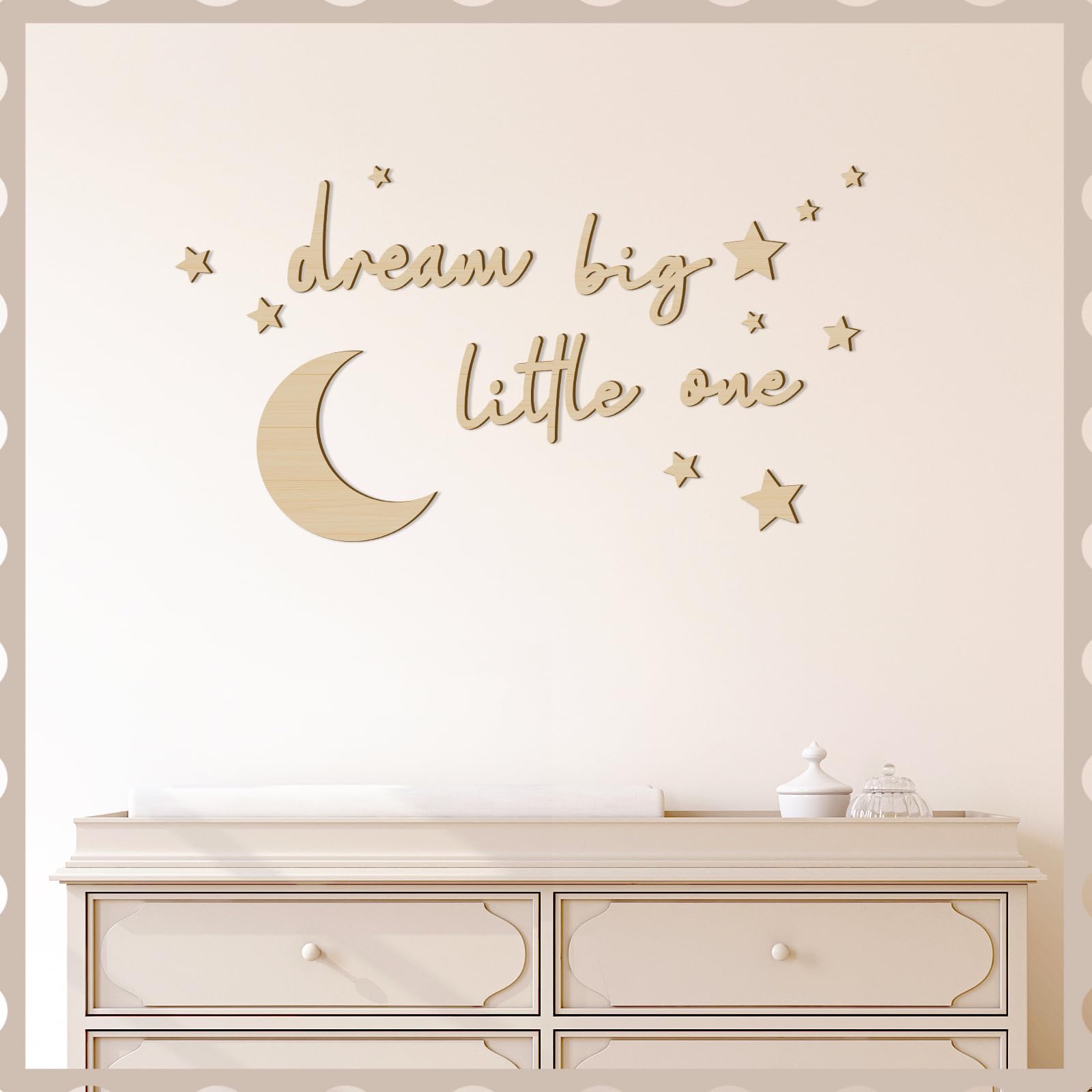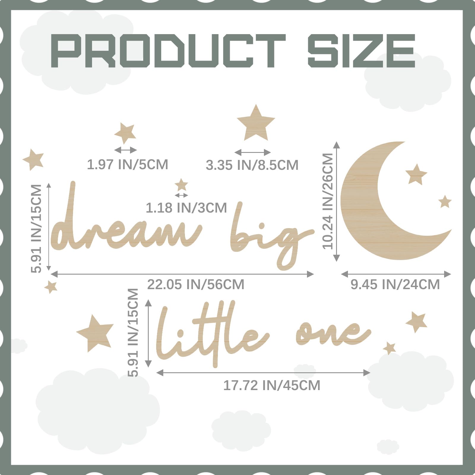 Suitable Size: our nursery decorations are not just visually appealing but also suitable in size; The dream big sign measures approximately 22.05 x 5.91 inches, the little one sign is about 17.72 x 5.91 inches; The star signs are divided into 2 large sizes, 4 medium sizes, and 4 small sizes; The largest star size is 3.35 inches/ 8.5 cm, the medium size is 1.97 inches/ 5 cm, and the smallest star size is 1.18 inches/ 3 cm; The size of the moon sign is about 9.45 x 10.24 inches