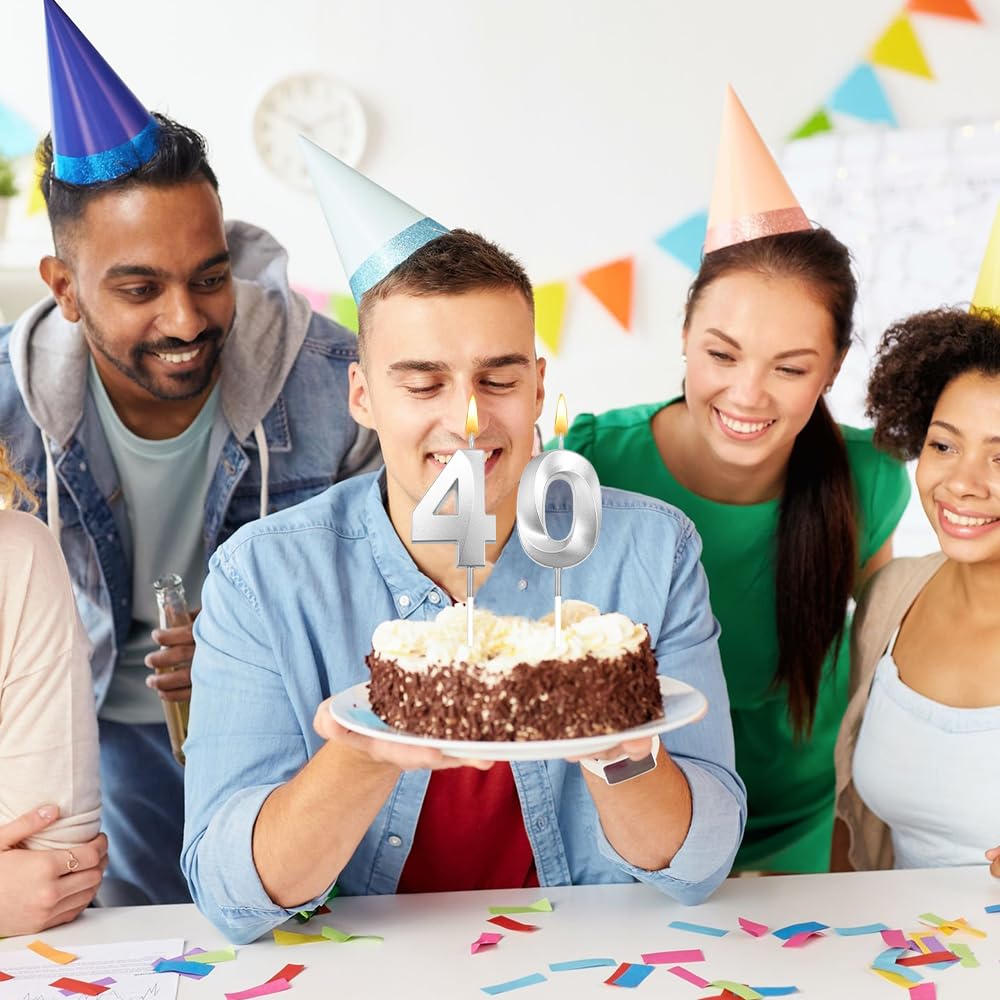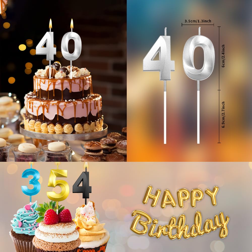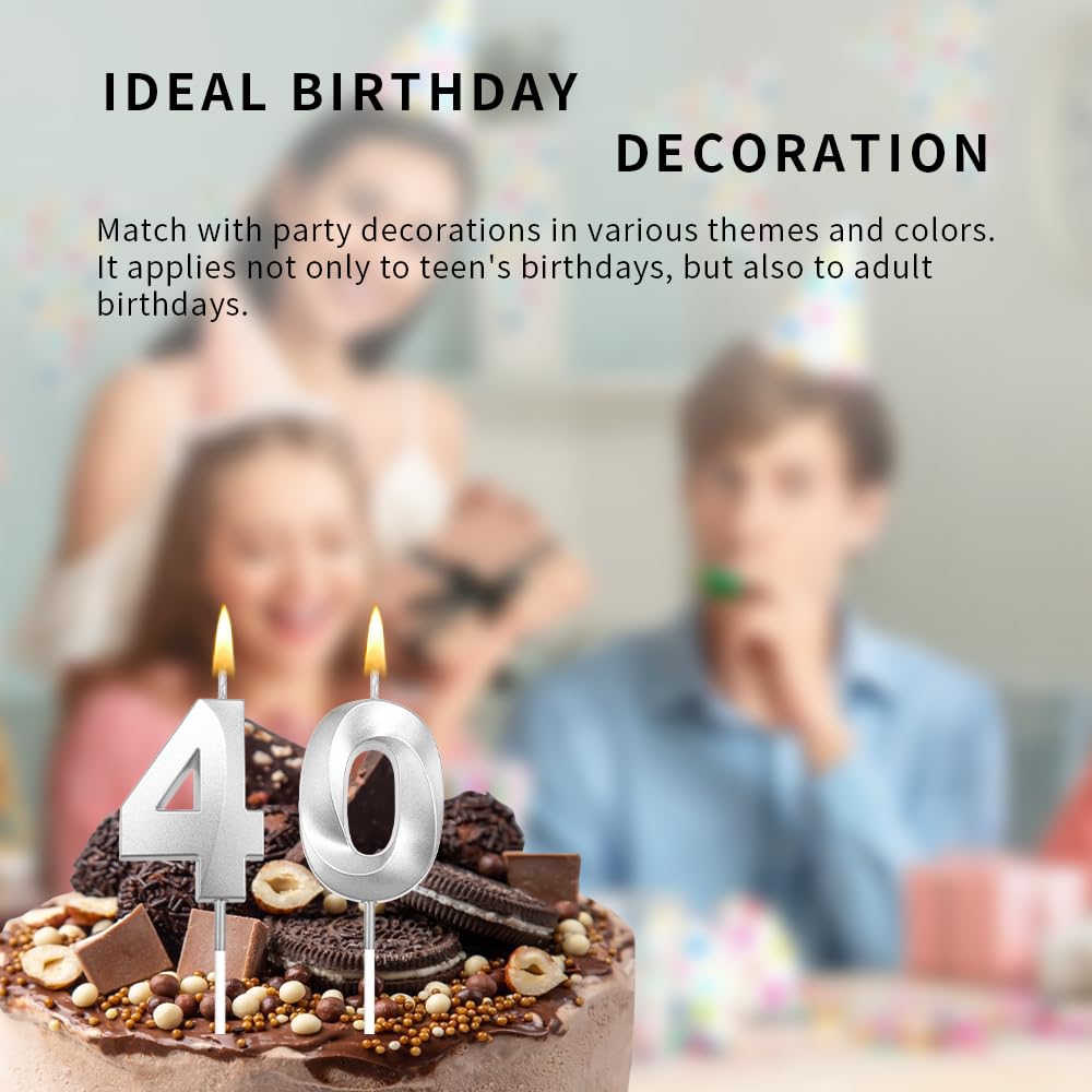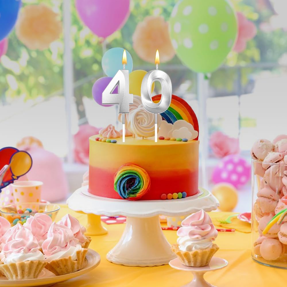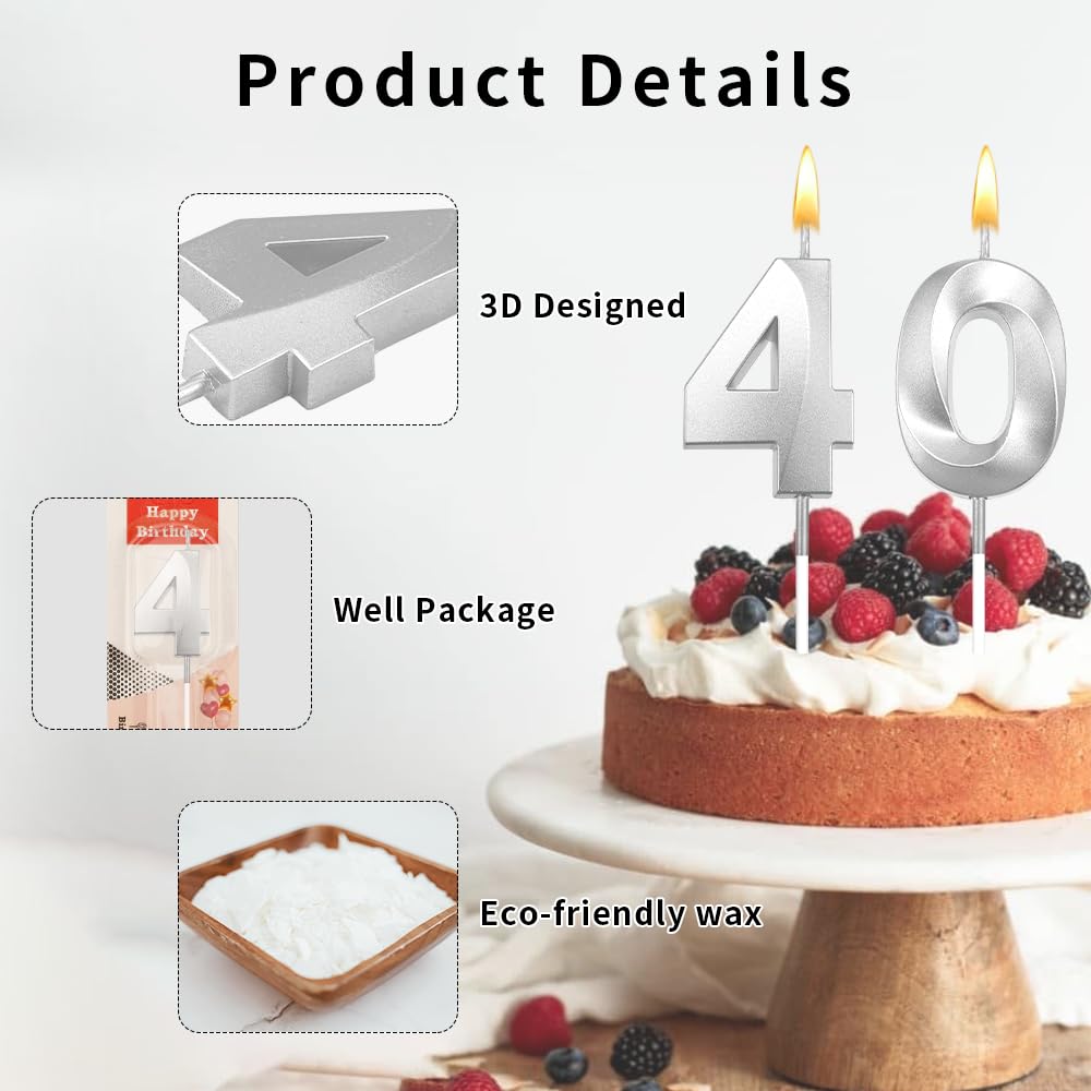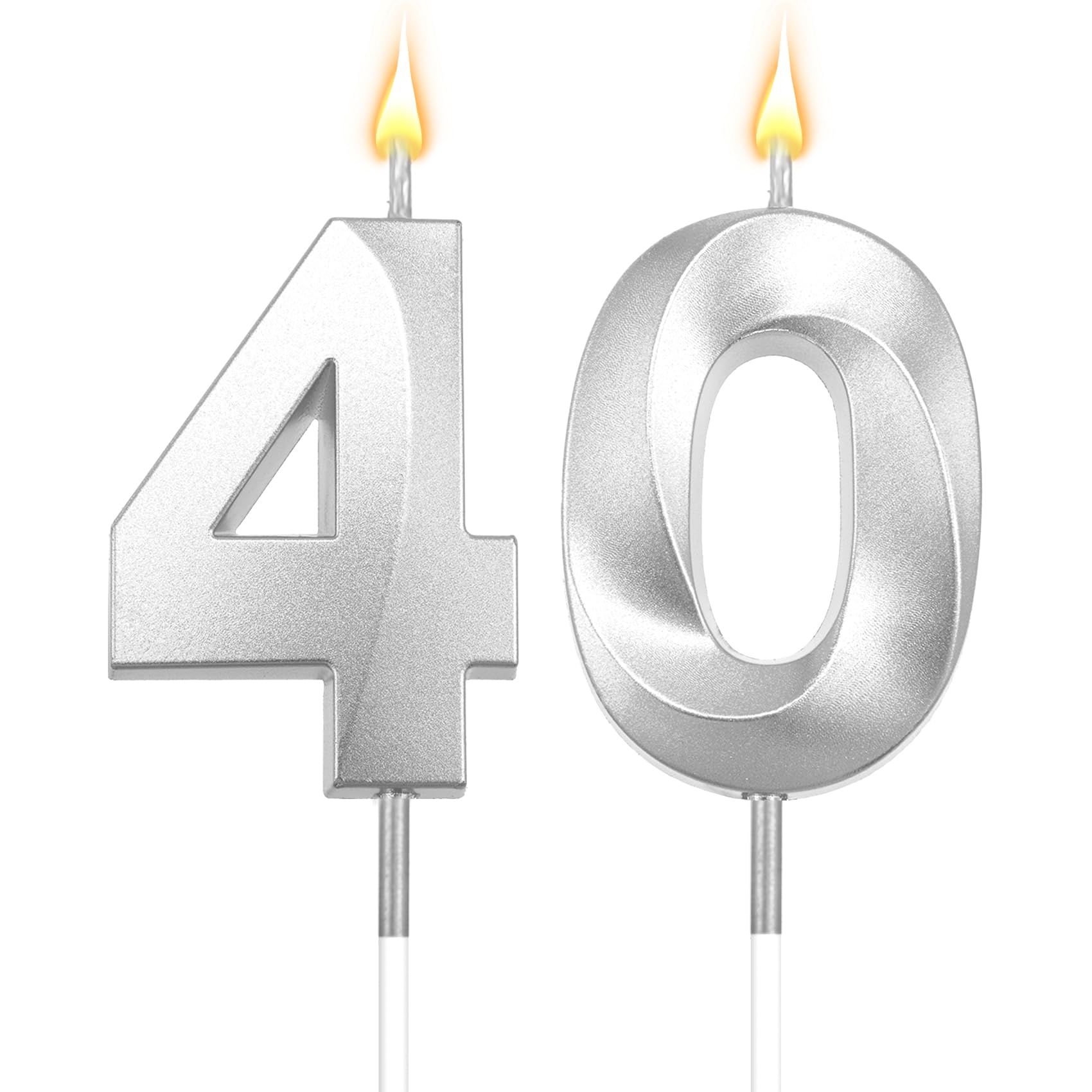 3d Visual Sense Birthday Candles: Package contains 2 Pcs silver birthday candles 40 including number 4 birthday candle and number 0 birthday candle. The 40 birthday candle is eye-catching and sparkling in the dark light, you can use velas de cumpleaƱos to be beautiful cake decorations to embellish your cakes and cupcakes make your birthday cakes stand out, create perfect birthday atmosphere. It's your special day and we want you to revel in the joy.40th birthday candles 40th birthday decorations