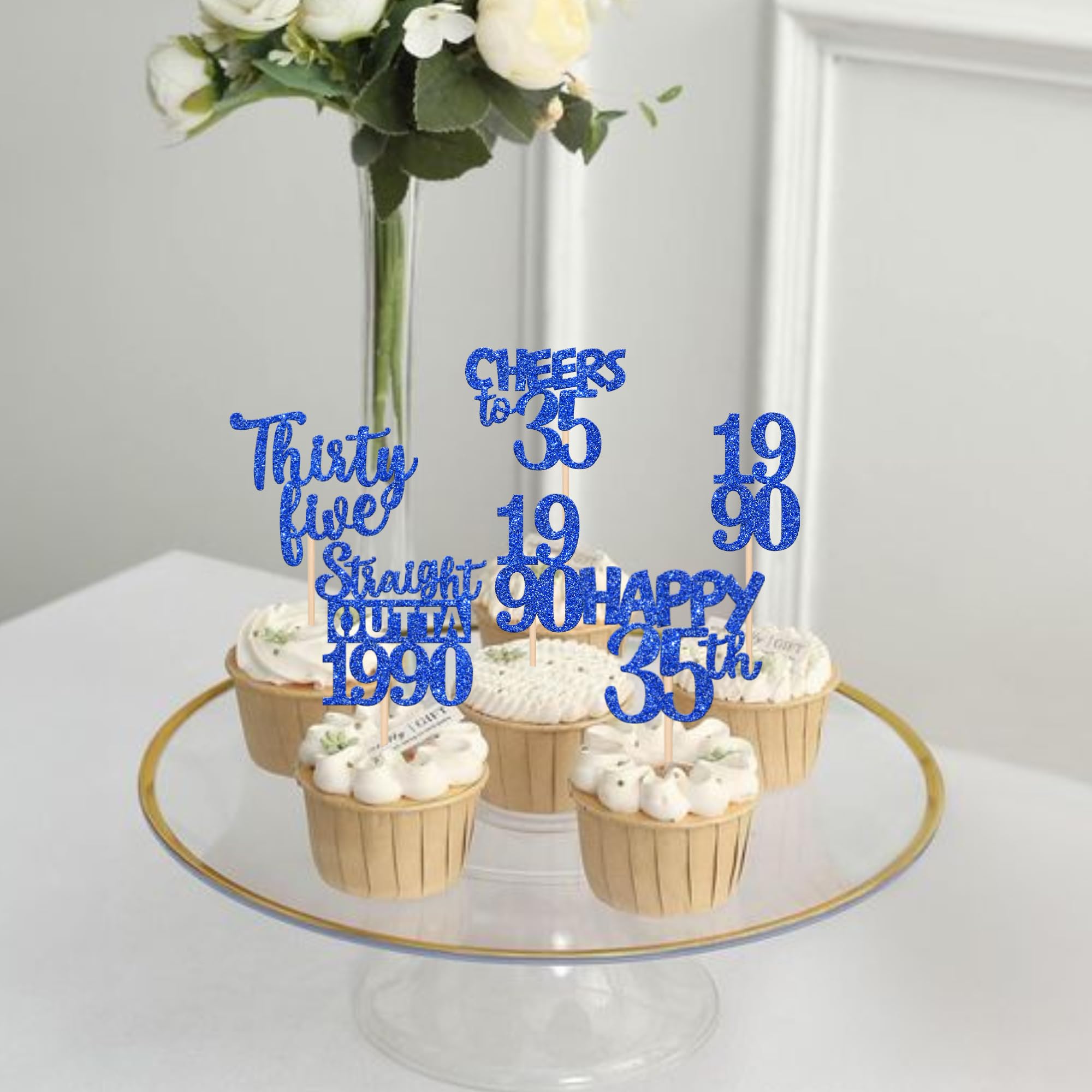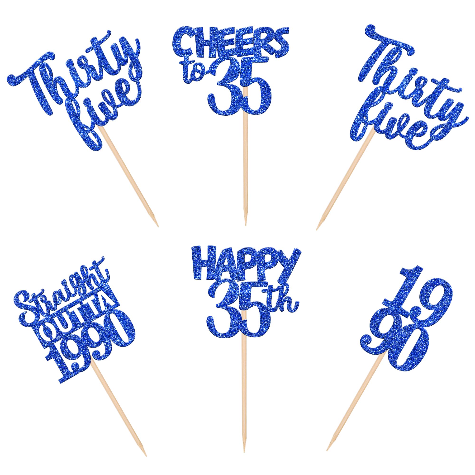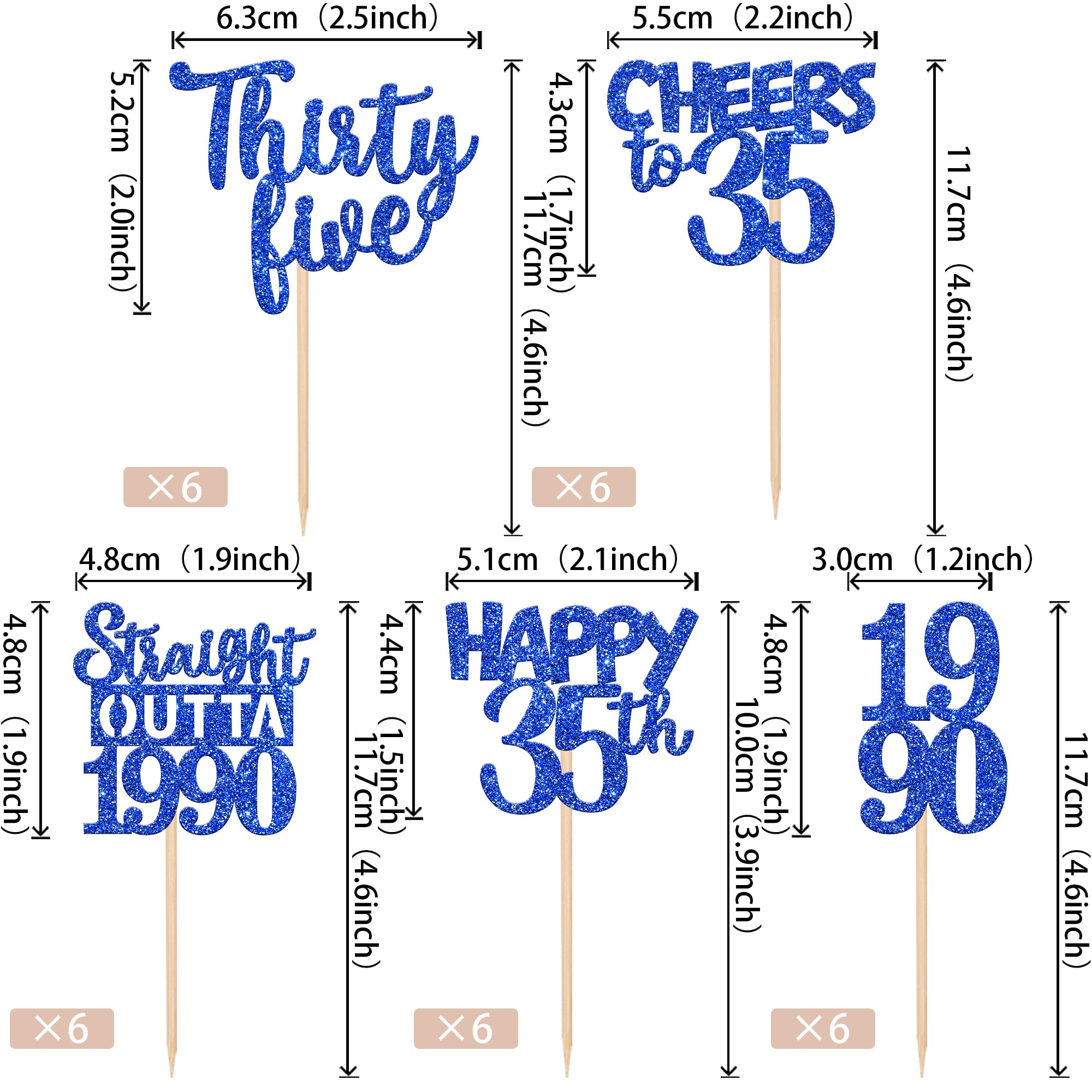 30 PCS 35th Birthday Cupcake Toppers Glitter Ten Happy 35th Straight Outta 1990 Cupcake Picks for Cheers to 35 Fabulous 35th Birthday Anniversary Party Cake Decorations Supplier Blue Perfect for happy 35th bithday theme party, straight outta 1990 theme party, 35th wedding anniversary theme party,cheers to 35 years theme party cupcake decorations supplies. Pack of 30 pcs, 6 pcs of each design. The size is 1.9*4.6 inch / 1.3*3.9 inch / 2.1*4.6 inch / 2.5*4.3 inch / 2.2*4.5 inch ( with stick ) Made of high quality paper card stock,thick and sturdy. These straight outta 1990 cupcake toppers are one side glitter, another side is white, and they are intended for decoration only, please do not put them in oven or microwave. If the item you received has any defects, please contact us immediately. we will deal with it within 24 hours.