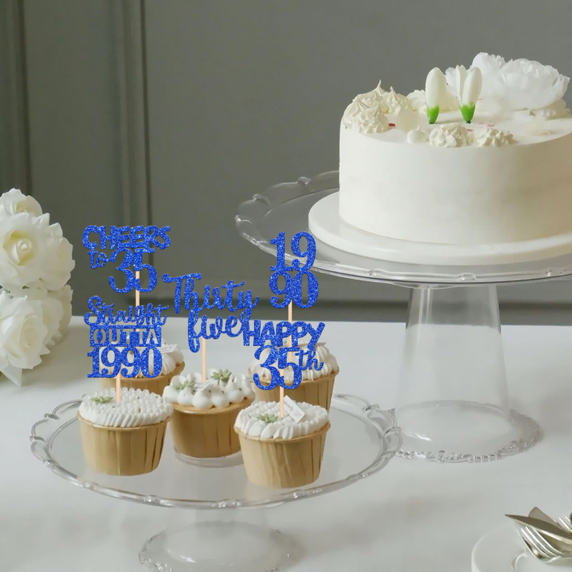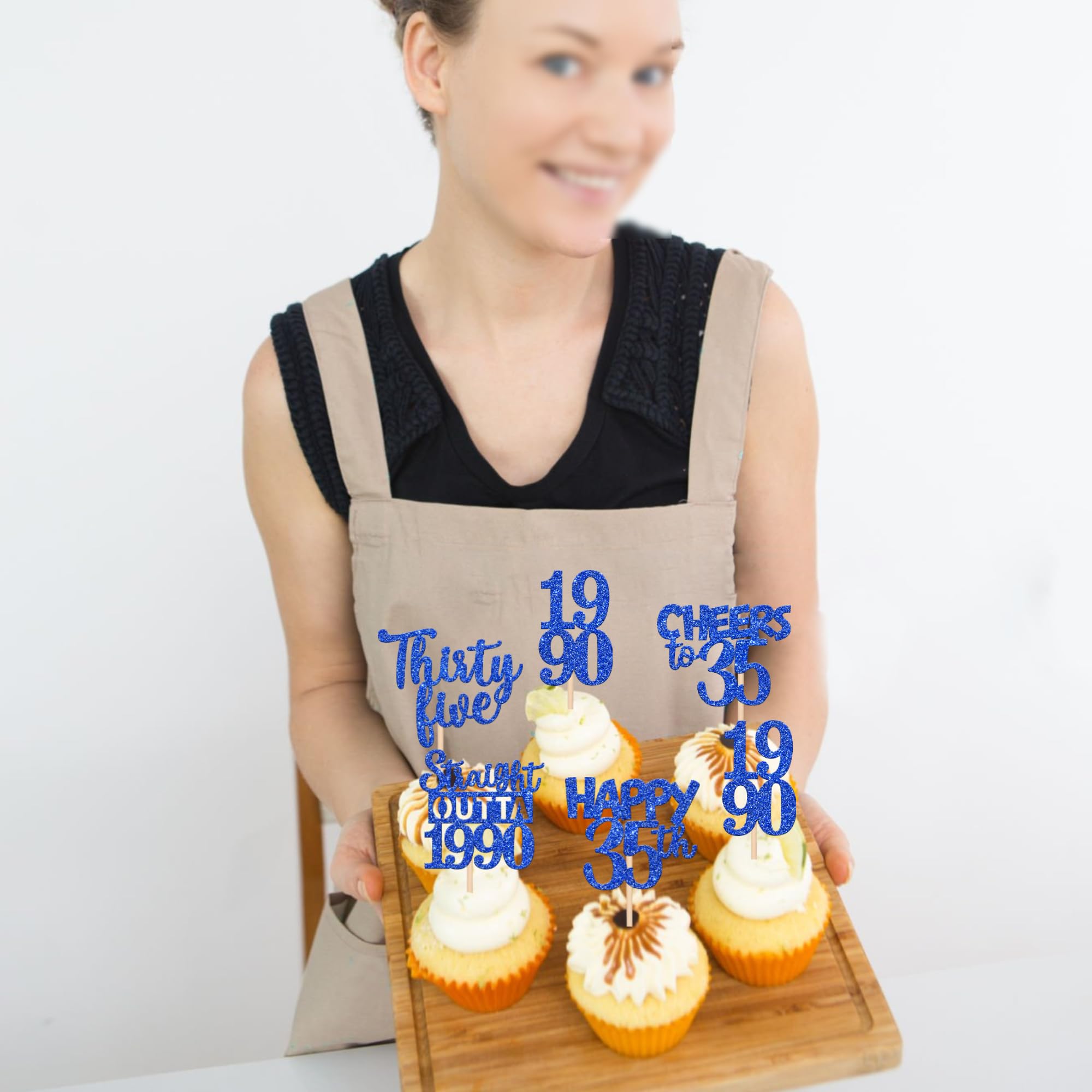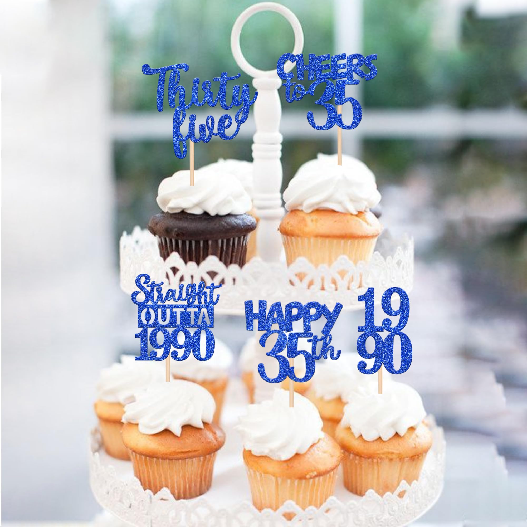 30 PCS 35th Birthday Cupcake Toppers Glitter Ten Happy 35th Straight Outta 1990 Cupcake Picks for Cheers to 35 Fabulous 35th Birthday Anniversary Party Cake Decorations Supplier Blue Perfect for happy 35th bithday theme party, straight outta 1990 theme party, 35th wedding anniversary theme party,cheers to 35 years theme party cupcake decorations supplies. Pack of 30 pcs, 6 pcs of each design. The size is 1.9*4.6 inch / 1.3*3.9 inch / 2.1*4.6 inch / 2.5*4.3 inch / 2.2*4.5 inch ( with stick ) Made of high quality paper card stock,thick and sturdy. These straight outta 1990 cupcake toppers are one side glitter, another side is white, and they are intended for decoration only, please do not put them in oven or microwave. If the item you received has any defects, please contact us immediately. we will deal with it within 24 hours.