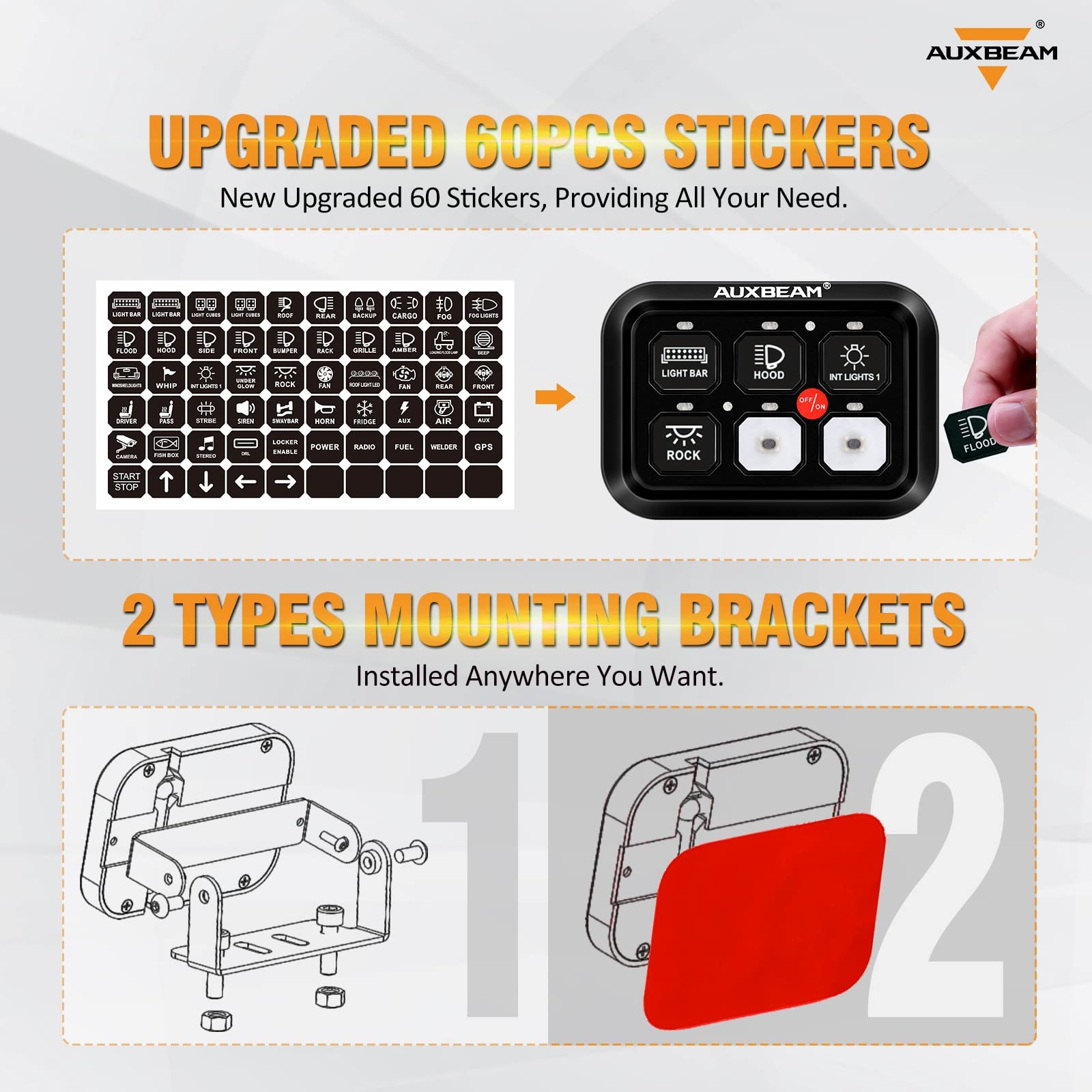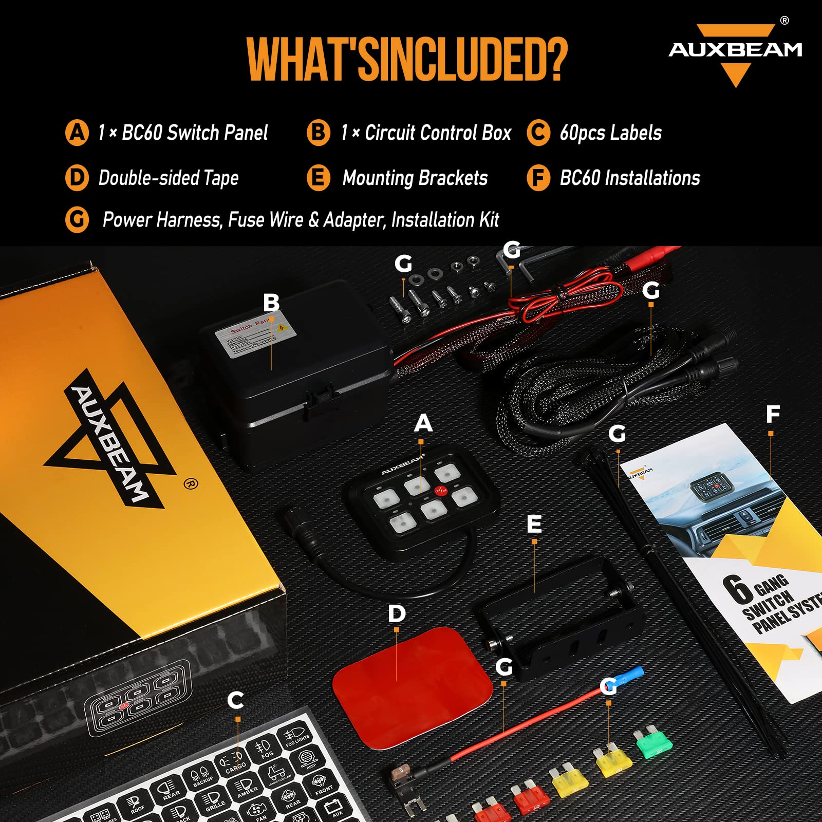 AUXBEAM 6 GANG SWITCH PANEL: Offers a perfect solution to clean up all wiring harness and add a single panel to control everything. This switch panel with 6 circuits can power all types of 12V accessories, Max power: 720W / Max current: 60A, Operating temperature: -40°C to +105°C