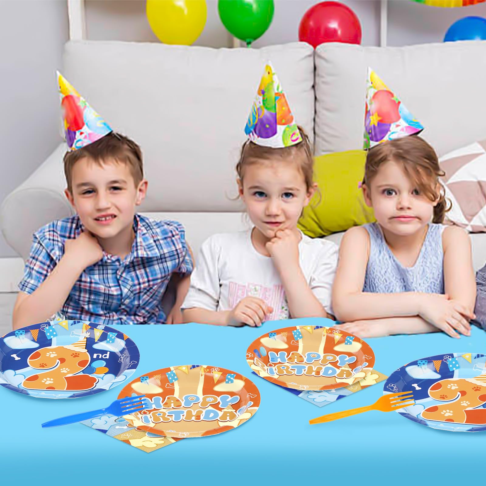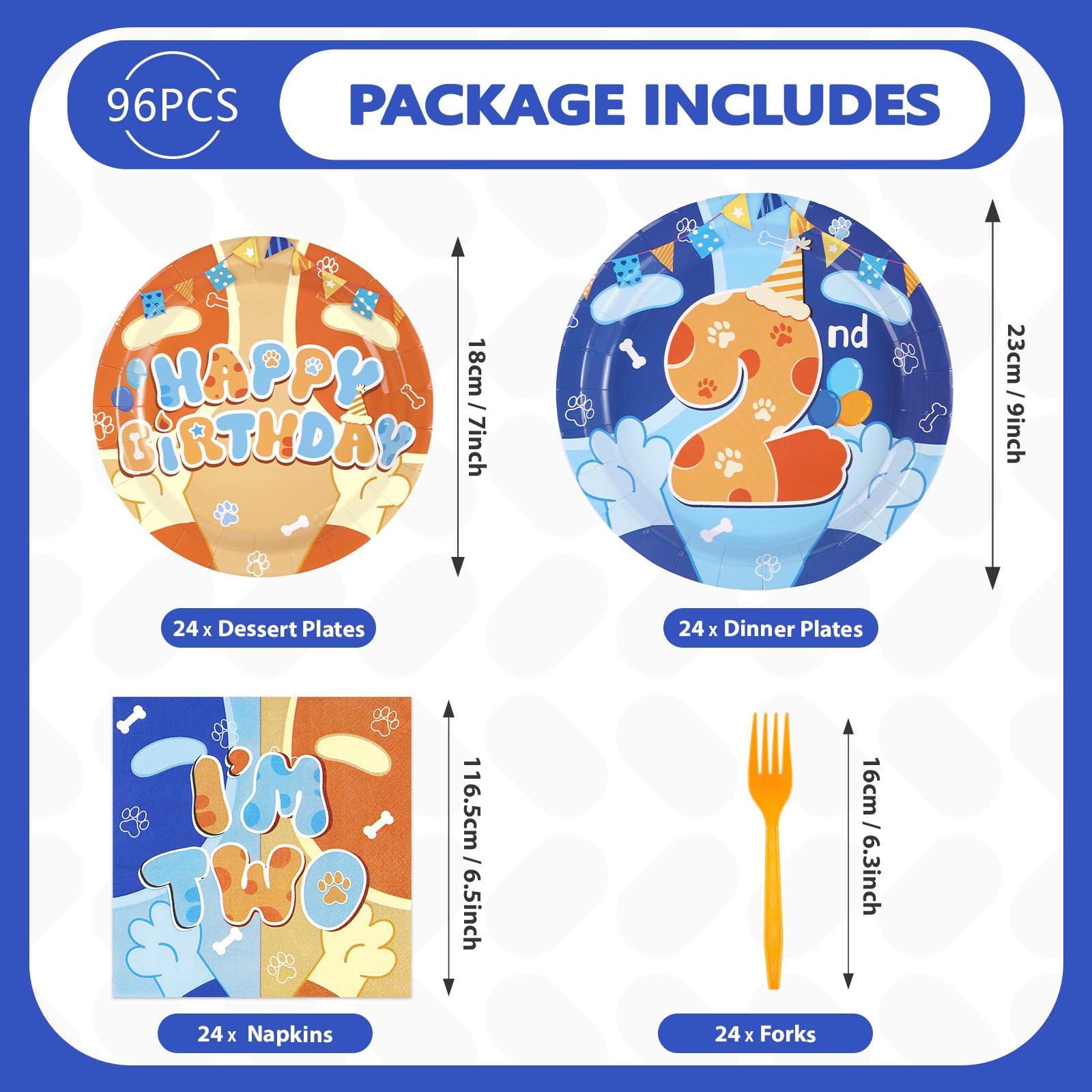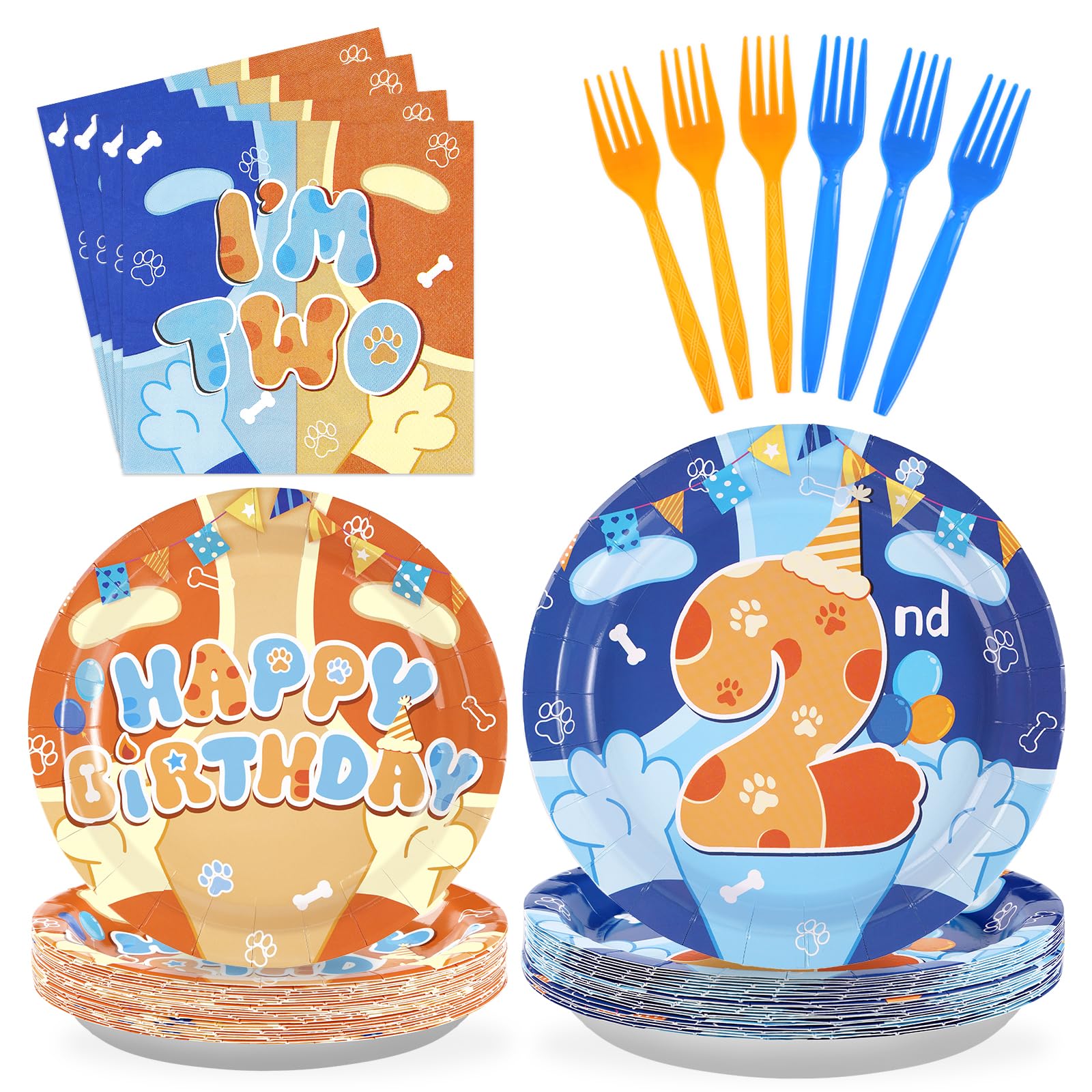 Blue Cute Dog Birthday Party Decorations: Our blue cartoon dog disposable tableware includes 24 * 9'' blue cute dog 2nd birthday party plates, 24 * 7'' blue cute dog plates, 24 * 6.5'' paper napkins, and 24 plastic forks. This blue cute dog 2nd birthday party decorations kit is specially designed for boys girls birthday party. I will definitely be a hit for your special event