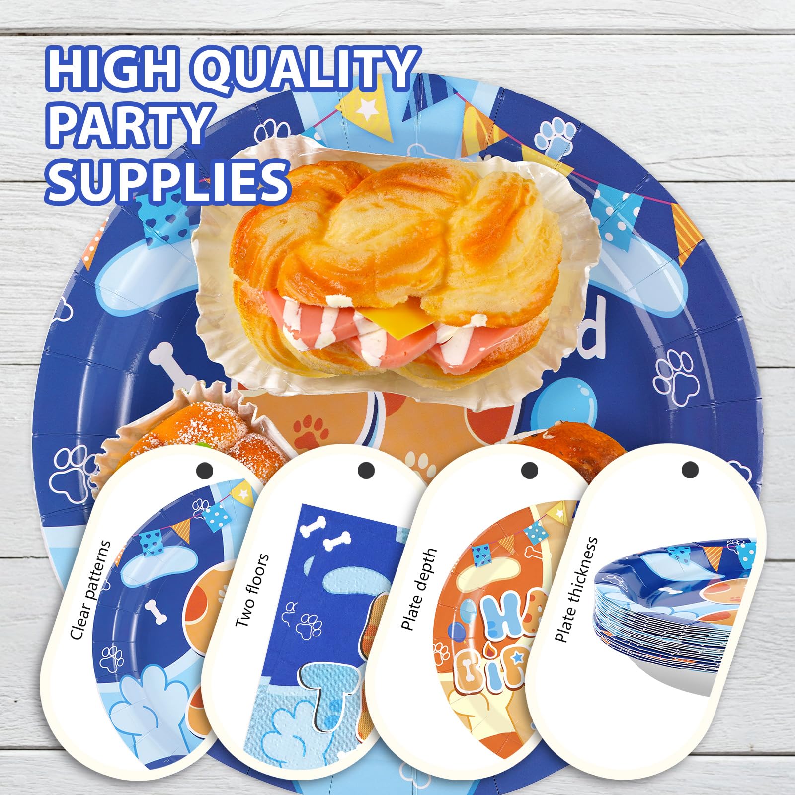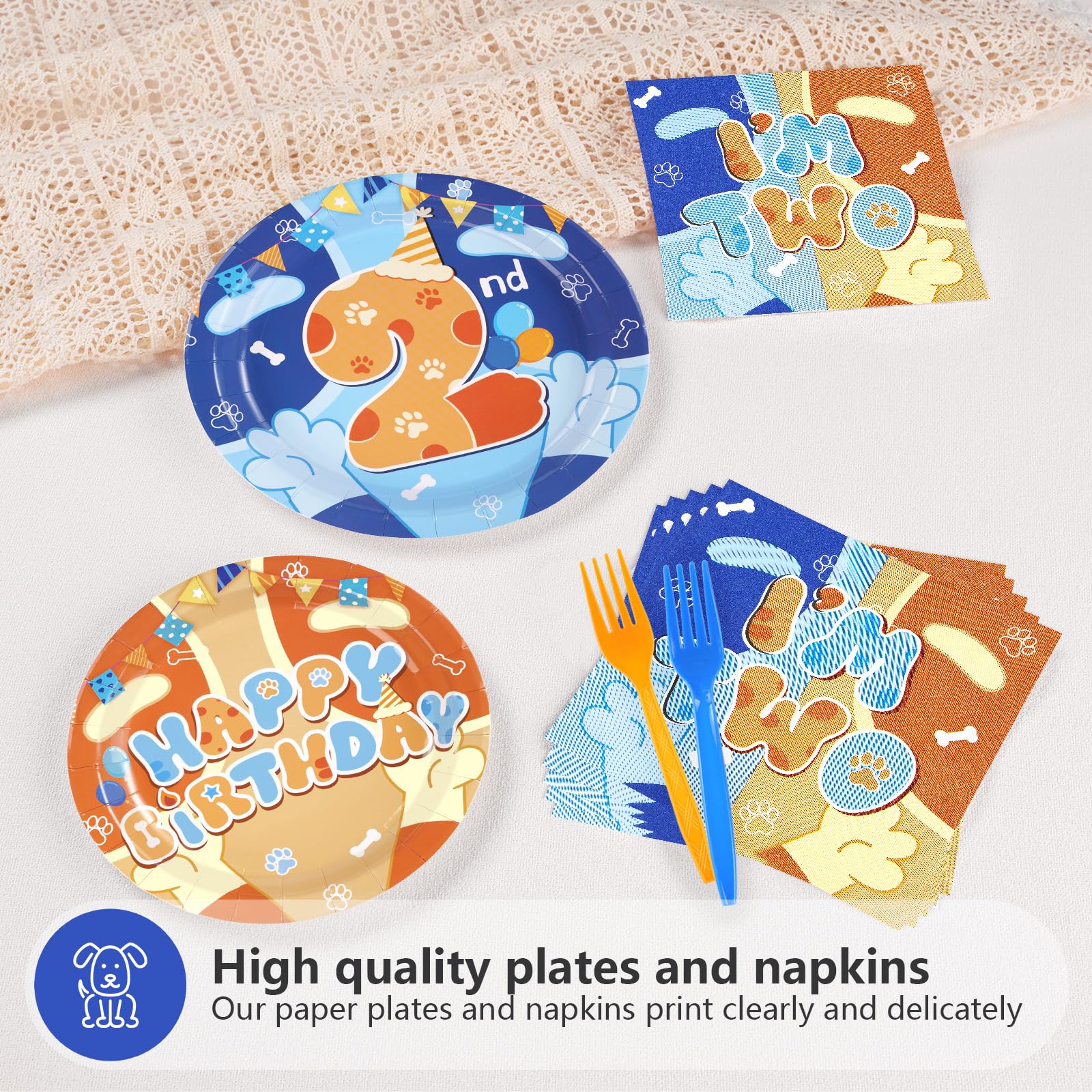 Premium Material: The blue cartoon dog disposable plates are made of heavy duty paper. blue cute dog 2nd birthday plates are designed to be strong enough to hold a full plate of food without folding and tearing. Napkins are soft and absorbent to ensure durability (Tips:Please do not microwave these products)