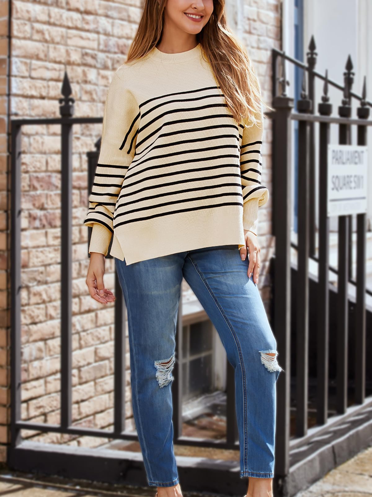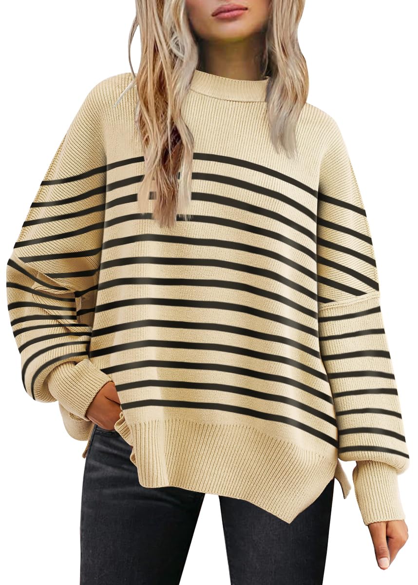 Great Features: UNIQUE OUTSIDE SEAM DESIGN, crewneck long sleeve sweater, tunic tops for leggings, side split hemline, oversized design, vertical grain cuffs make it more chic