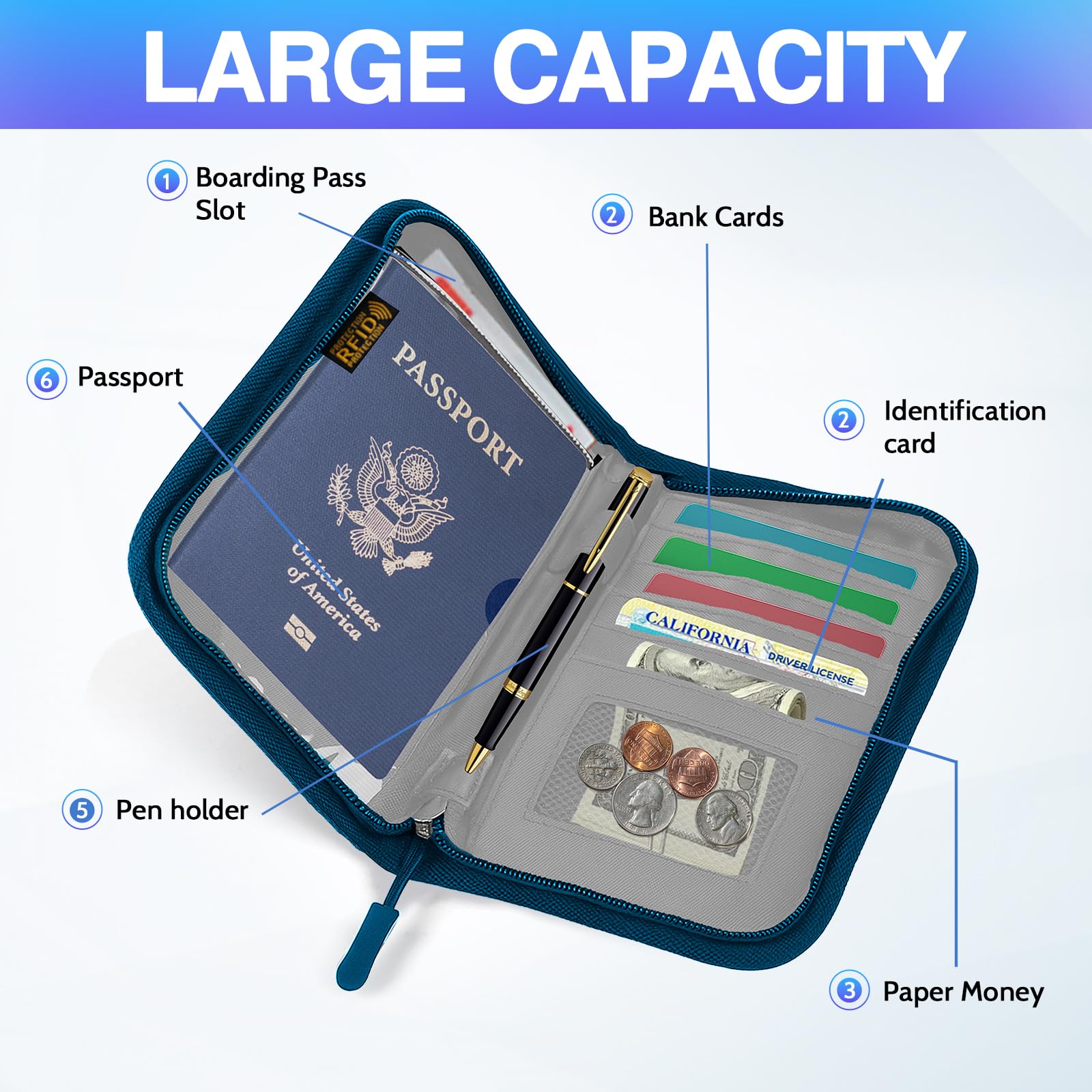 Description Introducing our versatile and stylish RFID Passport Wallet for Women - the ultimate passport wallet for women travel who value convenience and organization. Designed with the needs of large families in mind, this spacious passport holder is perfect for family vacations and group trips.Crafted from high-quality materials, our passport wallet offers durability and protection for your important travel documents. The RFID blocking technology ensures that your personal information remains secure, safeguarding against electronic pickpocketing and identity theft.With multiple compartments and pockets, this travel wallet provides ample space to store your passports, cards, cash, and other essentials. The waterproof feature adds an extra layer of protection, keeping your belongings safe from unexpected spills or rainy weather.Whether you're traveling with your partner, children, or extended family, our rfid passport sleeve use is designed to accommodate multiple passports. The zippered closure ensures that everything stays in place, while the compact size allows for easy storage in your bag or carry-on.Stay organized and stress-free during your travels with our family passport holder. It's not just a practical accessory, but also a fashionable one. The sleek design and choice of colors make it a stylish addition to any outfit.Invest in the best passport wallet for travel and experience the convenience and peace of mind it offers. Get your RFID Passport Wallet for Women today and embark on your next adventure with confidence.