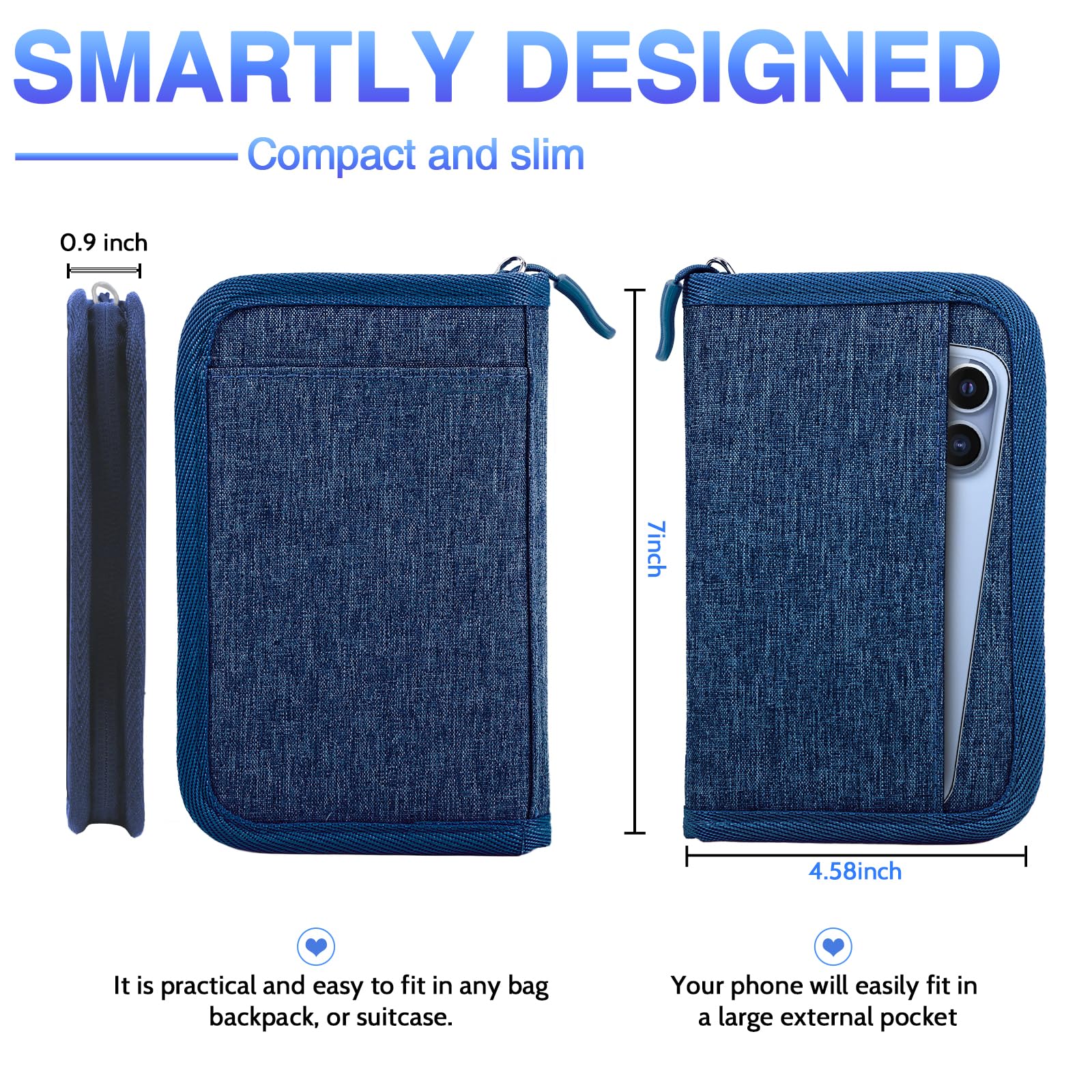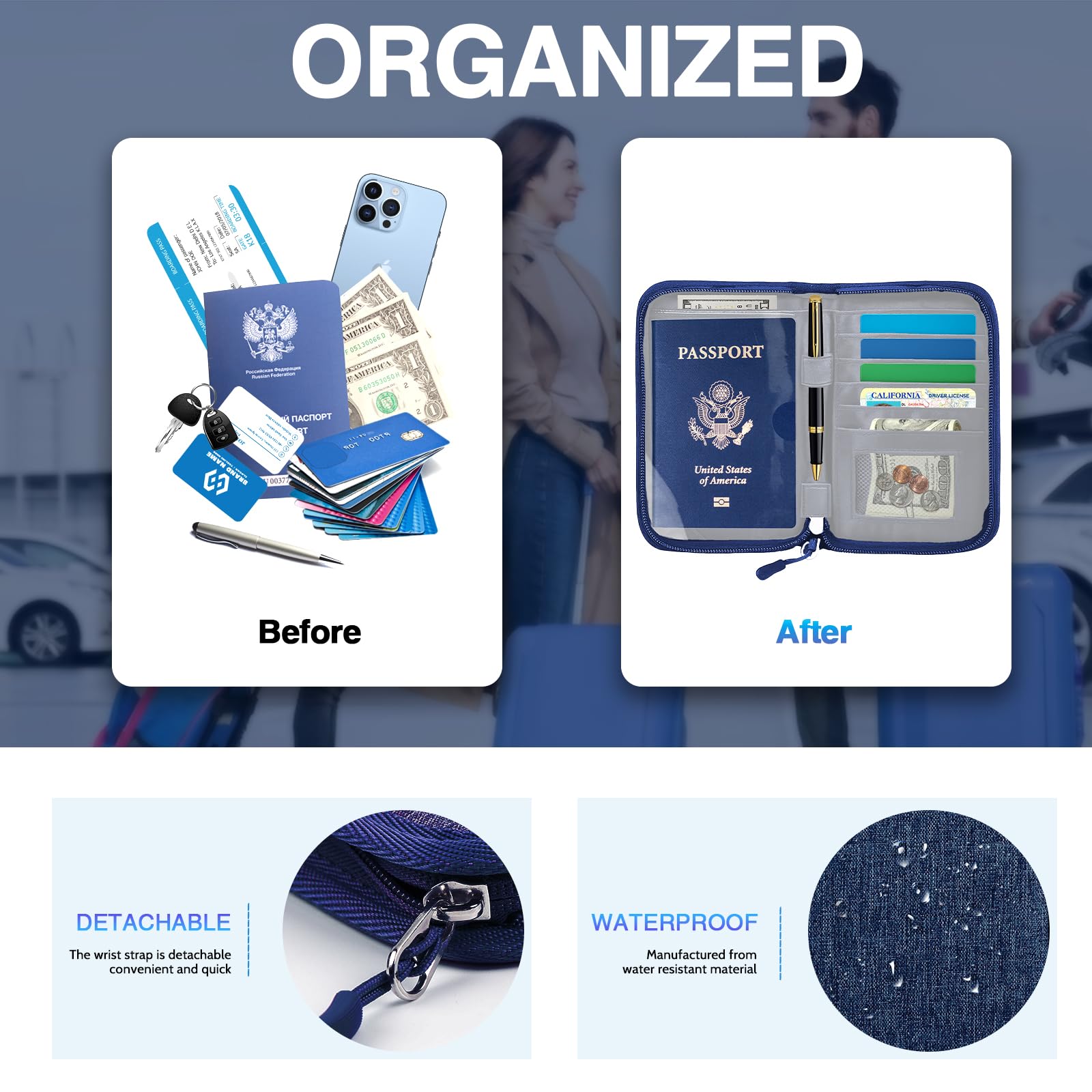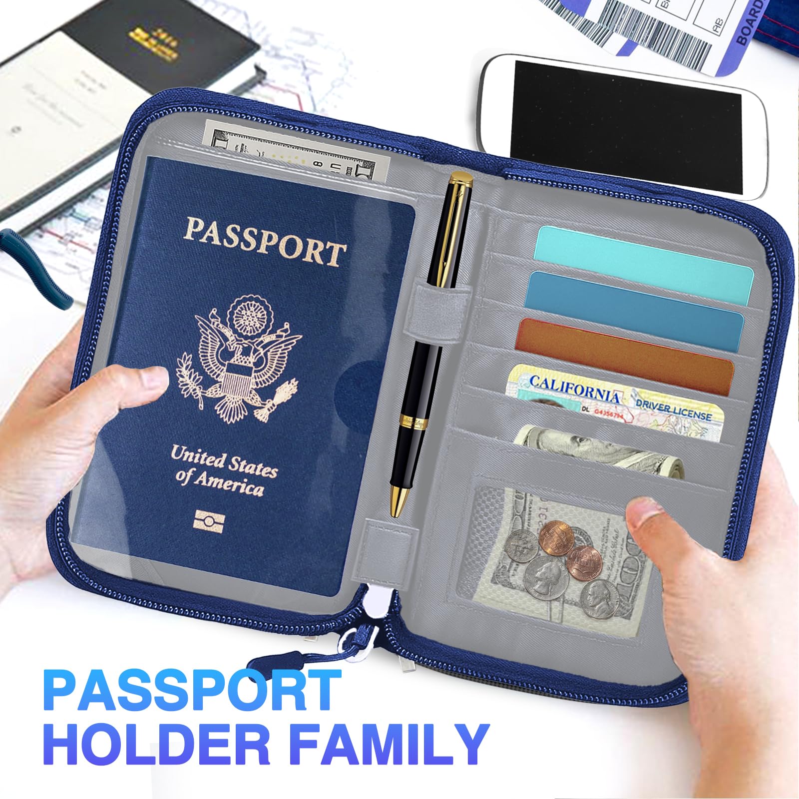 【Rfid Blocking Protective passport bag】passport holder for 2 can effectively protect your card from being scanned, including 5+5 passport pockets, 1 boarding pocket sleeve, 1 transparent pocket, 1 quick access pocket, 1 pen holder, 1 mesh cash pockets, 5 Card slots, a coin mesh pocket and detachable key chain.