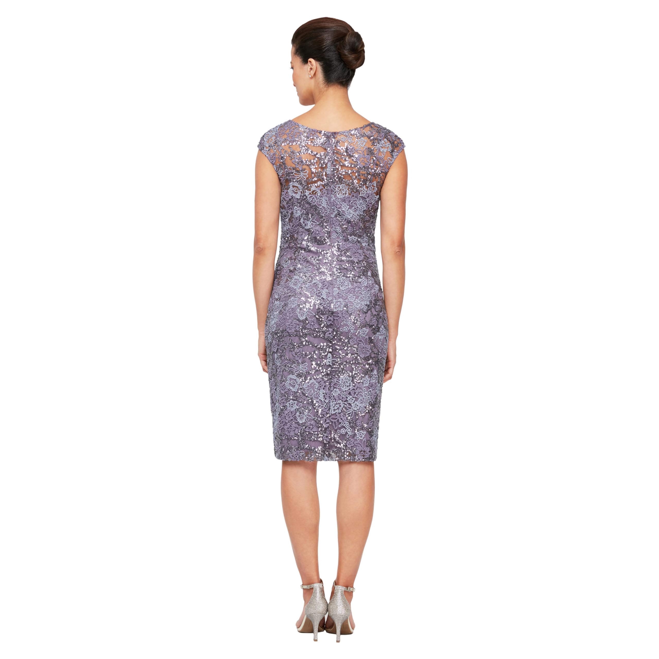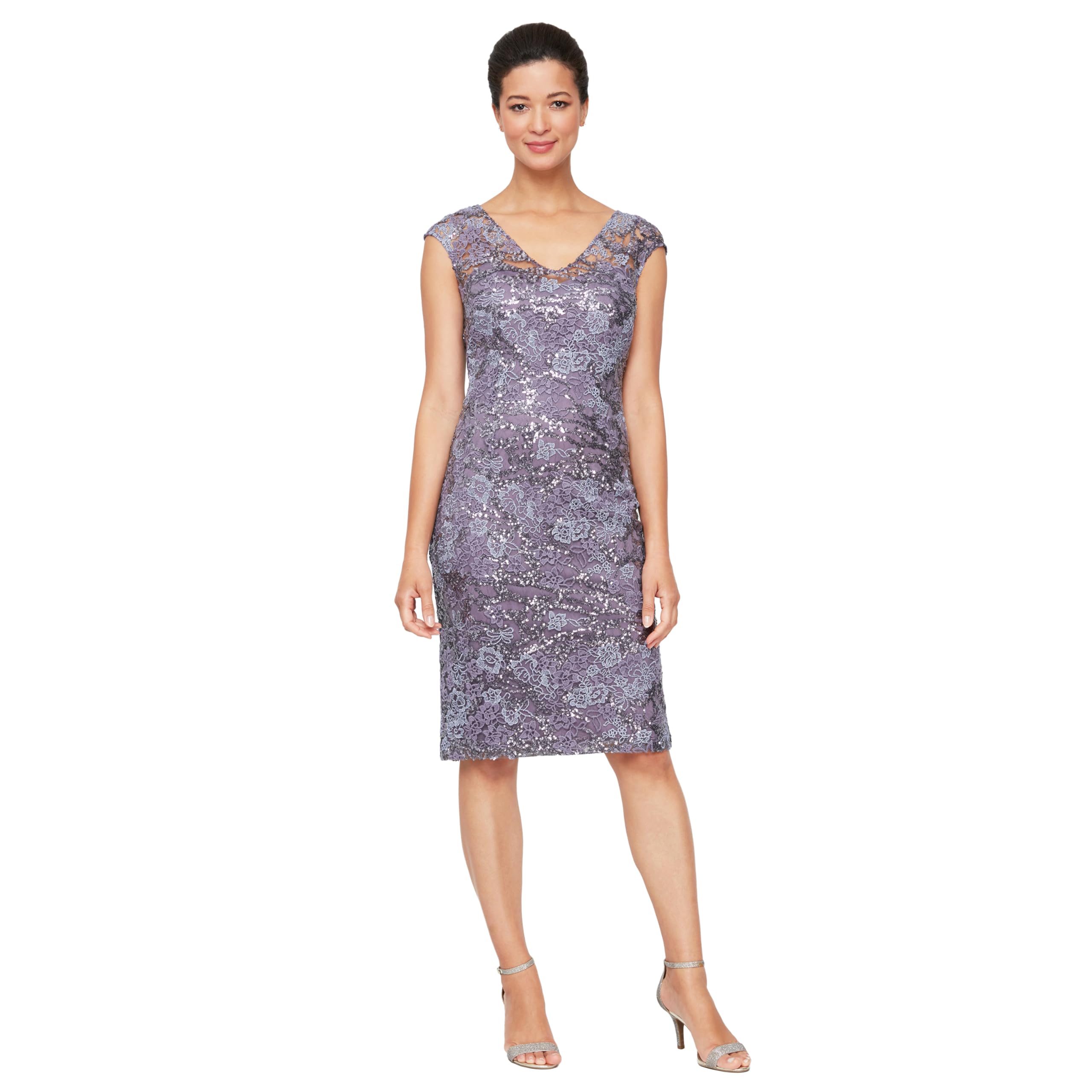 Description Elevate your style with the Alex Evenings Women’s Knee-Length Sheath Dress. Designed in all-over stretch sequin fabrication with a flattering V-neckline and cap sleeves, this dress blends comfort with timeless sophistication. Perfect for weddings, cocktail parties, or any elegant event, it offers sparkling detail in stretchy corded lace. A must-have addition to your wardrobe, delivering both class and confidence for all your special moments.