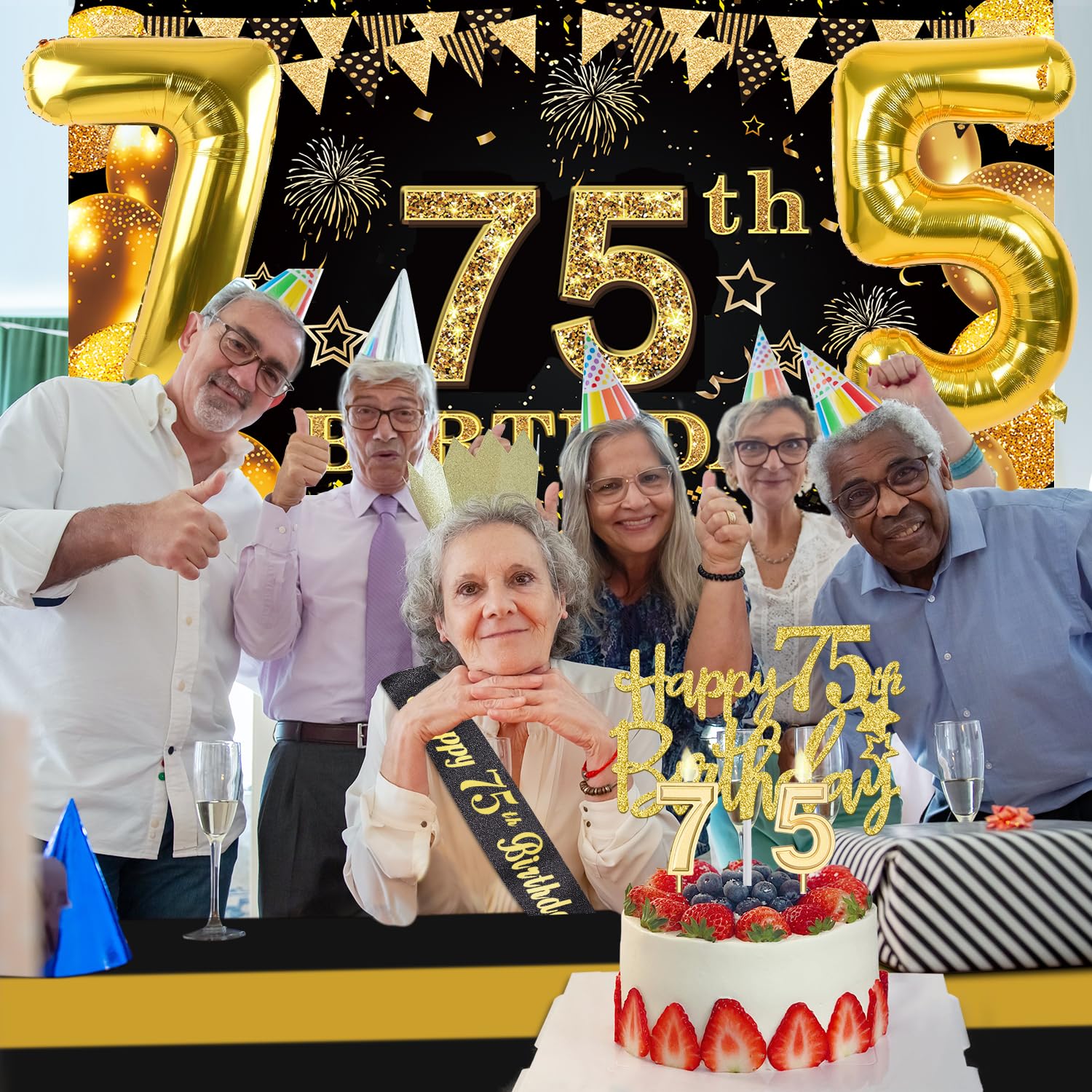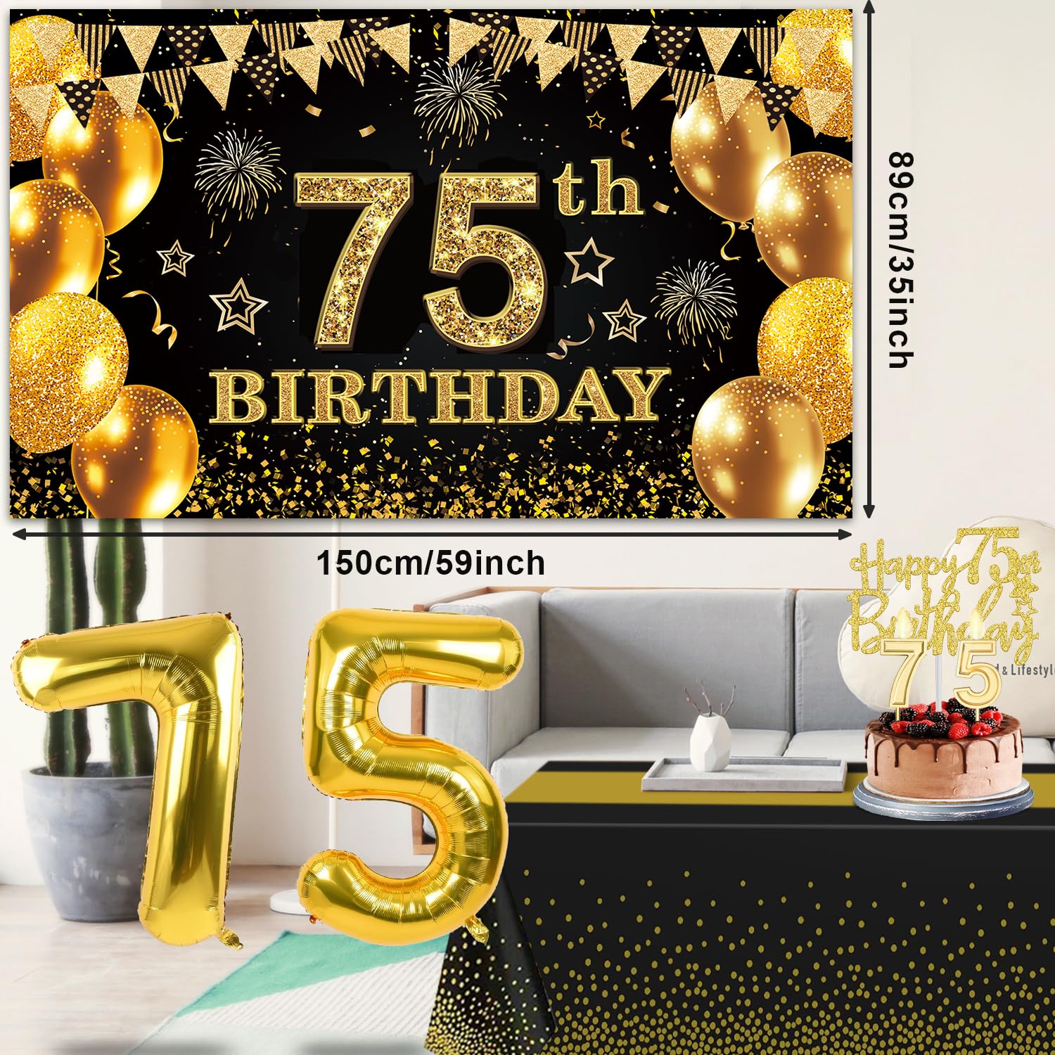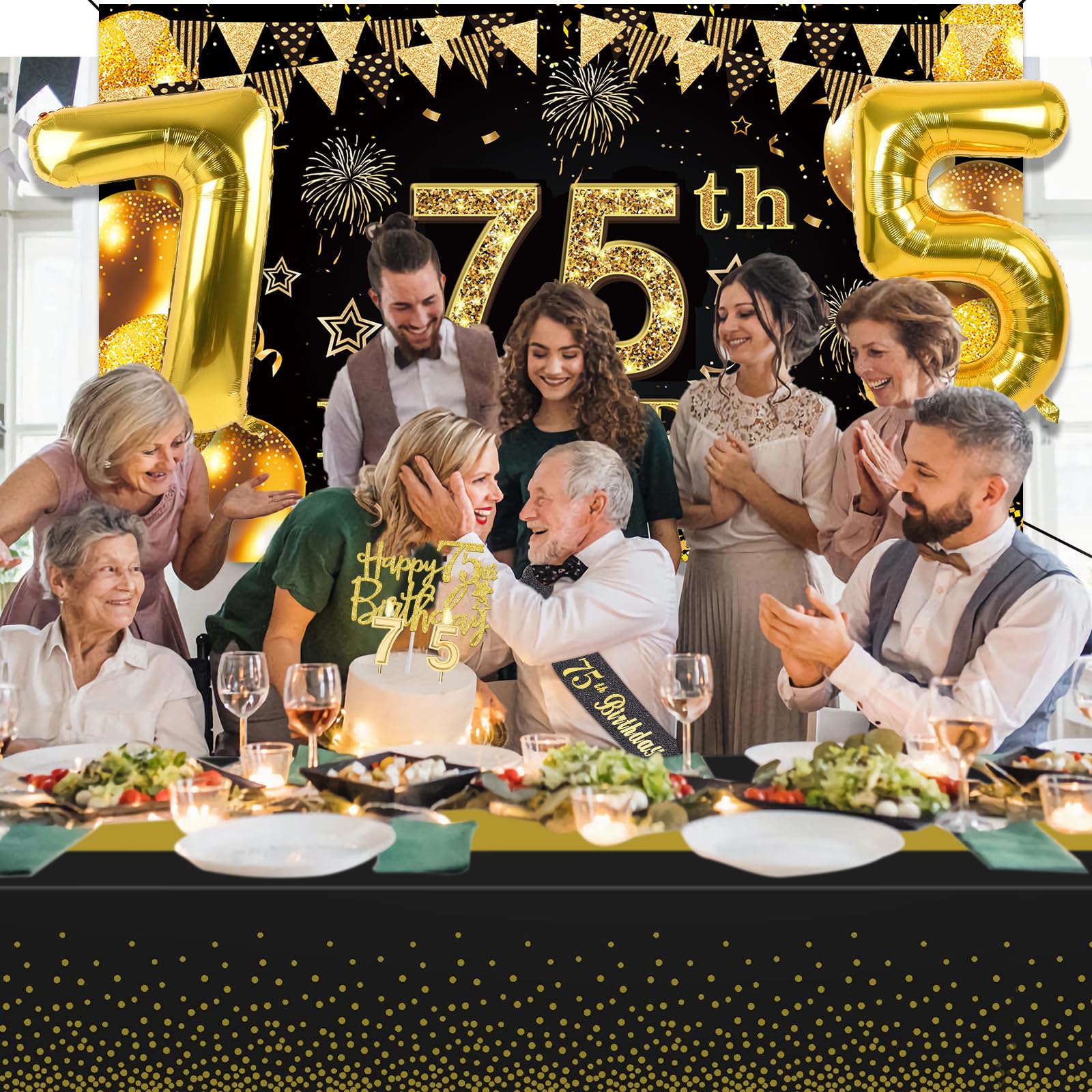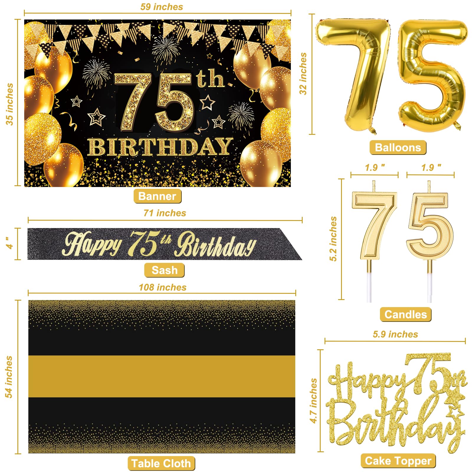 【75th Birthday Decorations Kit】: Packing coming with Large 75th Birthday Banner x 1pc, Big Gold 75th Birthday Balloons x 1set, Black and Gold Table Cloth x 1pc, Black Glittery with Gold Foil Words Happy 75th Birthday Sash x 1pc, 75th Happy Birthday Cake Topper x 1pc, Gold Number 75 Candles x 1set. This Value Black and Gold Party Decorations Set Meet Your Every Needs and Expects in 75th Birthday Milestone