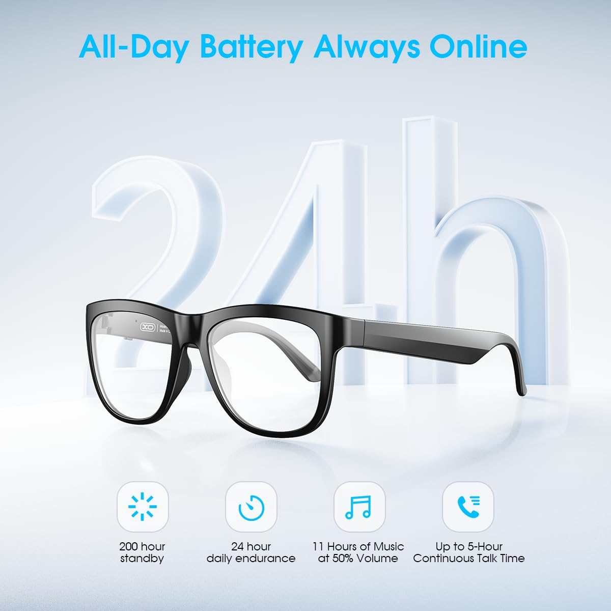 【High Quality Battery & 200H Standby】XO audio glasses are powered by high-quality batteries that take only 2 hours to fully charge and can play continuously for up to 8 hours, which is durable and safe. The standby time can reach 200h, so you don't have to charge frequently.