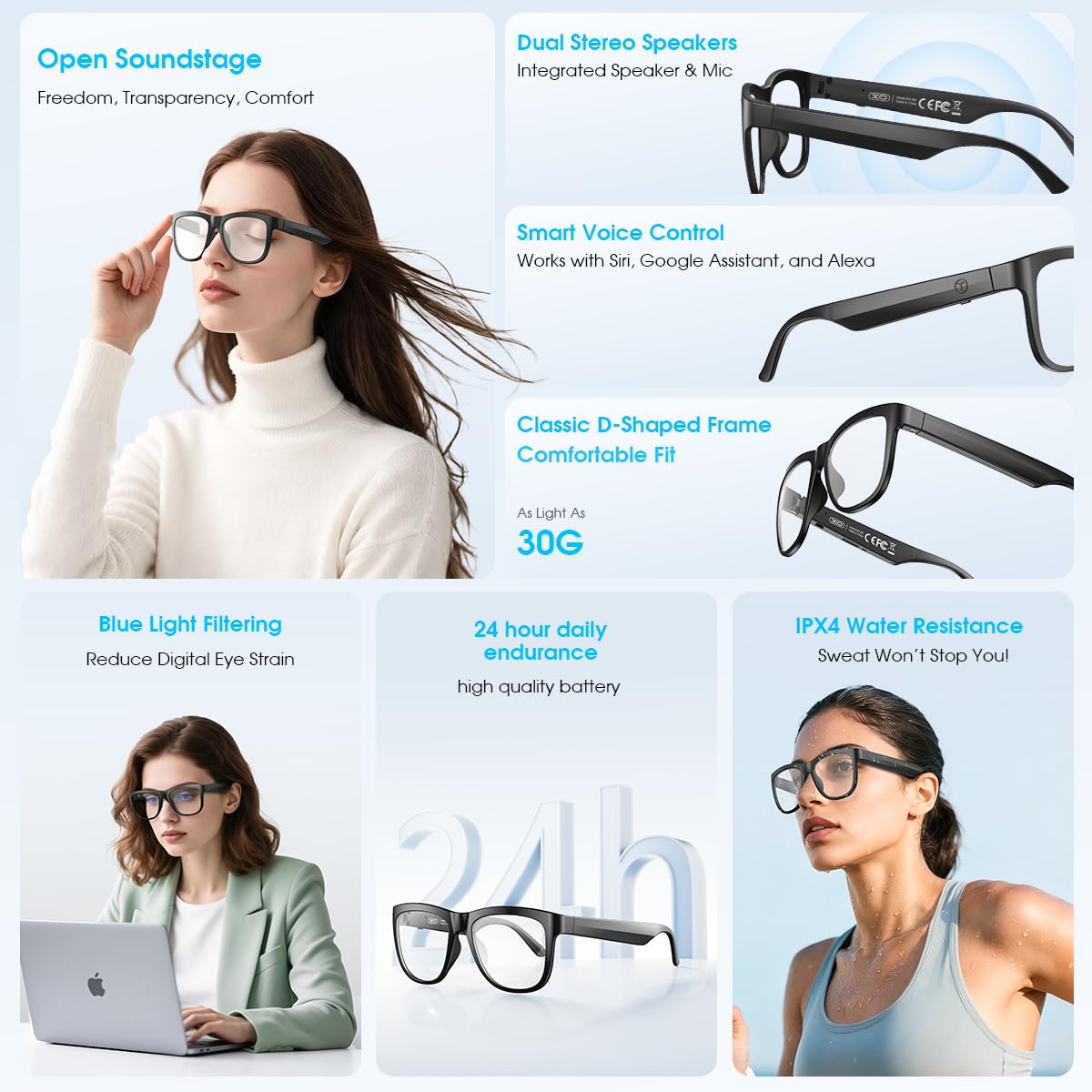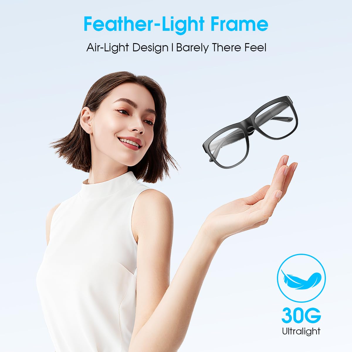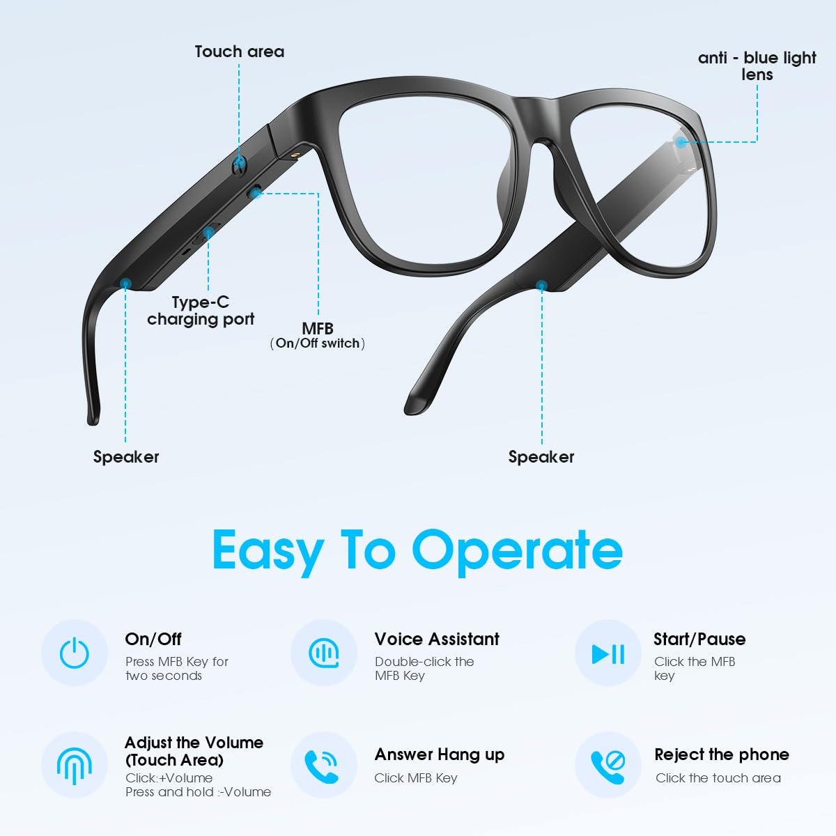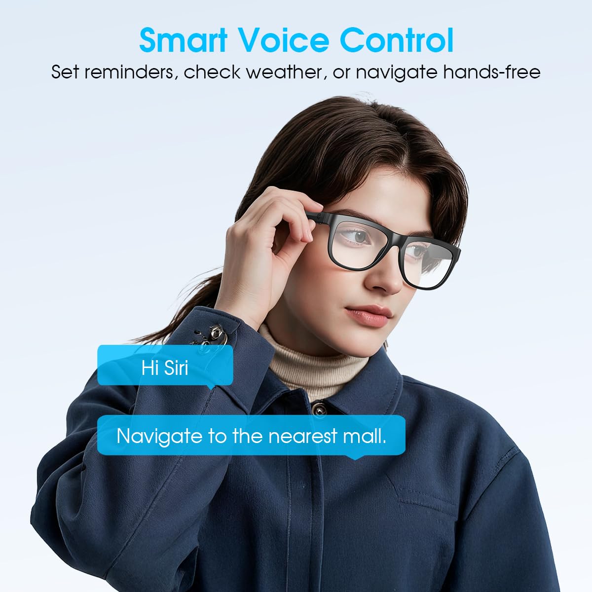 【Smart Voice Control & Easy Operation】Play or pause music, manage calls, activate voice assistant features with just one button, making your smart bluetooth glasses stylish and easy to use.