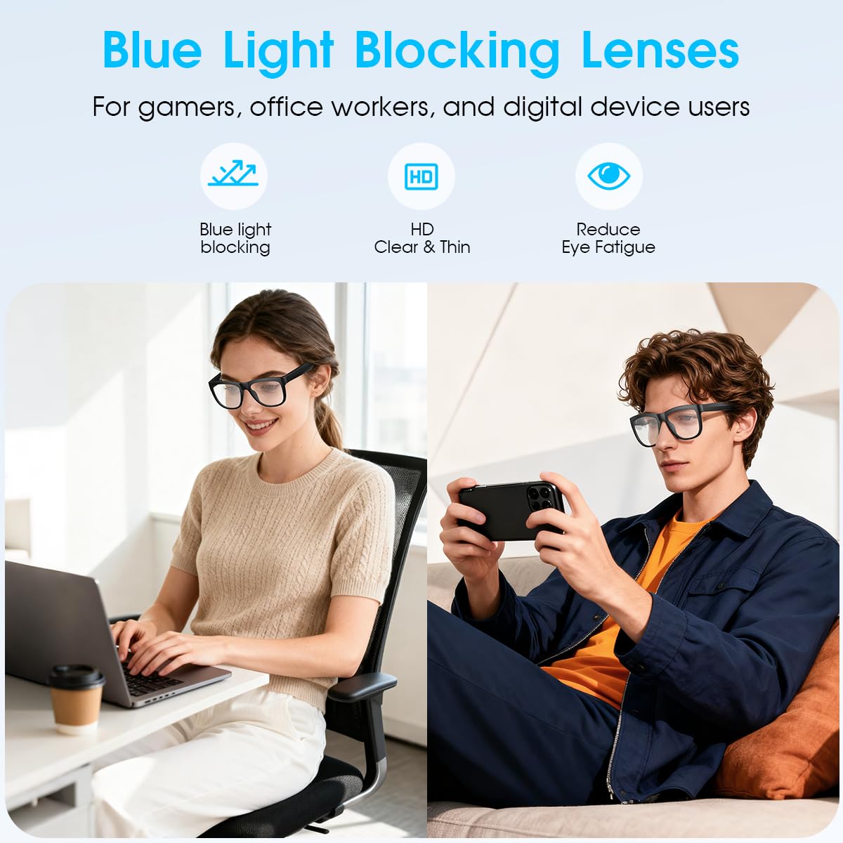 【Advanced Blue Light Filtering】Protect your eyes from digital strain with effective blue light filtering lenses. XO Anti-Blue Light Smart Glasses ideal for prolonged screen use, these glasses reduce eye fatigue, headaches, and improve sleep quality by blocking harmful blue light from computers and smartphones.