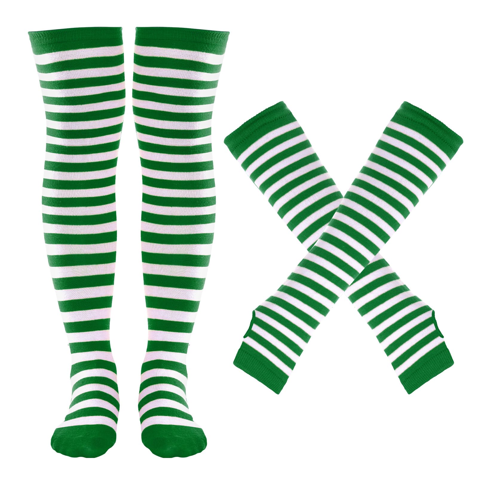 Wide Application Green and White Striped Socks and Arm Warmer:This glove and sock can be used for a wide range of occasions, whether it is daily or festive wear. Can be used for daily, Halloween dress up, Christmas gifts, holiday cosplay dress up, autumn and winter warm are very suitable. Socks and gloves are a good match, a perfect set, you don't have to buy other accessories to match.