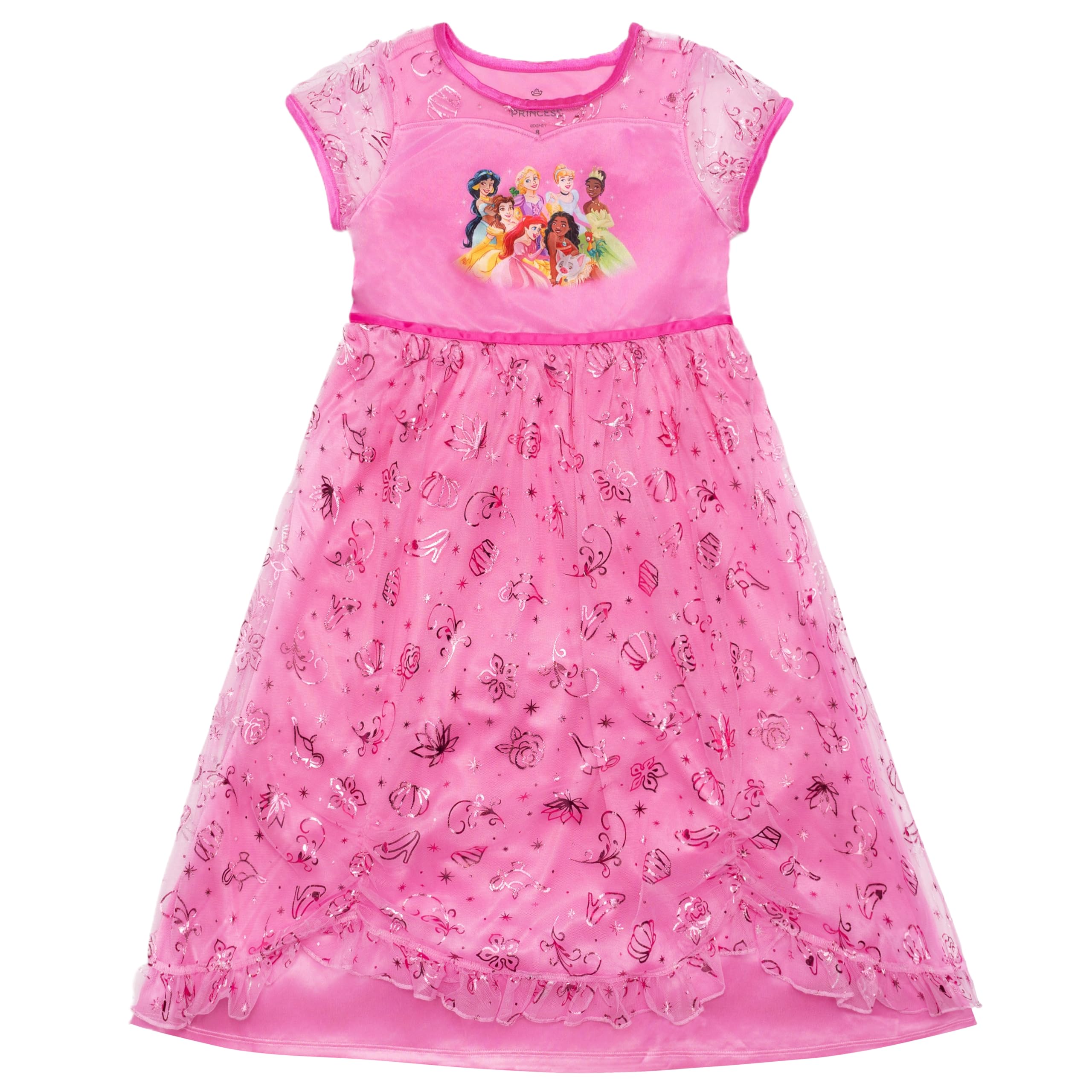 Description Send your little girl off to sleep to dream of becoming a mermaid, dancing with a prince, and going on adventures in the Disney Girlsβ Princess Fantasy nightgown. Your little one will love pretending to be their favorite Disney princess as they sleep and play in this cute, fun, and functional princess gown. Perfect for naptime or amazingly fun princess dress-up, this dress will be the new favorite gown in your girlβs pajama and dress-up clothes. Your little girl can pretend to be any Disney princess from Moana to Snow White in these adorable pajamas. Available in multiple styles and sizes 2Tβ8, each gorgeous nightgown features bright, rich colors and lovely graphics of much-beloved Disney characters. Fancy sleeves, a sparkly overlay, and ruffles make this a true princess gown. This pull-on nightshirt is made from supersoft 100% polyester and is easy to wear. A gentle-cycle wash and low-temperature tumble dry are all that is needed to keep this nightgown looking amazing. This officially licensed Disney product is made with high-quality materials and safety and comfort in mind. To ensure maximum comfort and safety, please choose the right size for your child to avoid clothing that is too long or too loose. These pajamas are manufactured in accordance with all clothing safety standards and are flame-resistant. Let your child put on these fun pajamas and live out their adventures while they sleep or play.