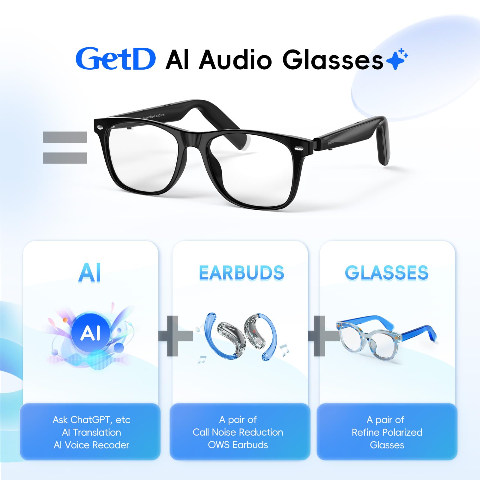 【3-IN-1 AI GLASSES】: ①Your AI Assistant powered by ChatGPT, Real-time Translation and Voice Recorder; ②A Pair of Good OWS Noise Reduction Earbuds; ③A Pair of Good Polarized Sunglasses for Men & Women