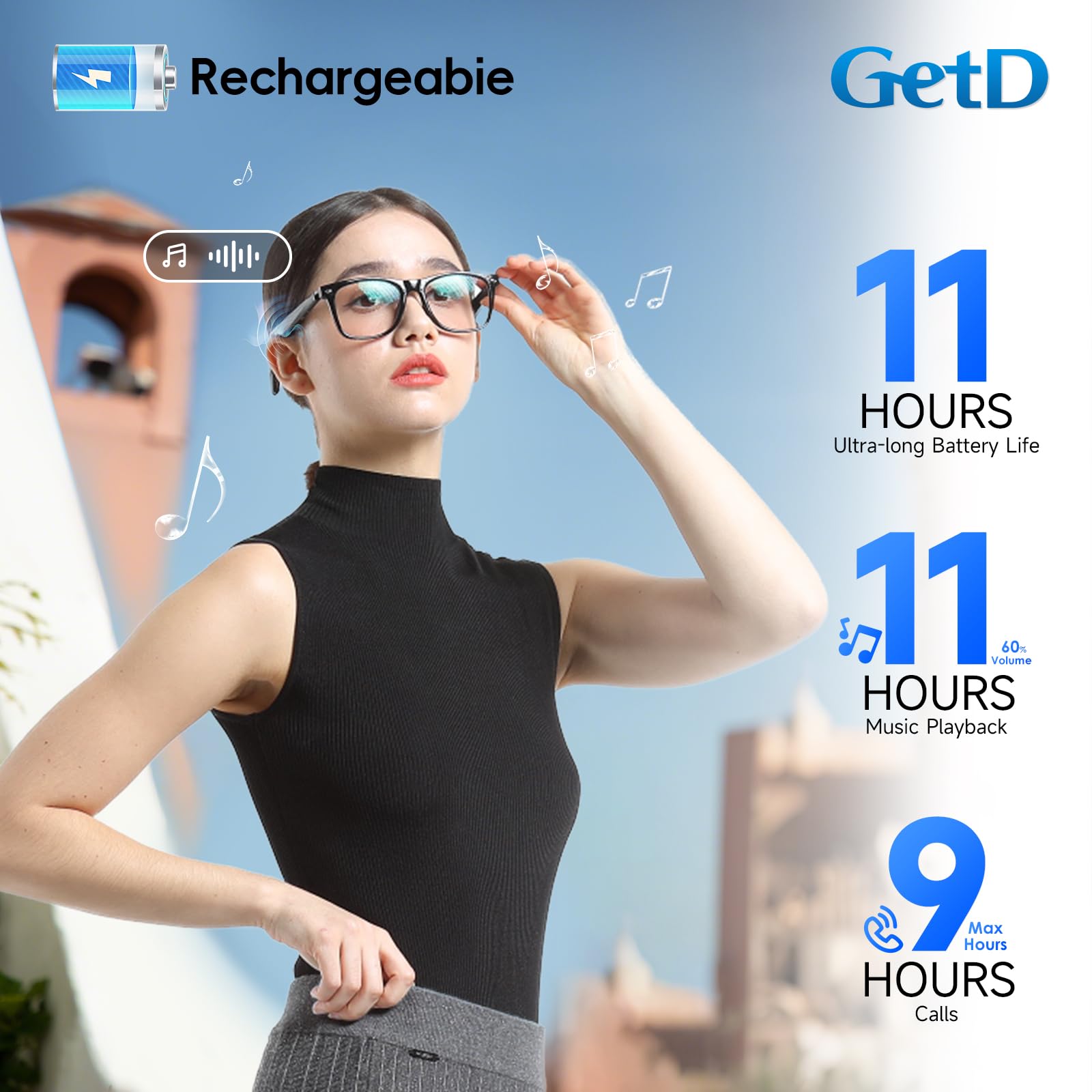 【Music & Call Glasses】: The GetD AI glasses are equipped with two 115mAh batteries. A full charge offers 15 days of standby and 11 hours listen music, 9 hours calling (at 50% volume). Charging 10 mins, 1 hour use; over-voltage and overload protection, magnetic charging and integrated design ensure IP54 water resistant. A good gift for family, friends and colleagues