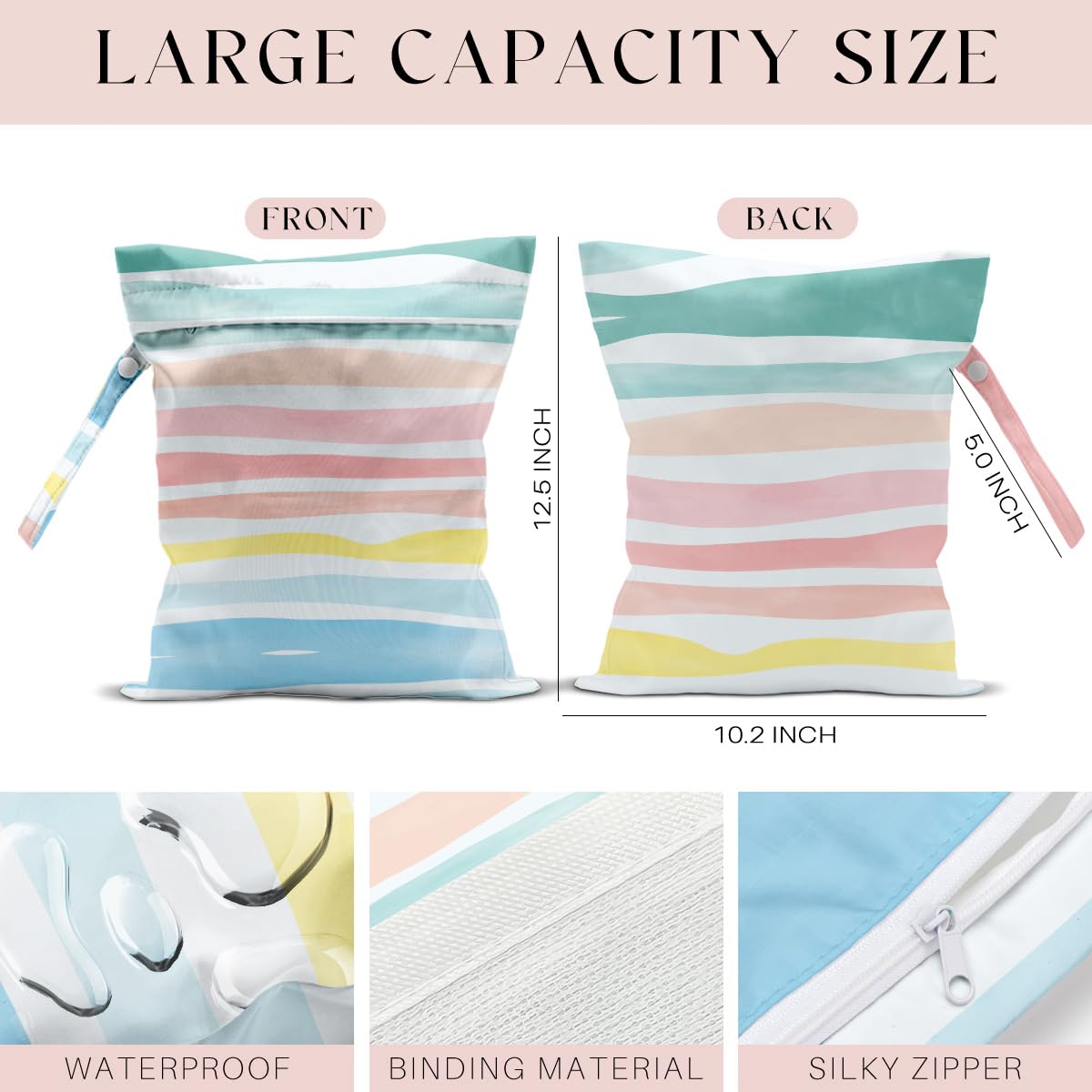 💕 MULTI-FUNCTIONAL – Our wet bags have lots of uses. They are suit for carrying wet swimsuit bag diapers, wet swimsuits and sanitary napkin, menstrual pad; not just for wet stuff - these bags make excellent organizers for toys, accessories, cosmetics, toiletries, electronics, travel and more. With a snap handle, snap your bag wherever you need it - changing,suitcase, table or tote bag.