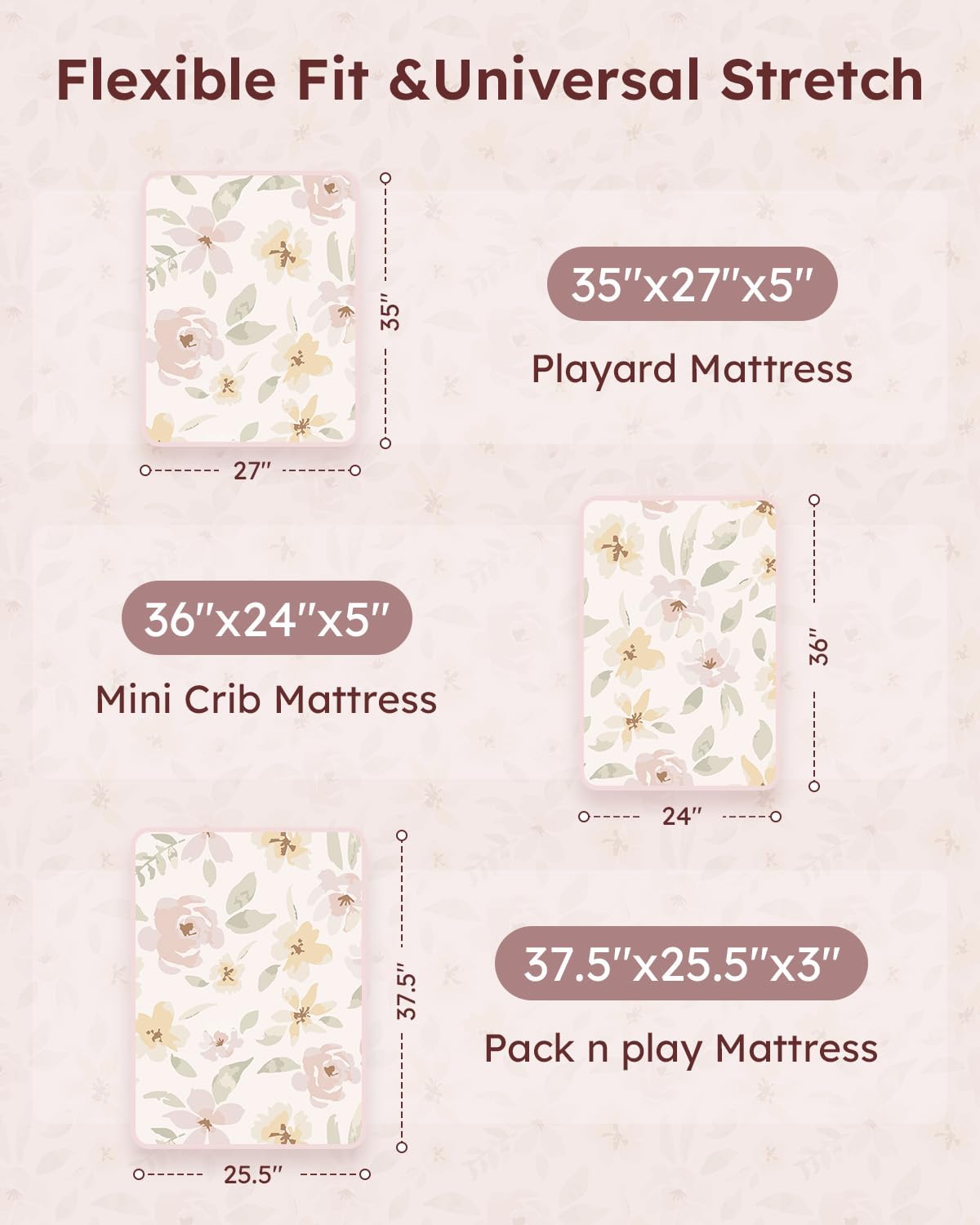 Measured 38''X 26'', our pack and play sheets securely fit pack n play crib mattress, mini crib and playard mattresses. 5-inch deep pocket offers safe and reliable 360° coverage, providing ultimate protection for your exquisite mattress.