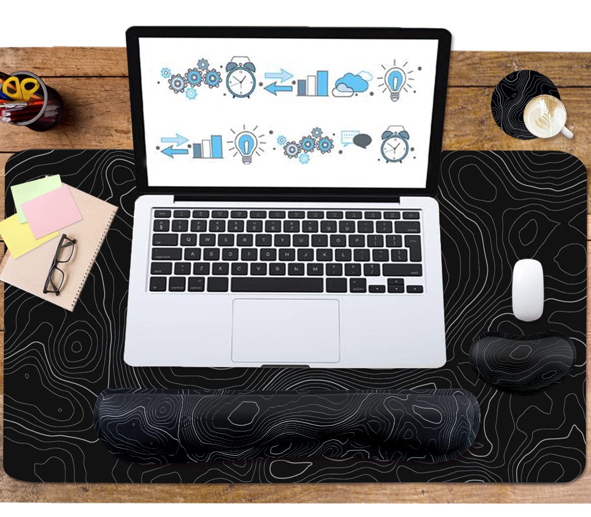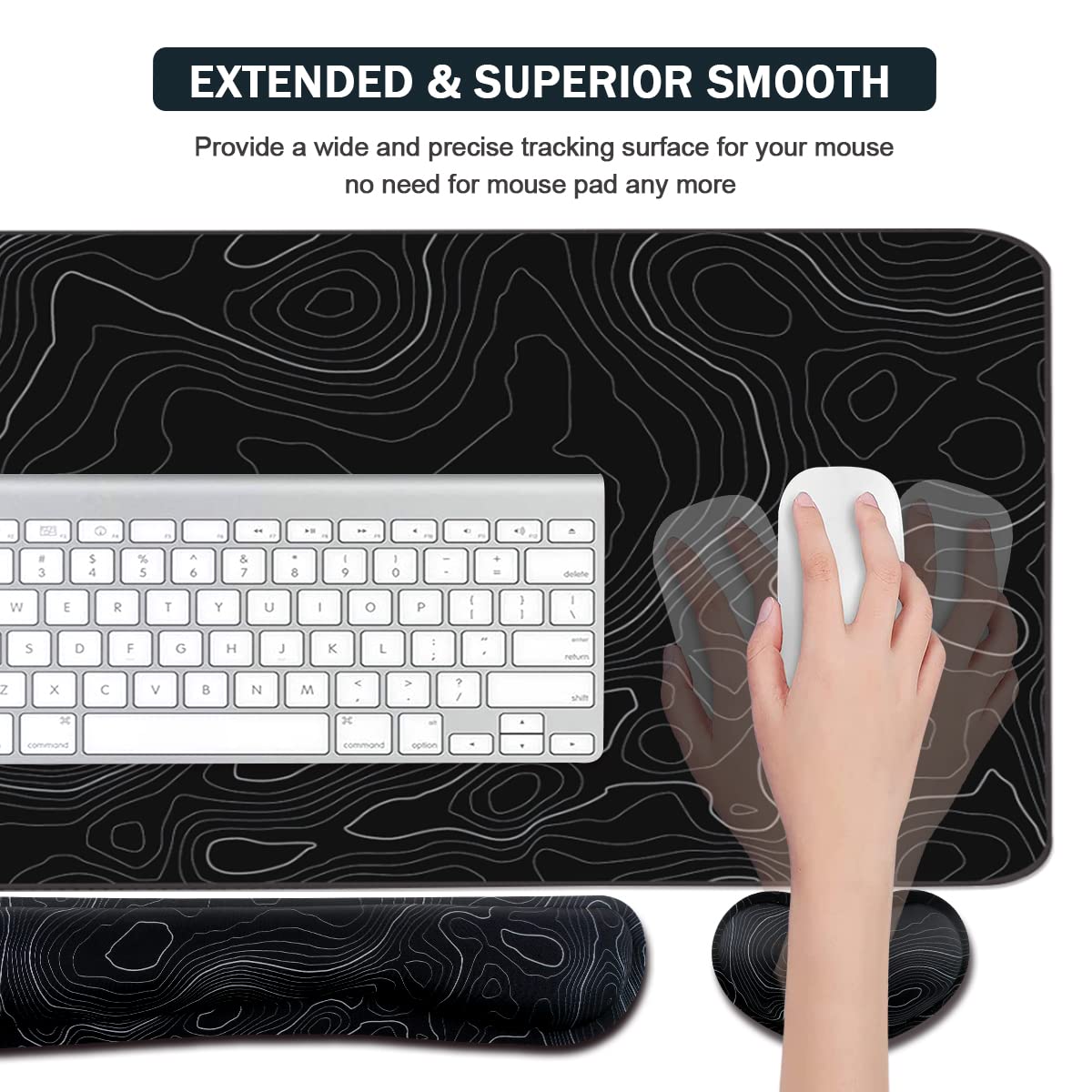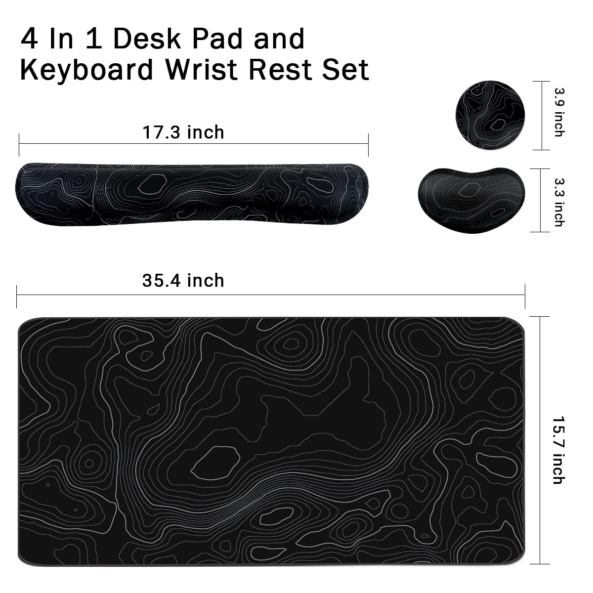 Topographic Mouse Pad Set, Extended Mouse Pad+Keyboard Wrist Rest Support, Memory Foam Ergonomic Easy Typing Pain Relief, 4Pcs (35.4×15.7 in) Desk Pad Set for Home Office Study Game-Topographic Contour