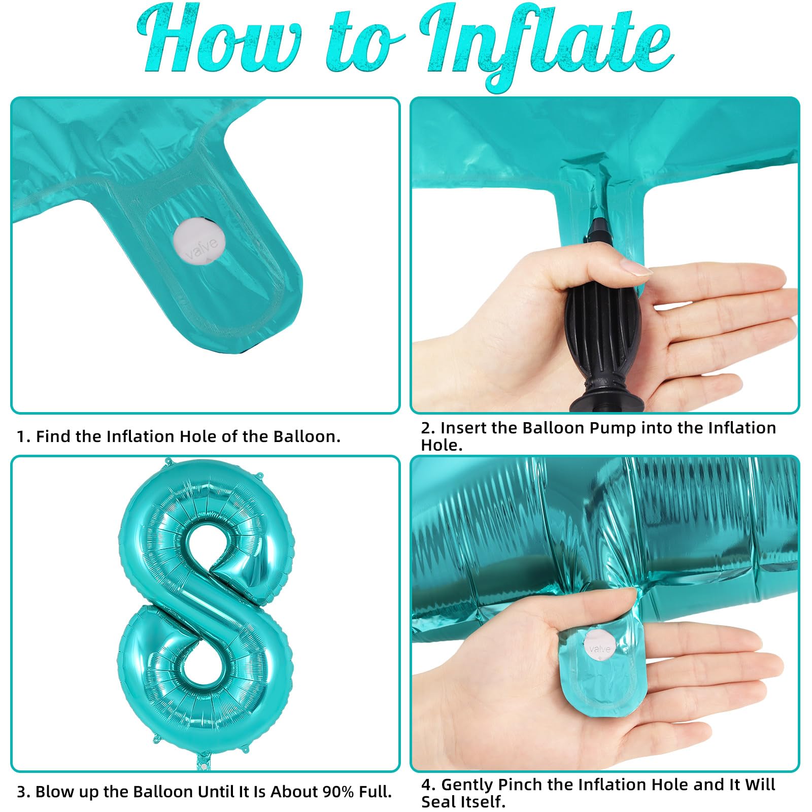 EASY TO USE: Inflate the balloon with air or helium by a balloon pump; pinch the inflation valve gently; then a big beautiful teal 8 balloon is there for you. So easy to do it!