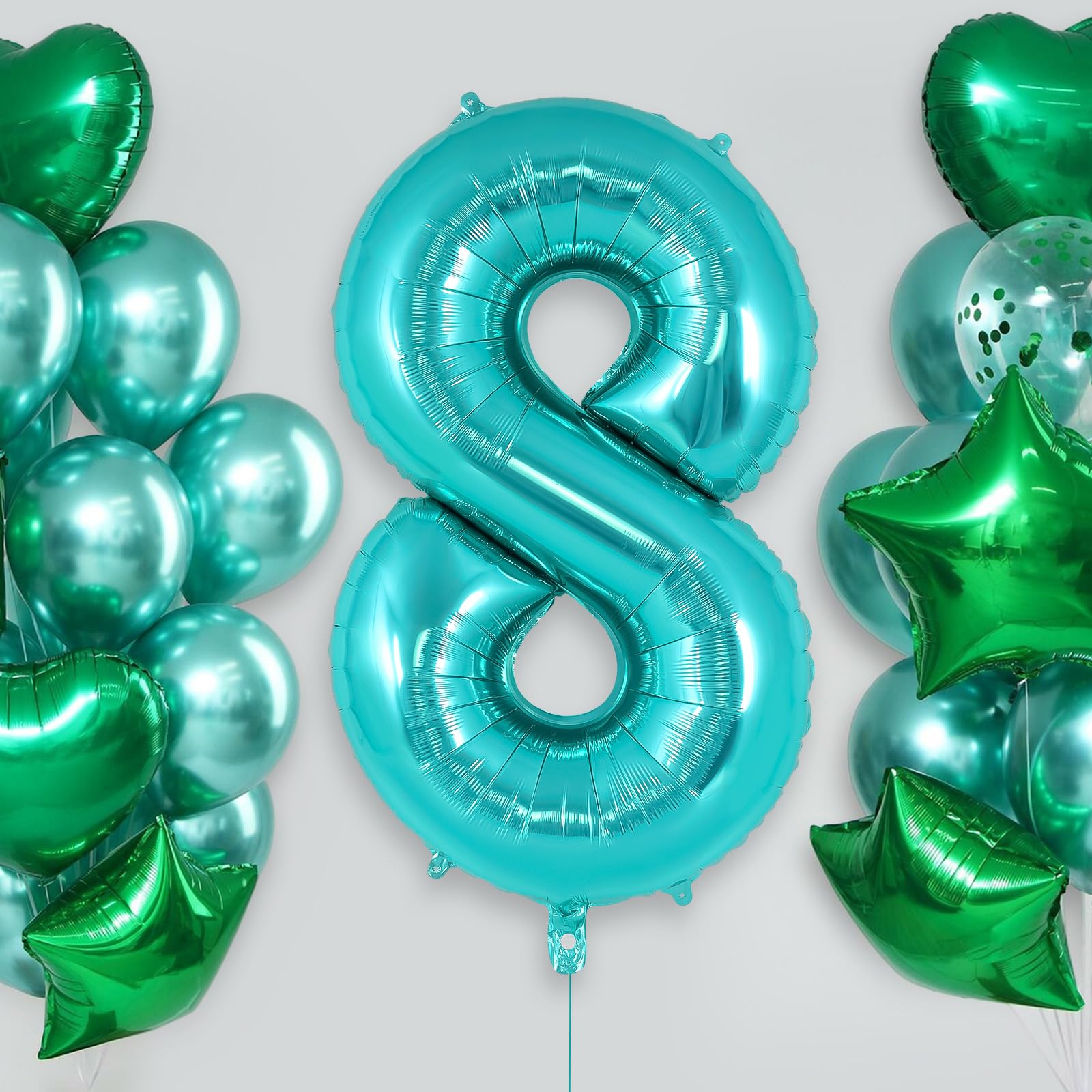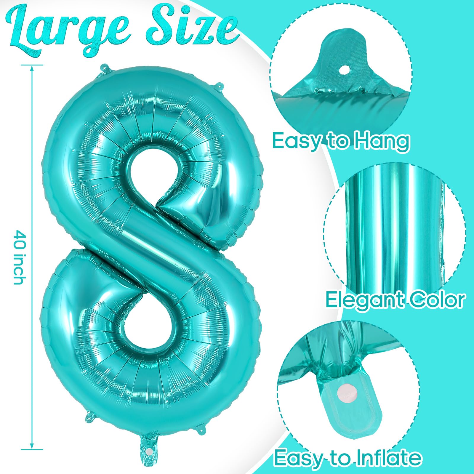 PACKAGE CONTAINS: 1 piece of teal number 8 balloon, measures around 40 inch long. The balloon has 2 loops on top and 2 on the bottom. Pretty color and giant size makes it really eye-catching.