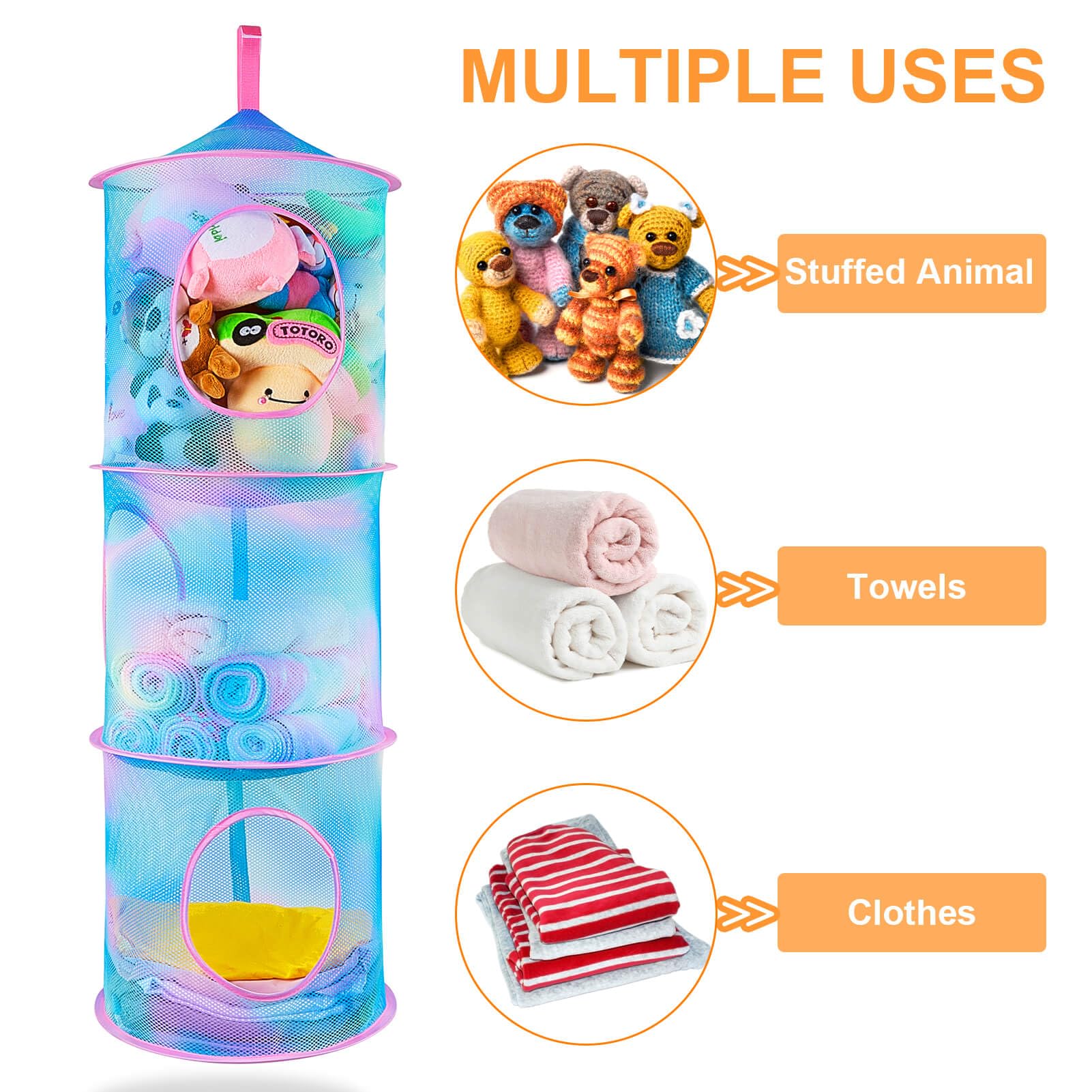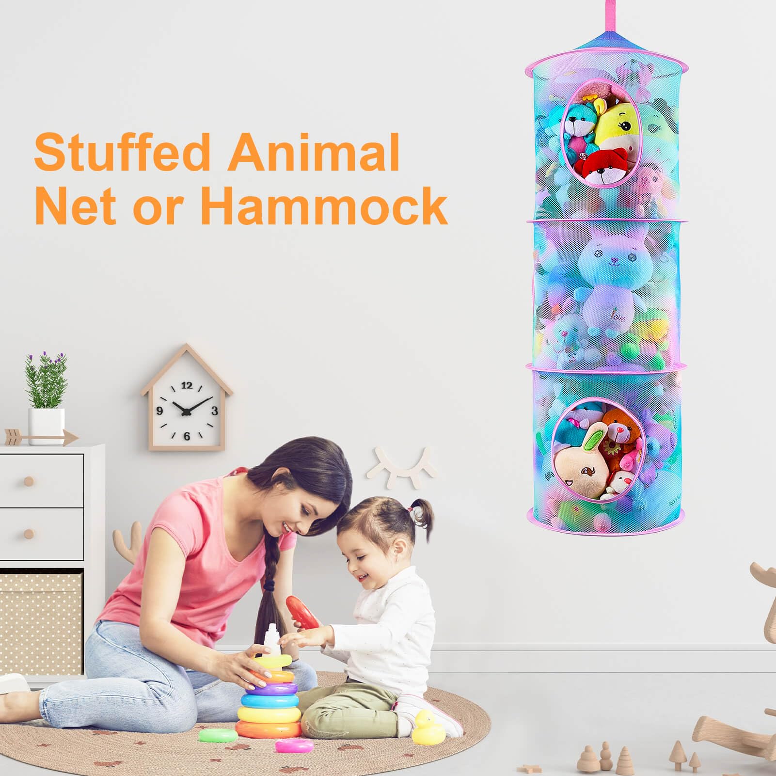 Stuffed Animals Storage: Creative collapsible design and customized unique colors, hanging use and maximizes utilization of standing space, different direction for putting items, convenient to use, easy fold when not use, saving space