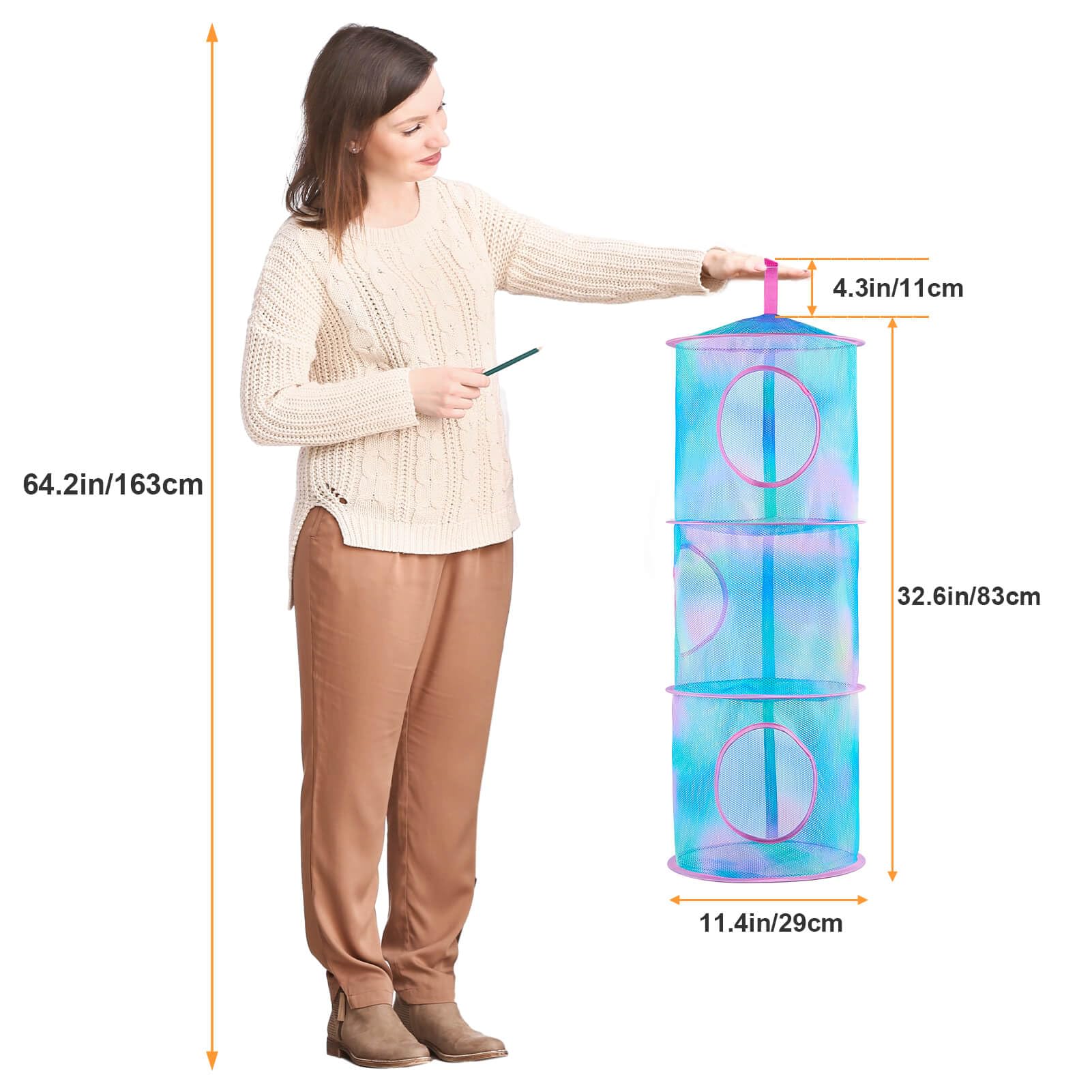 Size and Package: Stuffed animals organizer holder 3 tiers size is 11.4 " x 11.4 " x 32.6 ", 4 tiers size is 11.4 " x 11.4 " x 43.3 ", 5 tiers size is 11.4 " x 11.4 " x 55 ", top with wide loop, easy to open and close, for hanging; No special installation is required, and hanging it on a hook or a closet at will, the package contains 2 pcs of stuffed animals storage