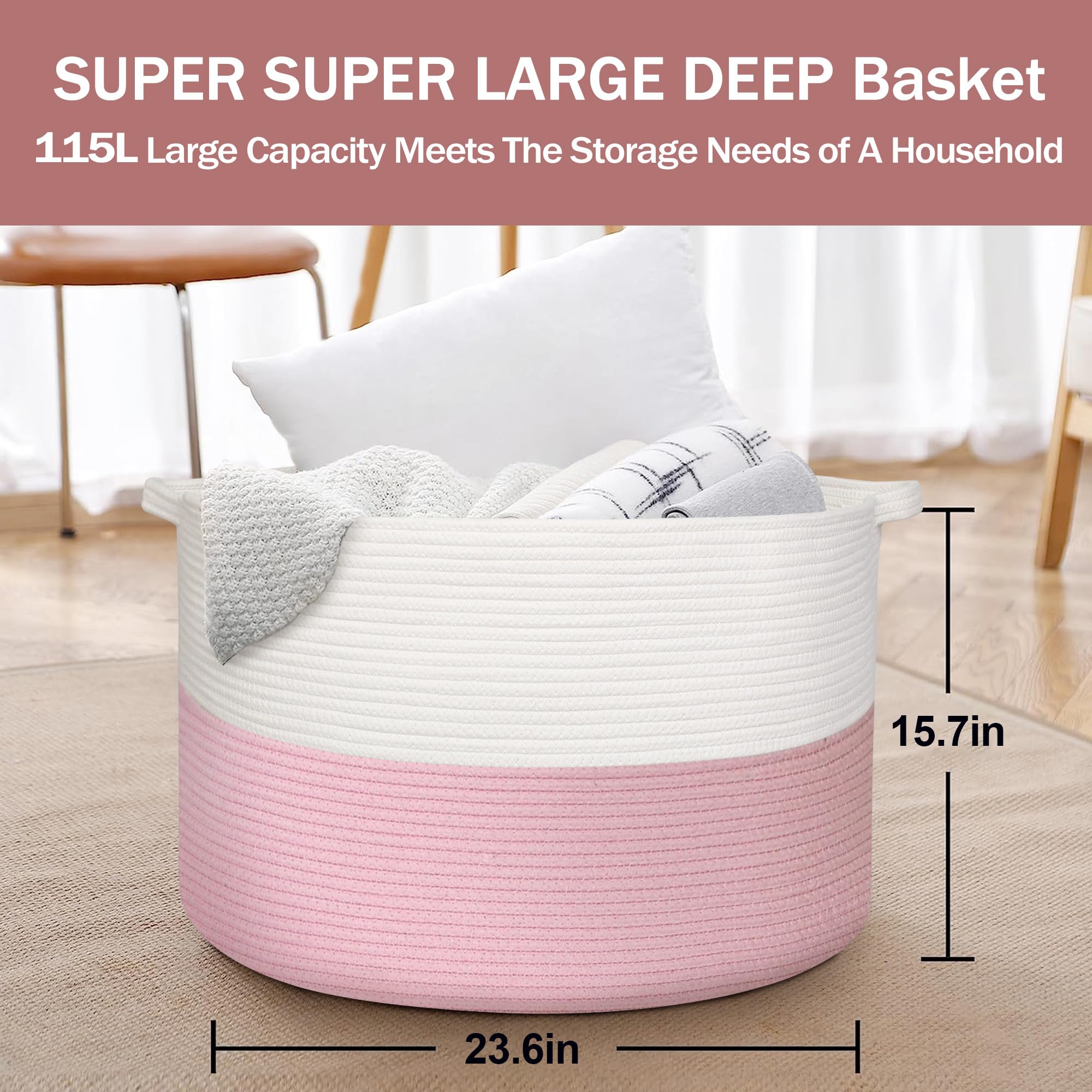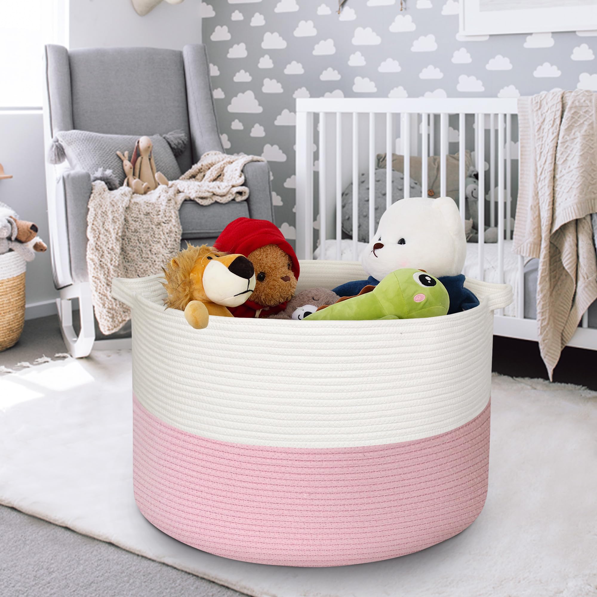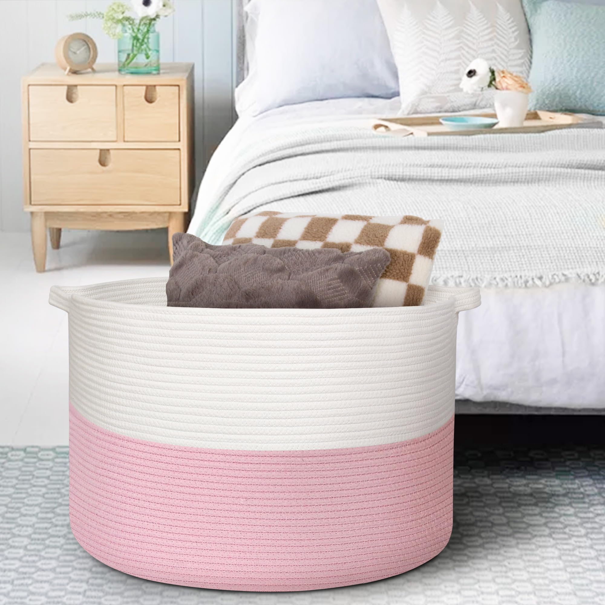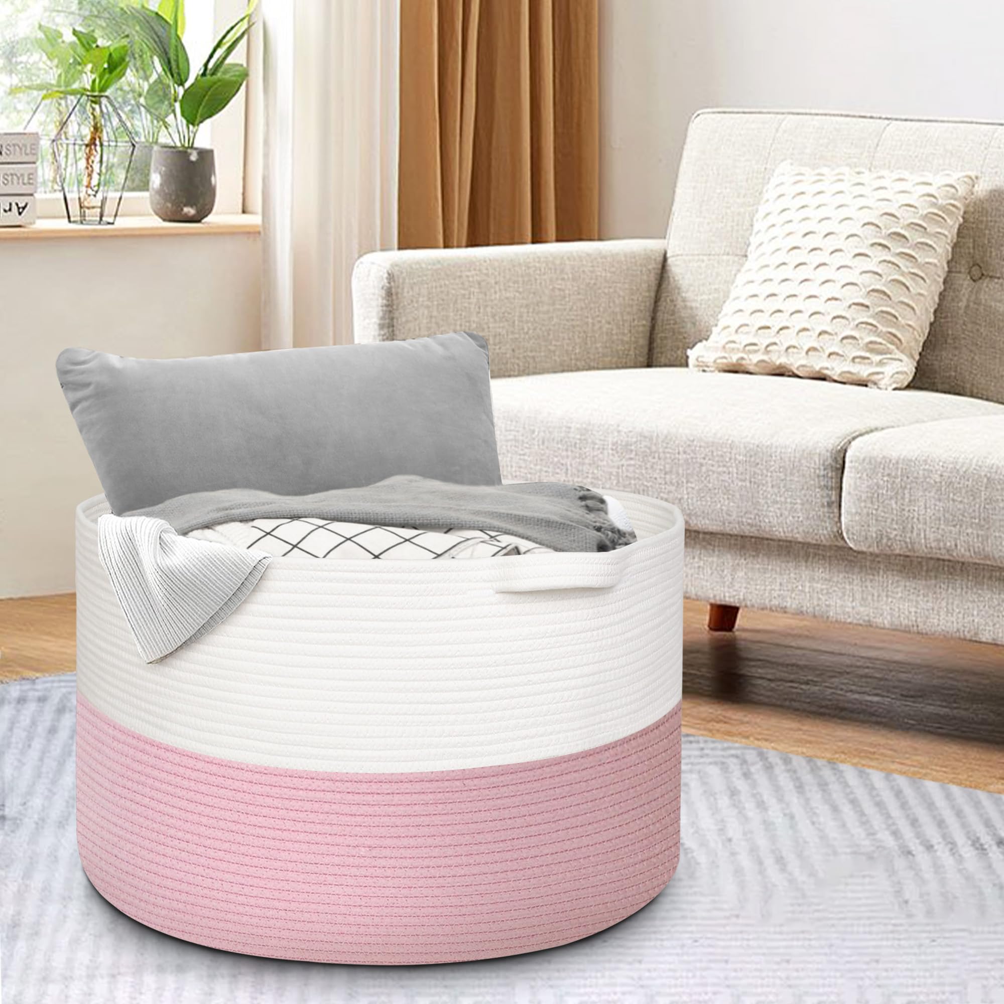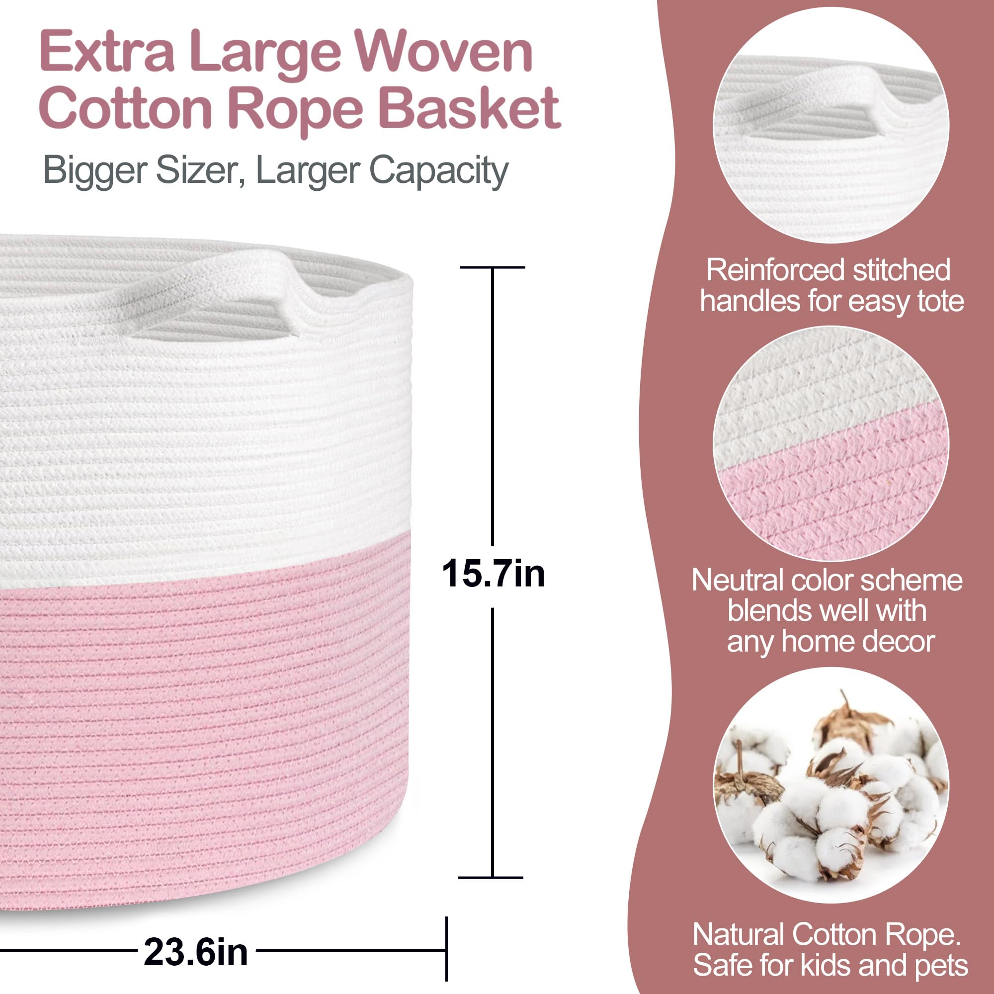 Cotton Rope Living Room Storage: The pink basket is made of hand natural cotton rope. Sturdy rope storage baskets can withstand weight and regular use without wear and tear. Rope material is soft and safe for baby, kids and even pets like doggy and cat. The lg 3x opened rope baskets for organizing has no chemical odor and sharp edges, so it will not harm the floor and the kids.