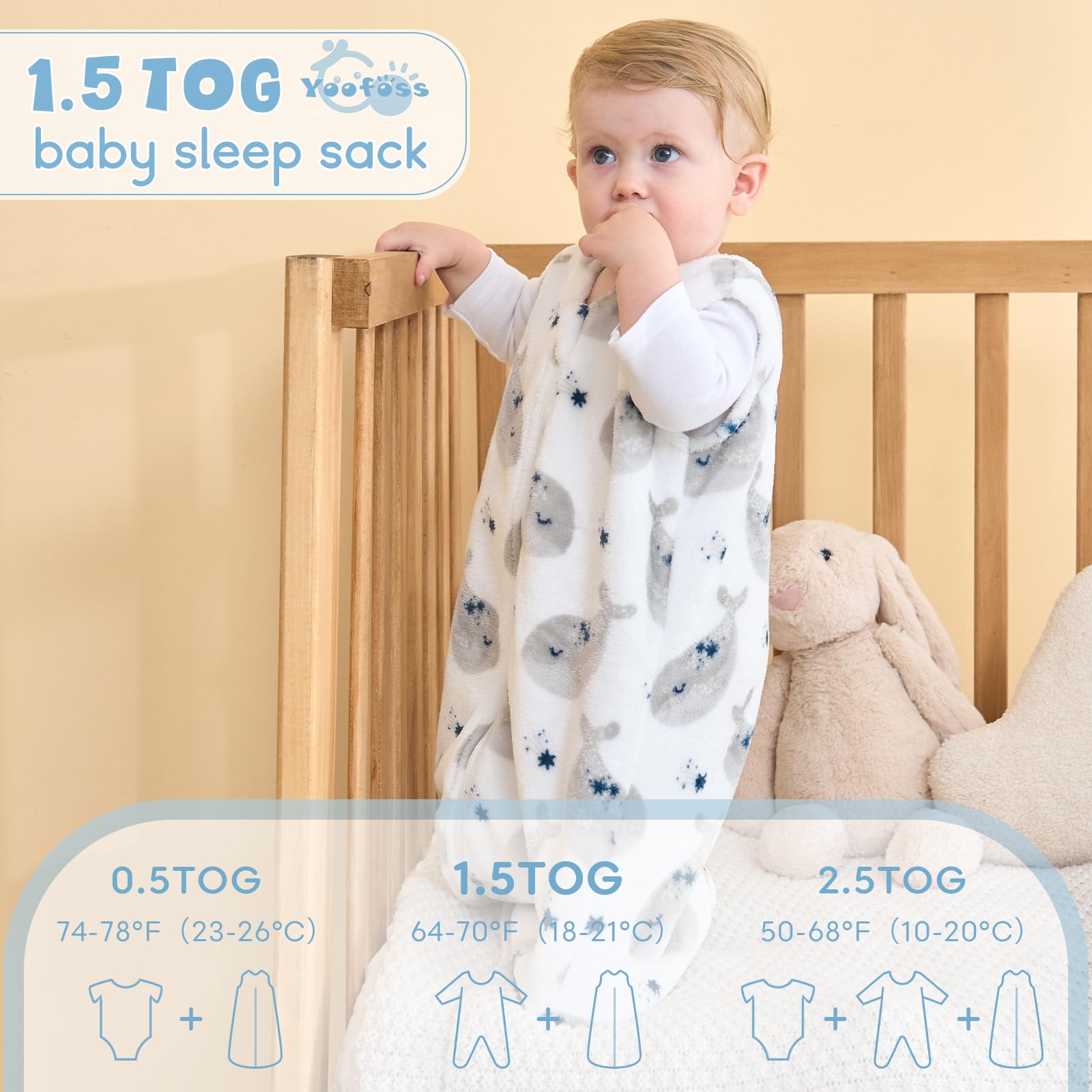 Yoofoss baby sleep sacks made of fleece,soft and smooth, create warmth and cozy embrace for baby. Fleece sleep sack 1.5 Tog is suiable for moderate temperatures from 69 to 73°F as an ideal option for autumn, early winter and spring or taking a nap in air-conditioned rooms during the summer.