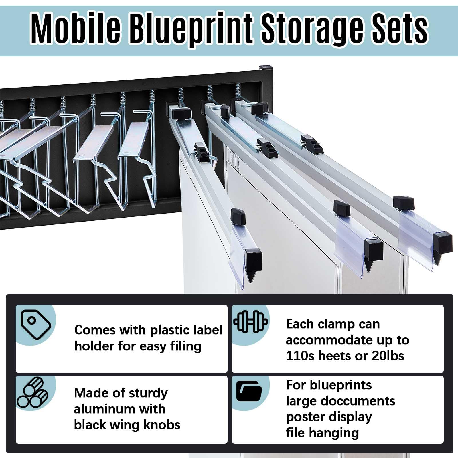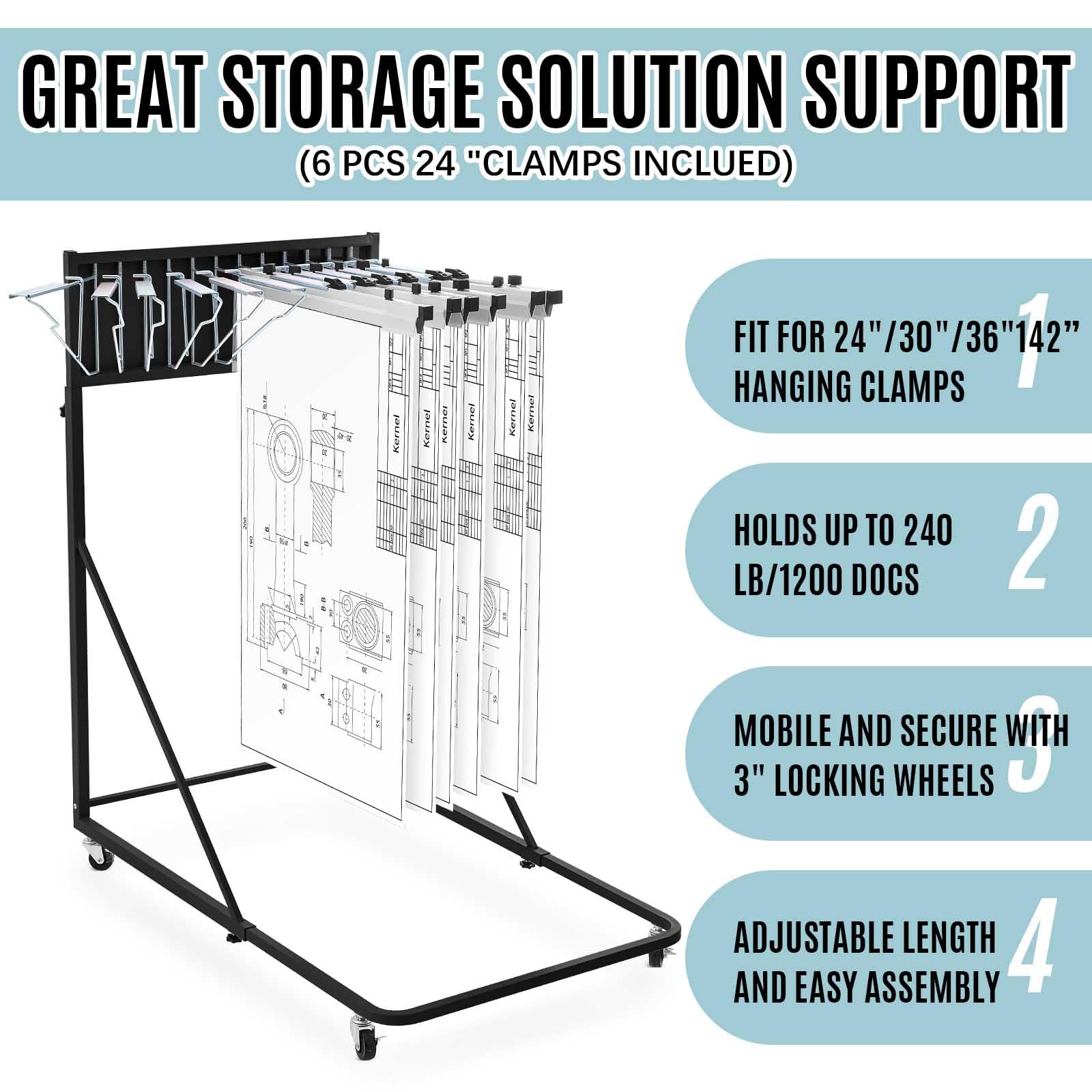 Ample Storage Size: with hanging clamps that are 24 inches in size and width adjustment capabilities of blue print storage organizer that range from 28.5-46.5 inches, it brings extended storage convenience to your space; The height adjustment features from 48-66 inches allow for easy customizability to cater to various document sizes, and can hold up to 12 clamps, these make our mobile blueprint storage rack the ideal document organization solution