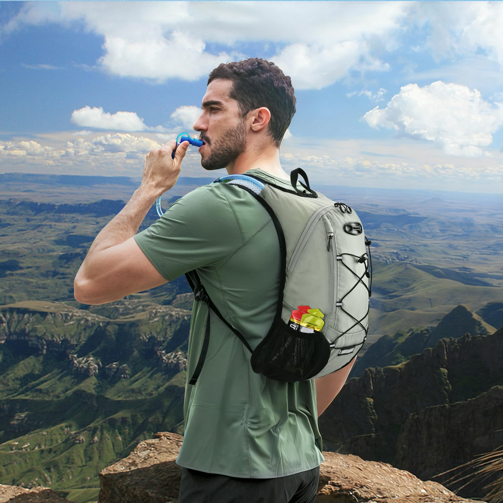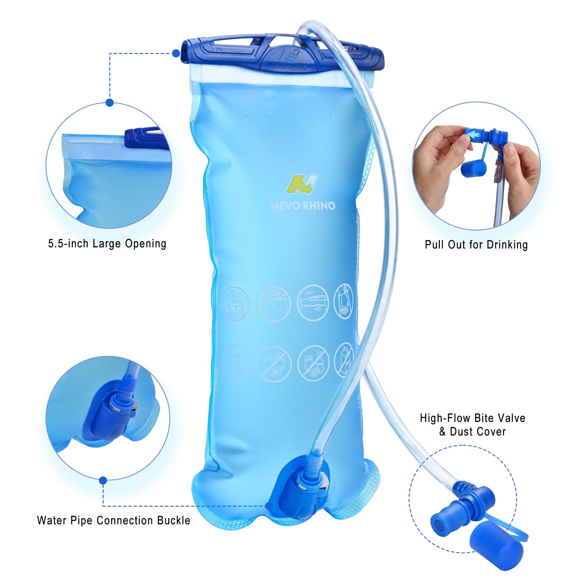 【Leakproof & Anti-popping Water Bladder】: Water backpack for hiking with 2 L bladder, BPA-free, food-grade PEVA material, and hose clamp. Leakproof bite value, water flows fast and never drips on when locked