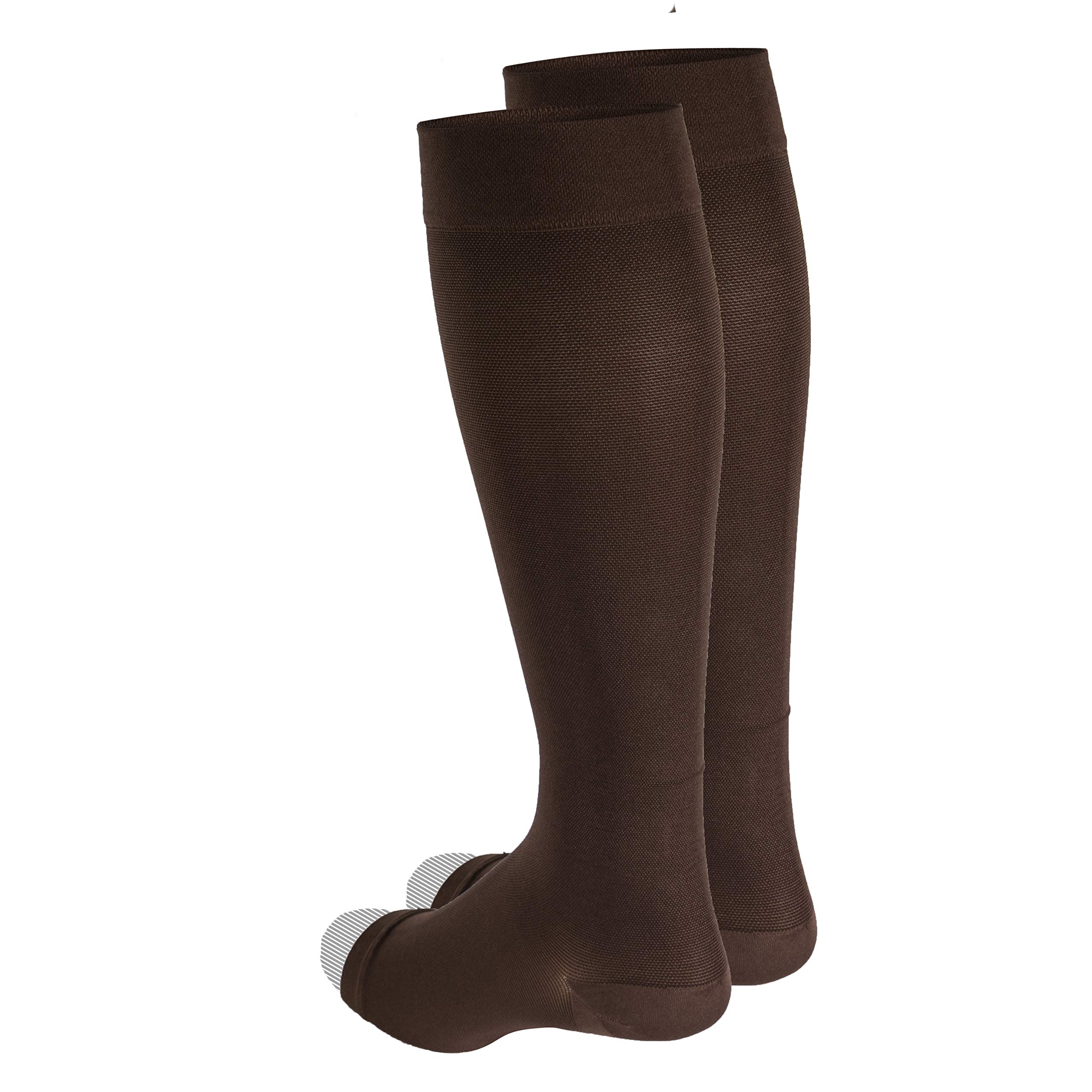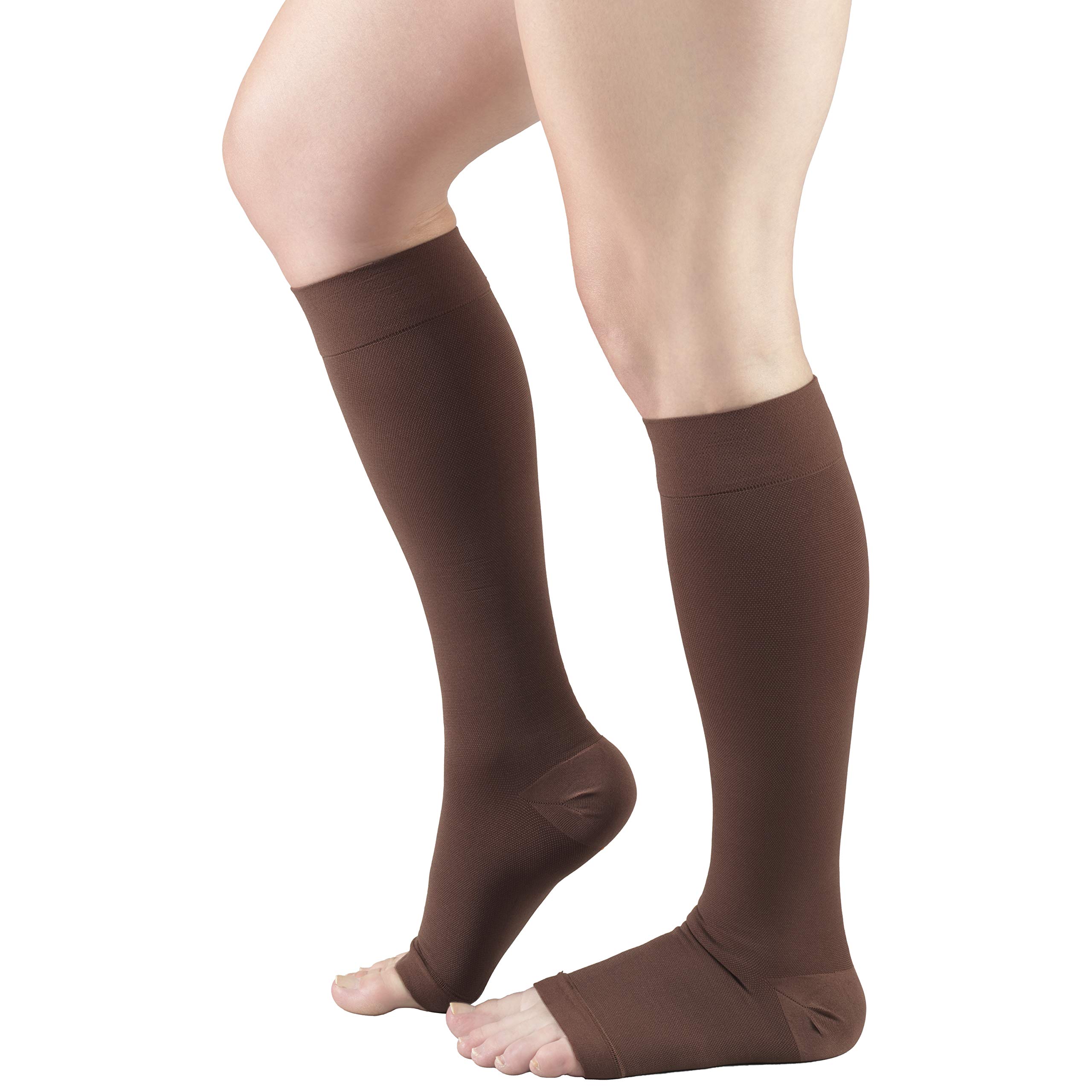 Product Description Truform 0865 was created to help relieve conditions associated with poor circulation. Graduated compression technology delivers a compressive action to the leg that is greatest at the ankle, then gradually decreases toward the heart. The 20-30 mmHg Firm compression level is great for post surgery and severe edema, varicose veins, spider veins, hypotension, post thrombotic syndrome (PTS), post sclerotherapy, and more. Truform therapeutic medical stockings feature classic styling and a smooth knit fabric that helps conceal unsightly conditions. The open toe feature allows for easy toe inspection and permits one standard size to fit a variety of foot dimensions. Color options are basic neutrals for all-occasion wear. Truform stockings, socks and pantyhose feature Graduated Compression Technology, which delivers a compressive action to the leg that is greatest at the ankle, then gradually decreases toward the heart. Graduated compression provides two primary benefits: it helps reduce and prevent swelling for the wearer, and the compression action help to prevent the slowing of blood flow so it can flow more quickly up the leg back toward the heart. Truform graduated compression support hosiery helps maintain positive circulation and leg health. We take the extra time and effort necessary to insure a therapeutically effective, comfortable fit. The combination of state-of-the-art materials and equipment, plus knitting know-how sets Truform apart from the crowd to make your legs look and feel great. Choose short length size when length from heel at floor to back bend of knee measures less than 15 inches. Manufacturer Contact Information 3960 Rosslyn Dr, Cincinnati, OH 45209