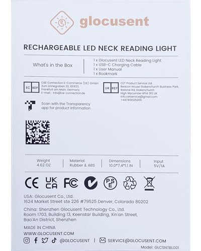 [Excellent Service & Superior Guarantee] Glocusent products undergo rigorous quality control processes to ensure product quality. Our Customer Experience Team is available at your fingertips 24/7 for anything you need! We promise: 1. 30-day return service and a 24-month warranty. 2. Original patented design. 3. FCC, CE, RoHS, PSE & C-TICK certified. 4. Contains Glocusent Original LED Neck Reading Light, Charging Cable, User Manual, Bookmark (No adapter).