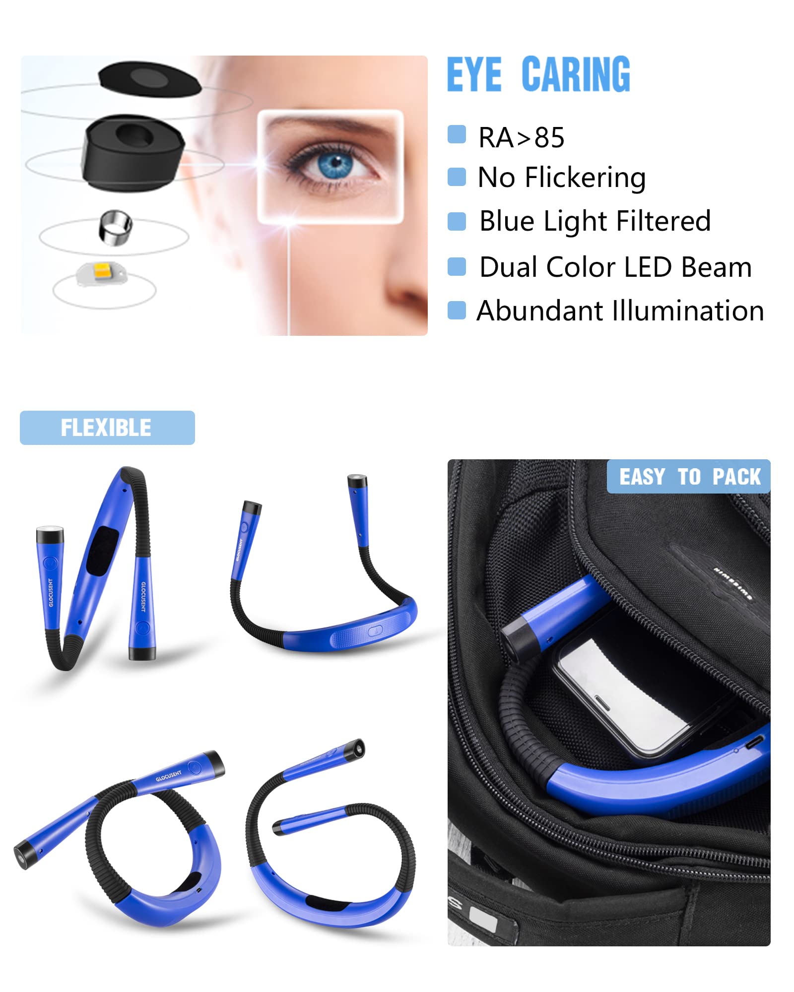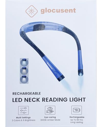 [Eye Caring & Ergonomic Design] Blue light filter and no flickering design by the advanced LED beads of the Glocusent reading light. Compared with other reading lights for books in bed, you feel no more eye strain with the Glocusent book light. The arms of the reading light around your neck are supple and adjustable so you can get the angle most comfortable for you. This around the neck reading light is ergonomically designed, it is an exceptional handsfree neck lamp for reading!