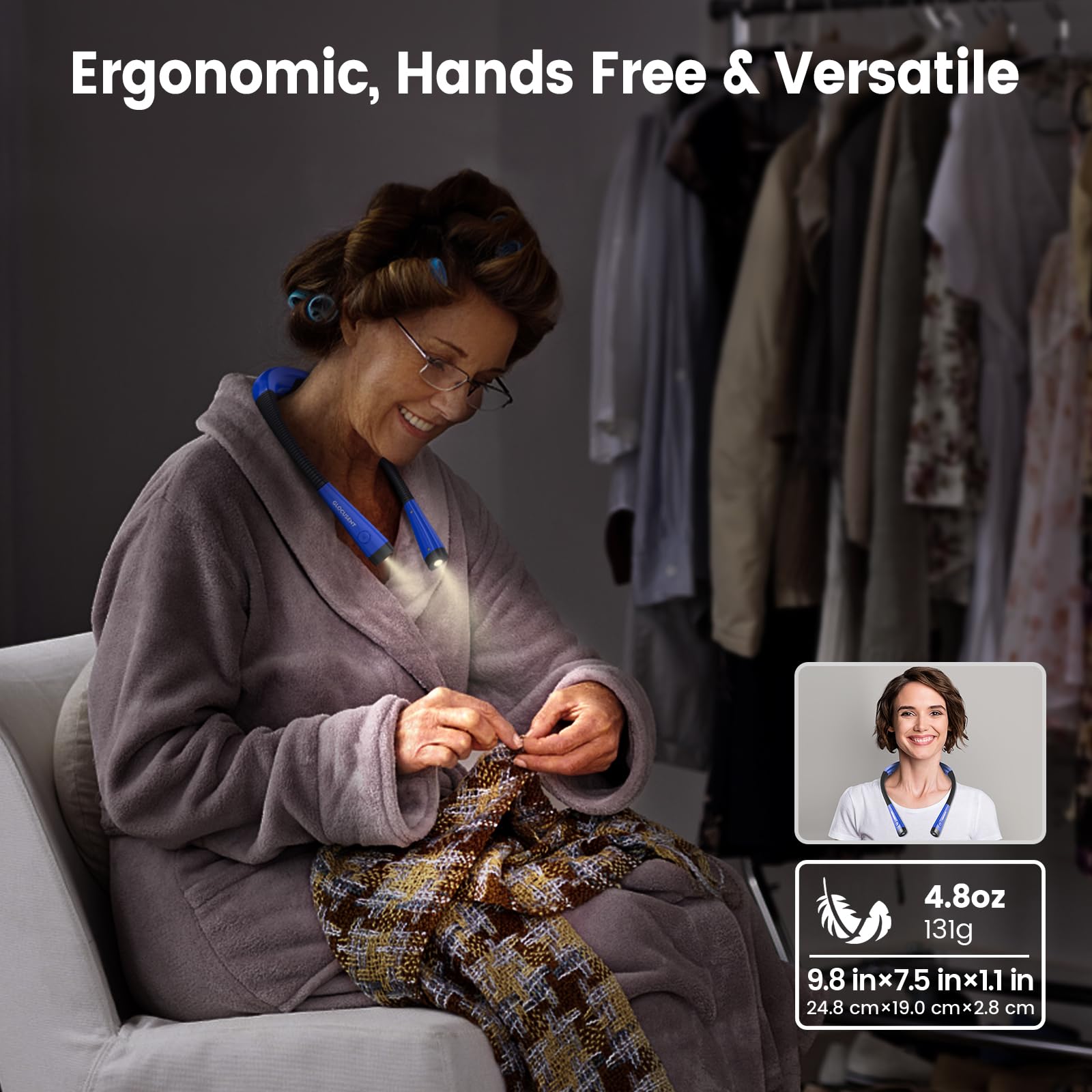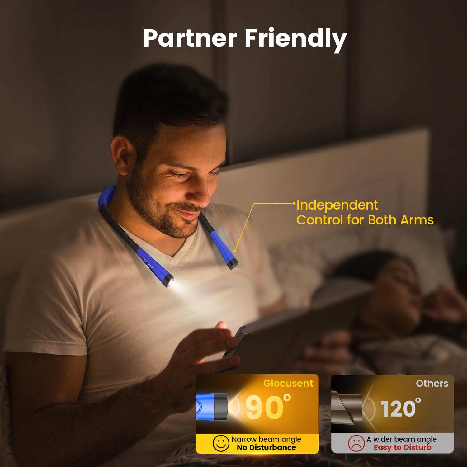 [Partner Friendly & Versatile] Unlike other book lights for reading at night in bed, the Glocusent neck book light has a special narrow beam angle (90°) design. It is bright enough to illuminate the area you focus on while being dim enough not to disturb your sleeping partner. Additionally, the hands-free feature allows you to engage in various delicate activities such as knitting, walking, repairing, and more. Make it a perfect versatile book light.
