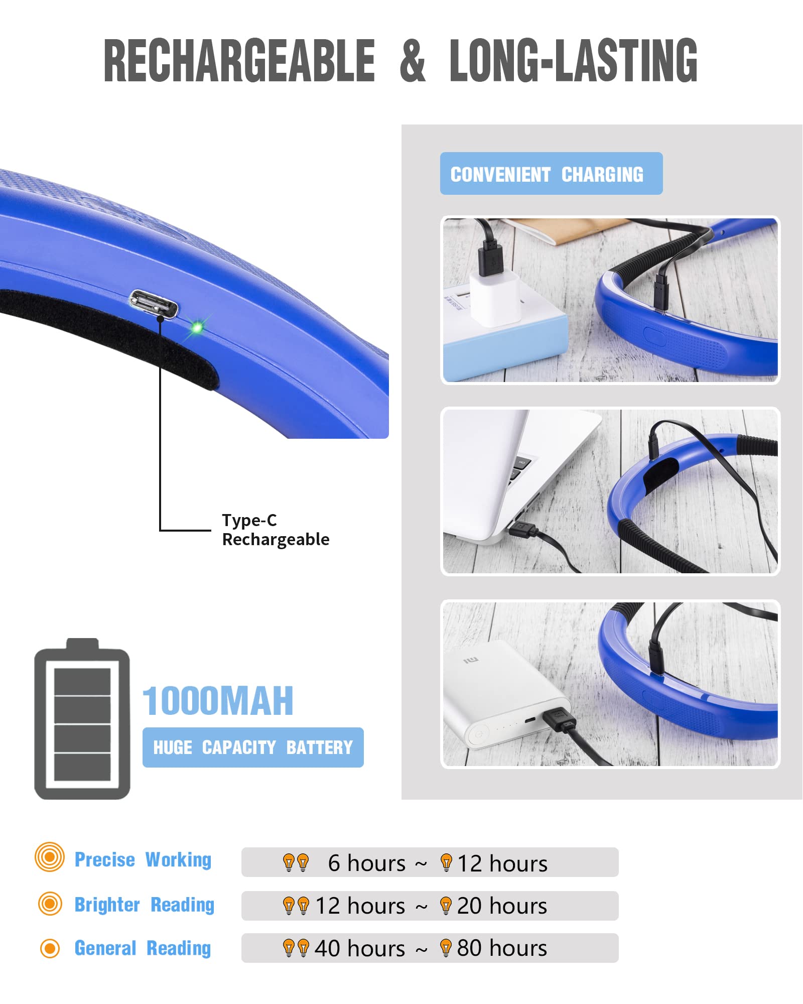 [Rechargeable & Long-Lasting] This neck reading light rechargeable with USB Type-C which is reversible and therefore easier to plug in compared with other neck lights for crafts charged with Micro-USB. Up to 80 hours (general reading, single head) of powerful, non-diminishing brightness from the included premium rechargeable 1000mAh battery. A long lasting usb rechargeable book light for reading in bed.