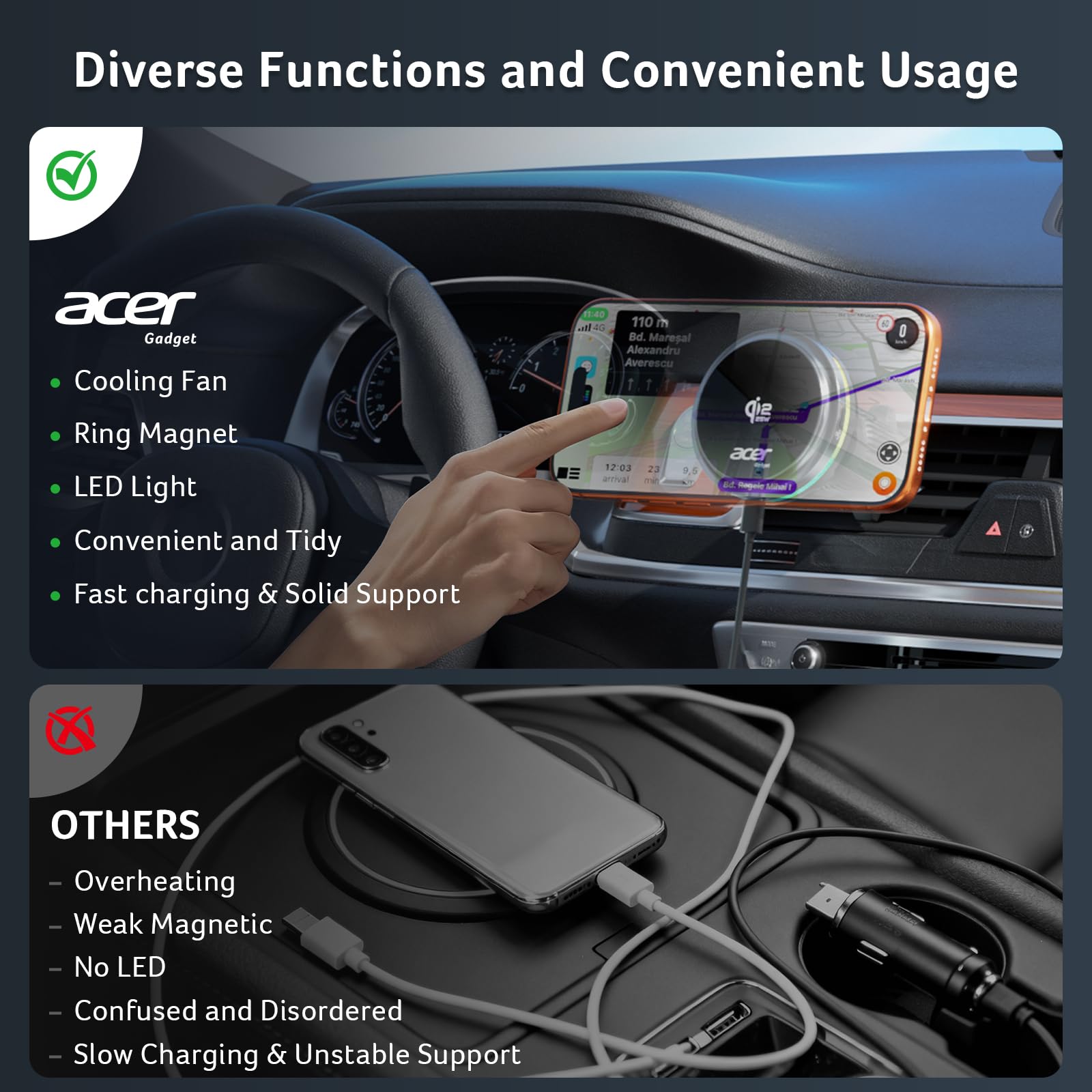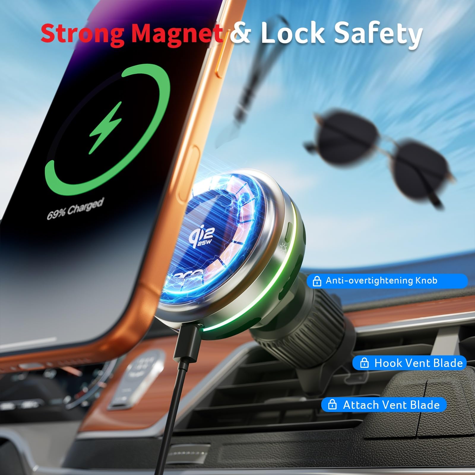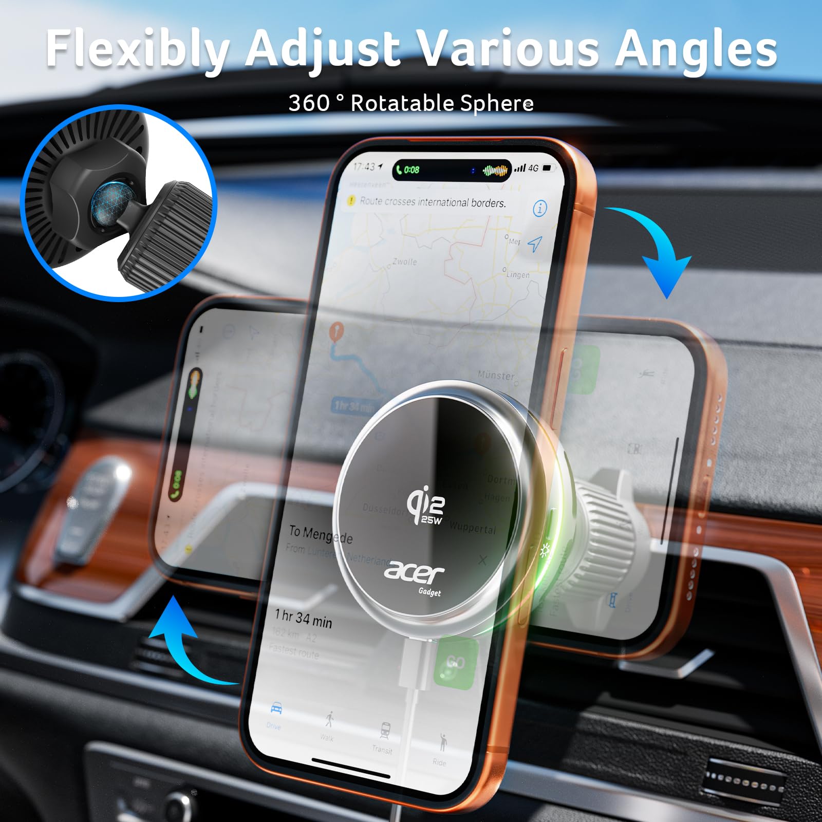 25W Fast Wireless Charging & Car Charger. This 25W for magsafe car mount charger that complies with the QI2.2 protocol uses magnetic induction for wireless charging. This mag safe car charger can achieve maximum charging speed when used with the included 45W car charger, and can charge your phone to approximately 45% battery capacity within 25 minutes. Using this wireless car charger ensures your device stays powered during navigation or long-distance driving.