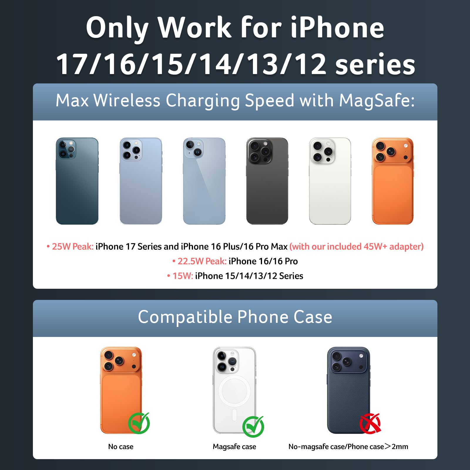 Wide Compatibility & Professional Accessories. Compatible with iPhone 17 Pro Max/Air 16 15 14 13 series. It also comes with a USB-C cable and a car charger. This phone holder for your car has passed multiple tests, including vibration, overvoltage protection, and temperature control, ensuring reliable and safe charging. We offer a 24-month extended warranty and professional after-sales service for this car wireless charger. Note: This charger does not support CarPlay!