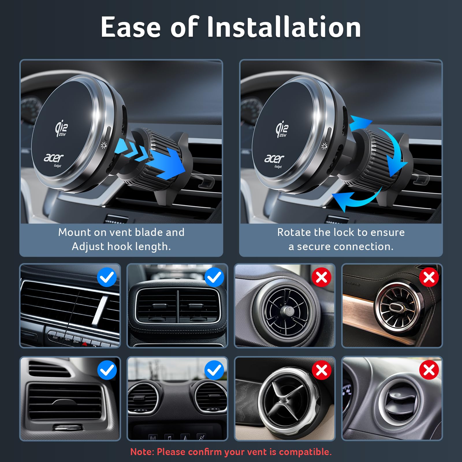 Strong Magnetic Attraction & Stable Hook. Built-in ring-shaped magnet provides unparalleled magnetic force and adhesion. This magnetic car mount for iPhone can securely hold your phone even with a case on. It stays firmly in place on bumpy roads or during sudden braking. The hook of the mag safe car mount is very stable and can be installed on various air vents. Once the hook is properly fixed, it will provide you with a stable and reliable usage experience.