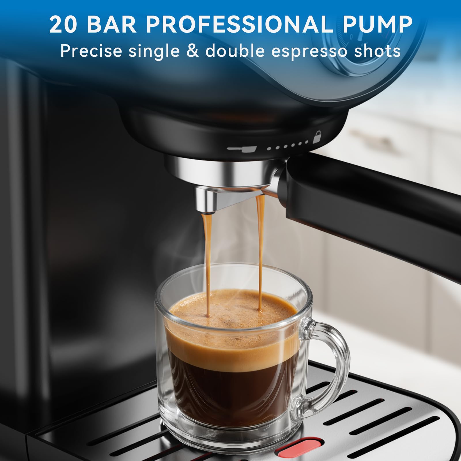 20-Bar Professional Pressure System: Experience café-quality drinks with this espresso machine for home, the 20-bar pressure system extracts golden crema consistently, enables continuous brewing for home/office use. It expertly brews rich espresso shots while its integrated frother transforms it into a cappuccino machine or latte machine