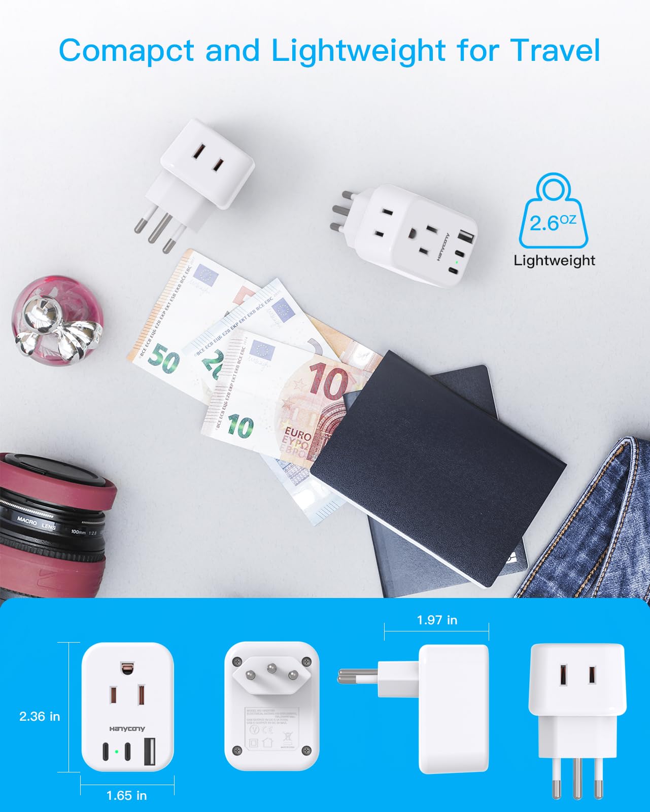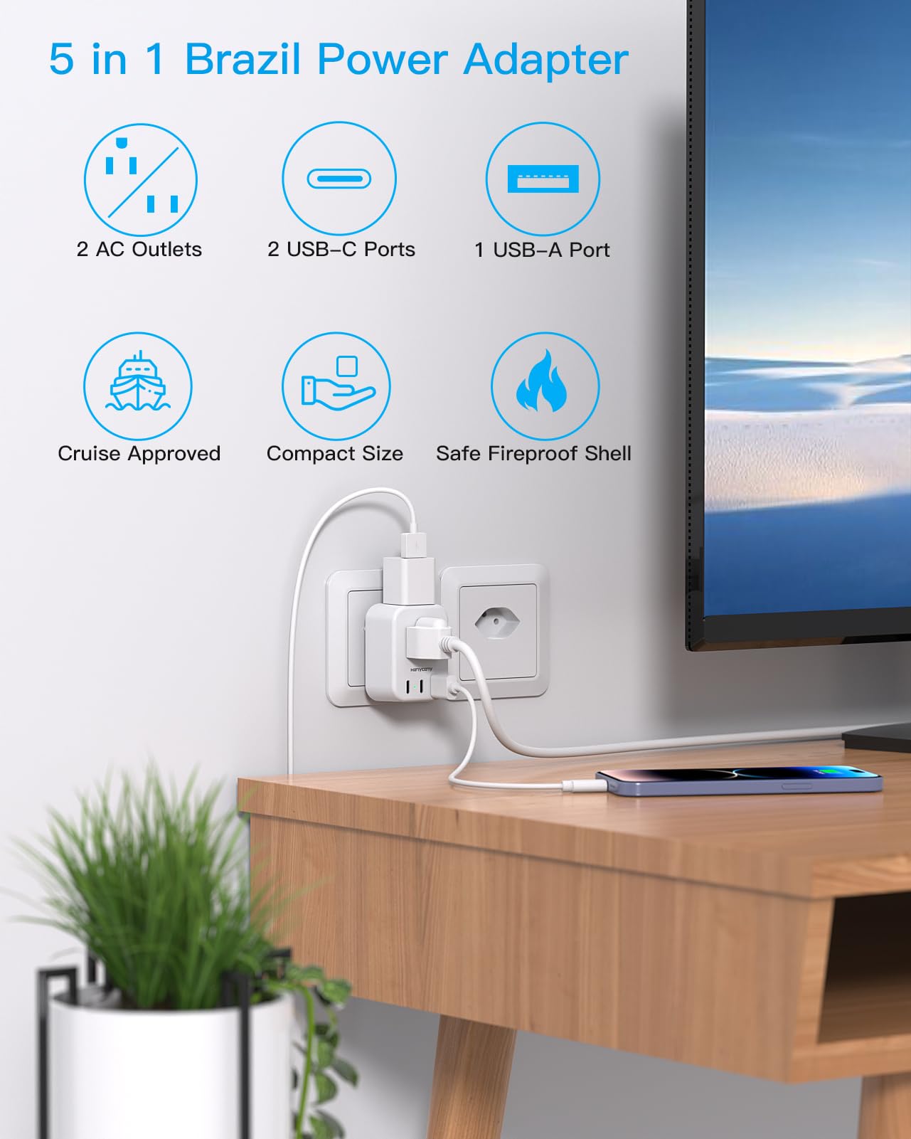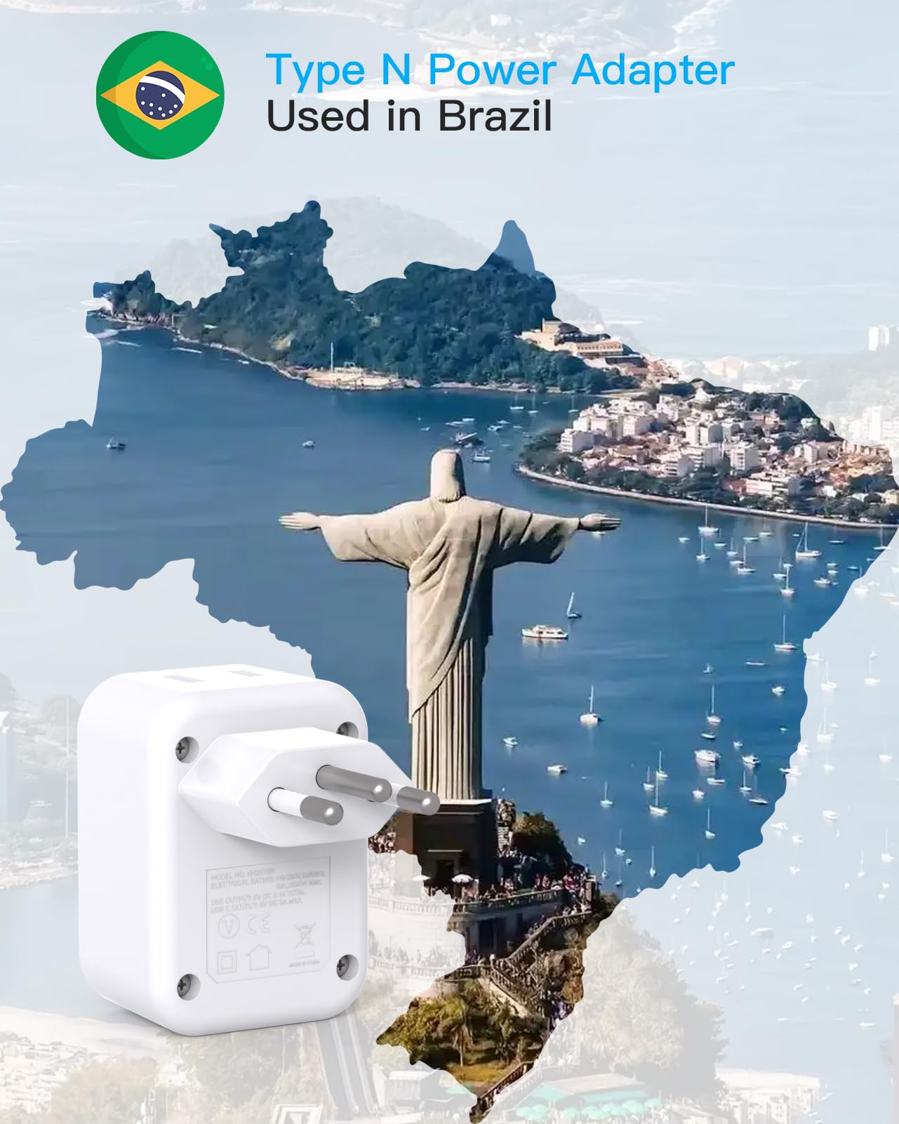【5 in 1 Brazil Adapter Plug】- The type N adapter provides 2 standard Amercian outlets, Max Capacity Up to 2500 Watt (max 250 Volt, 10 A); 3 USB Ports(2 USB C) can charge up to 3.1A, allowing you charge 5 devices simultaneously, ideal for cell phone, tablet, power bank and other electrical charger etc