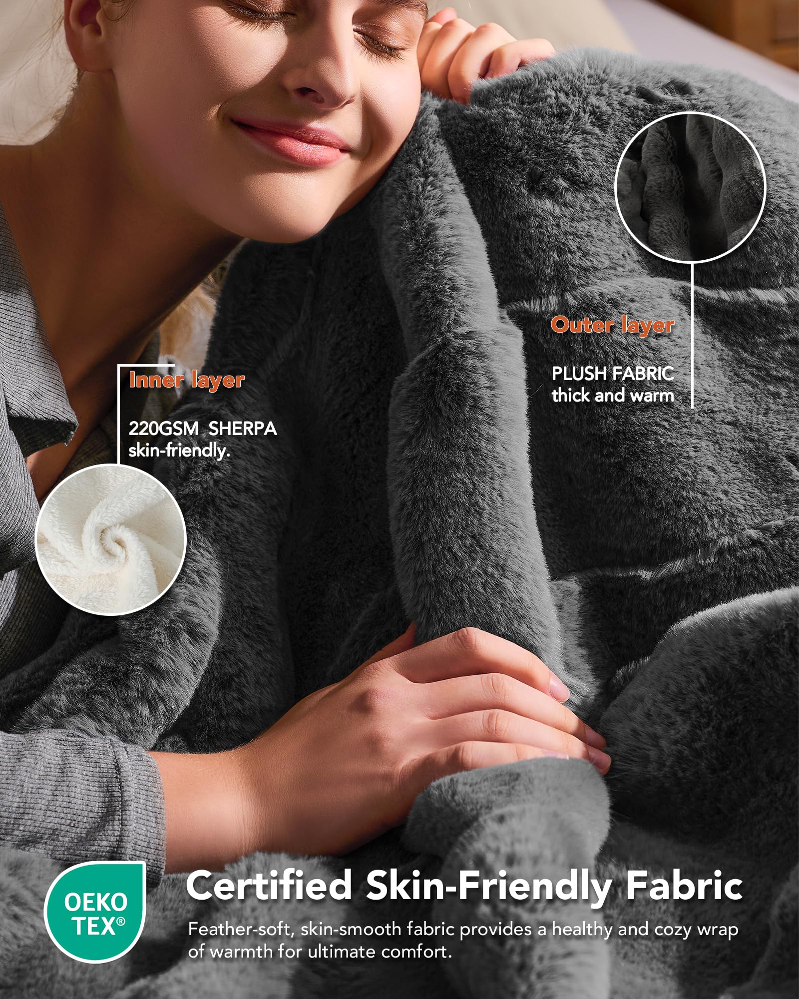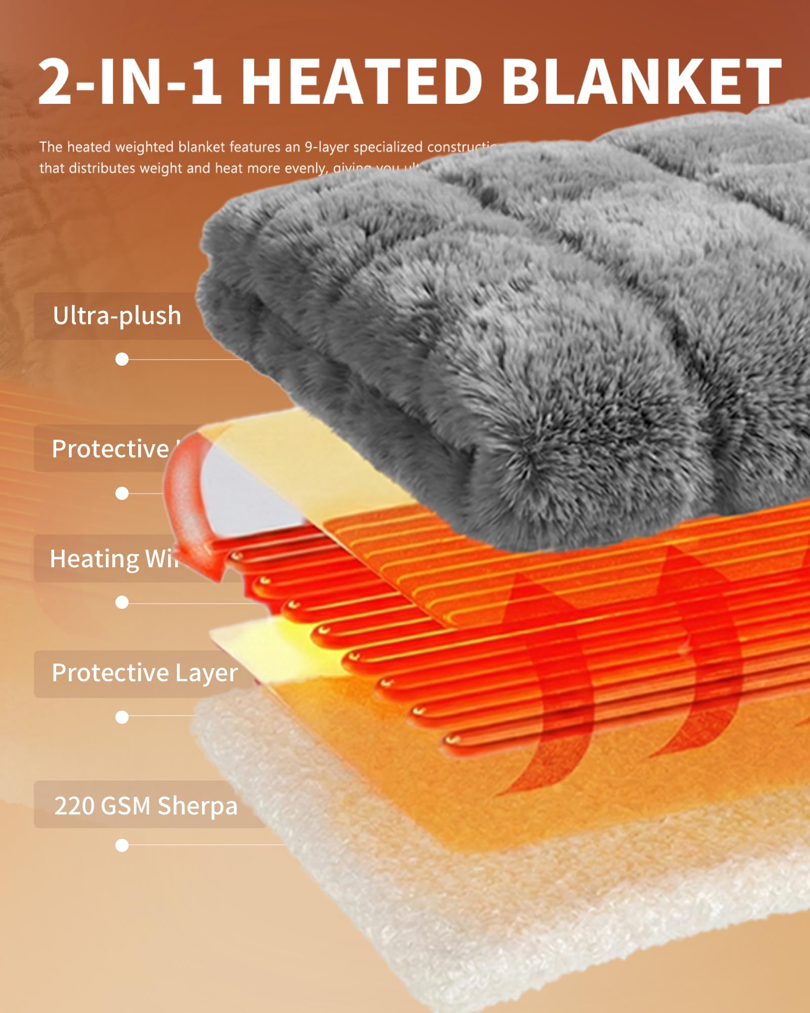 PREMIUM MATERIAL: 800gsm Faux Fur + 200gsm sherpa.The fabric is very soft,thicker than normal blankets,and warmer than normal blankets even without electricity.The fabric is durable and does not shed.The diameter of the heating wire is 2.2 mm,and the existence of the heating wire is hardly felt during use,which is more comfortable.