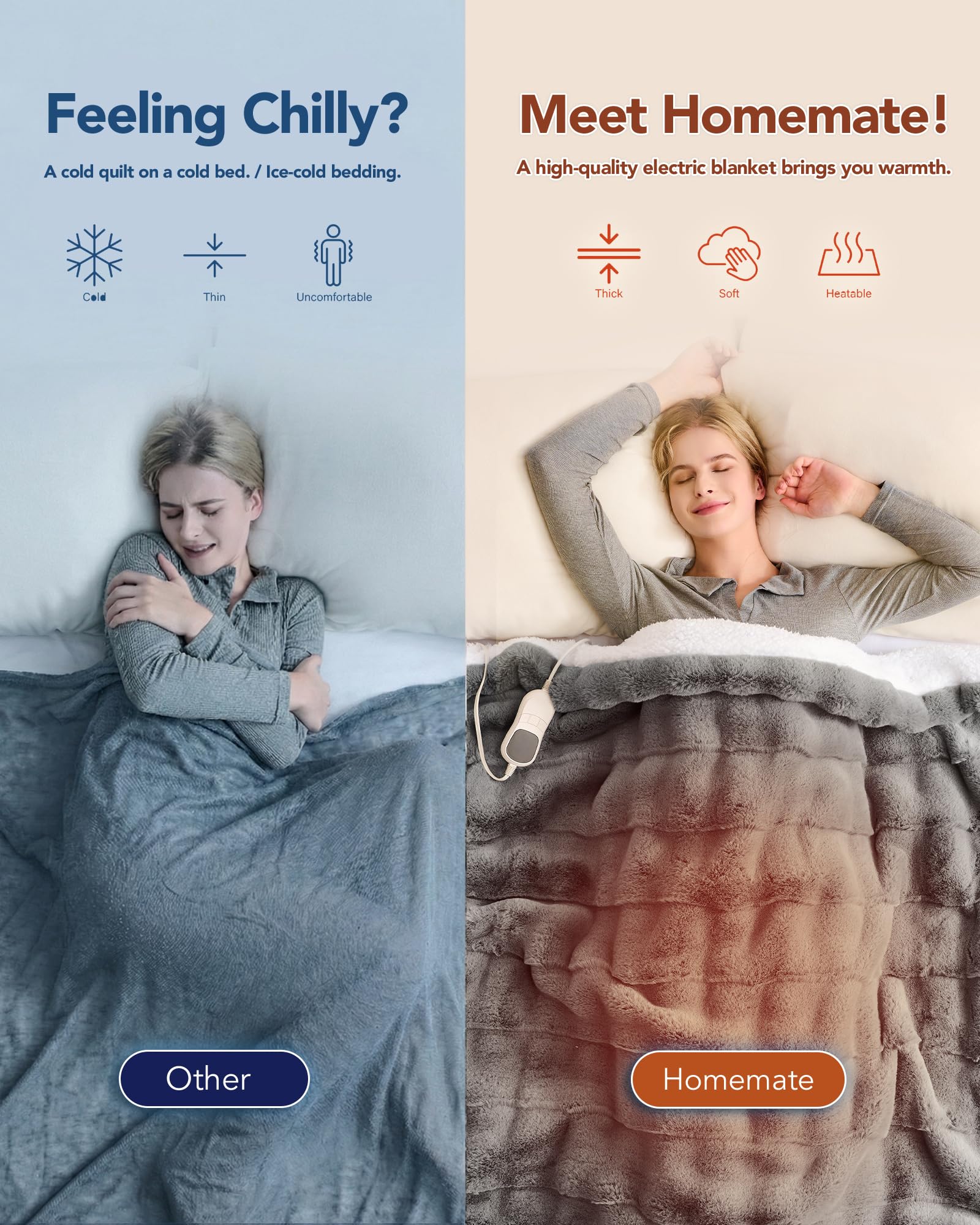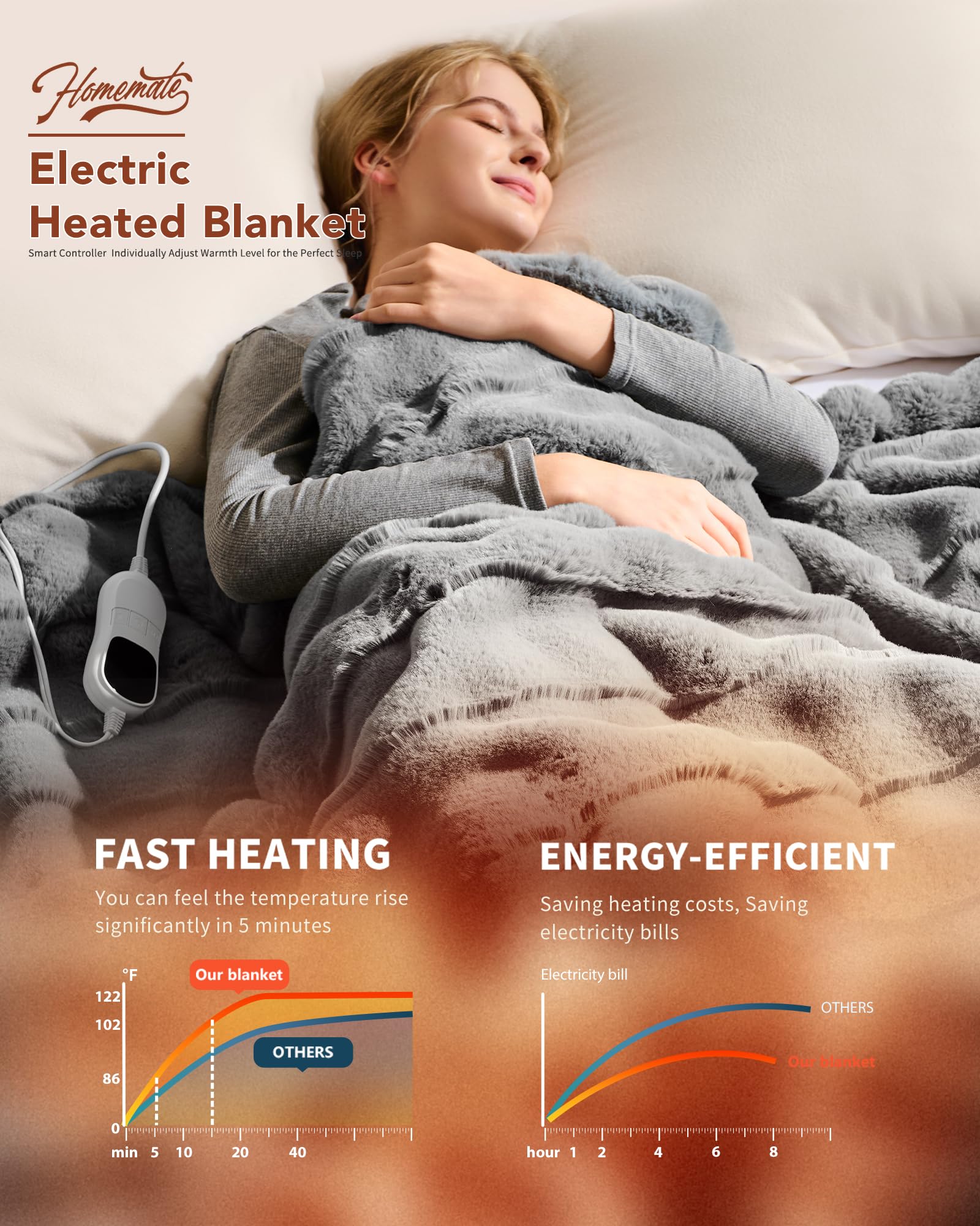 ENERGY SAVING: Homemate heated blanket use the intelligent temperature adjustment technology.When the temperature rises,the heated blanket will automatically adjust the temperature according to the surrounding environment,which can always provide users with a comfortable feeling and is conducive to energy saving.Compared with air conditioner,using Homemate heated blanket is more energy efficient,and you can save more heating costs in winter.