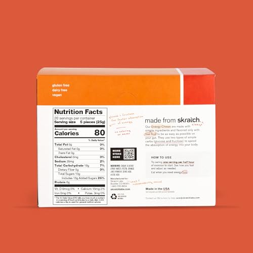 VERSATILE ENERGY SOURCE: Skratch Labs Energy Chews are a great alternative to traditional energy gels and blocks, with 80 calories and 19g of carbohydrates per serving, along with both glucose and fructose to speed up the absorption of energy in your body. Perfect for quick energy during any activity.