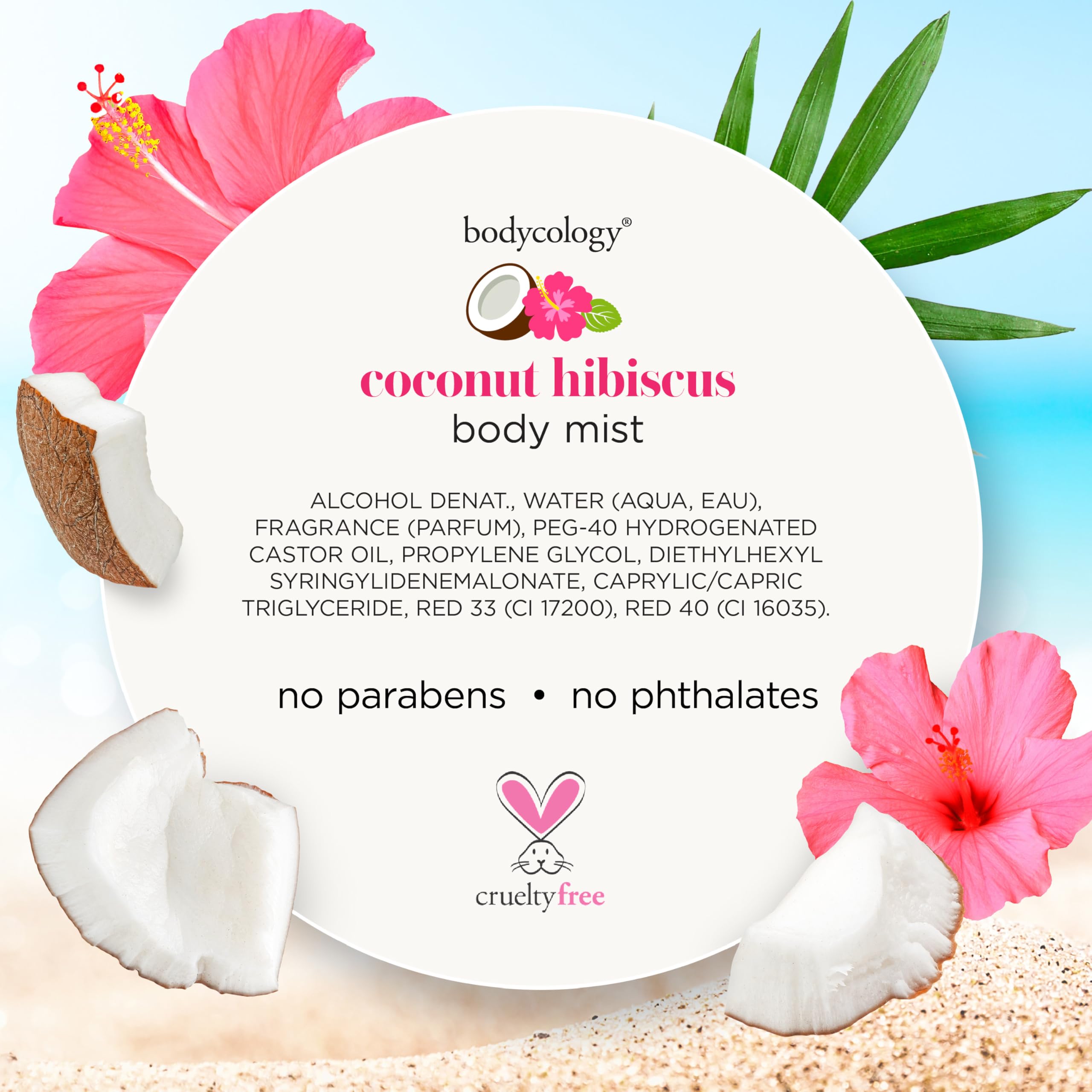 Wrap yourself in juicy fruits and bright florals when you wear the Bodycology Coconut Hibiscus Fragrance Body Mist. With just a spritz or two before your day begins, you can carry the gorgeous scent of sweet coconut, juicy melon and blooming hibiscus with you for hours. Exotic and enticing, we created this fragrance with island vacations in mind. Spritz it on your wrists, neck, and shoulders or try spraying the mist into the air and allowing it to fall gently onto your skin. Luxurious and fresh, this fragrance mist will quickly become a part of your beauty routine. This fragrance mist is the perfect follow-up after moisturizing with our Bodycology Coconut Hibiscus Shea Butter Body Cream. Mix and match with our other fragrance mists to create a scent that is uniquely yours. All Bodycology products are paraben, phthalate, and cruelty-free.