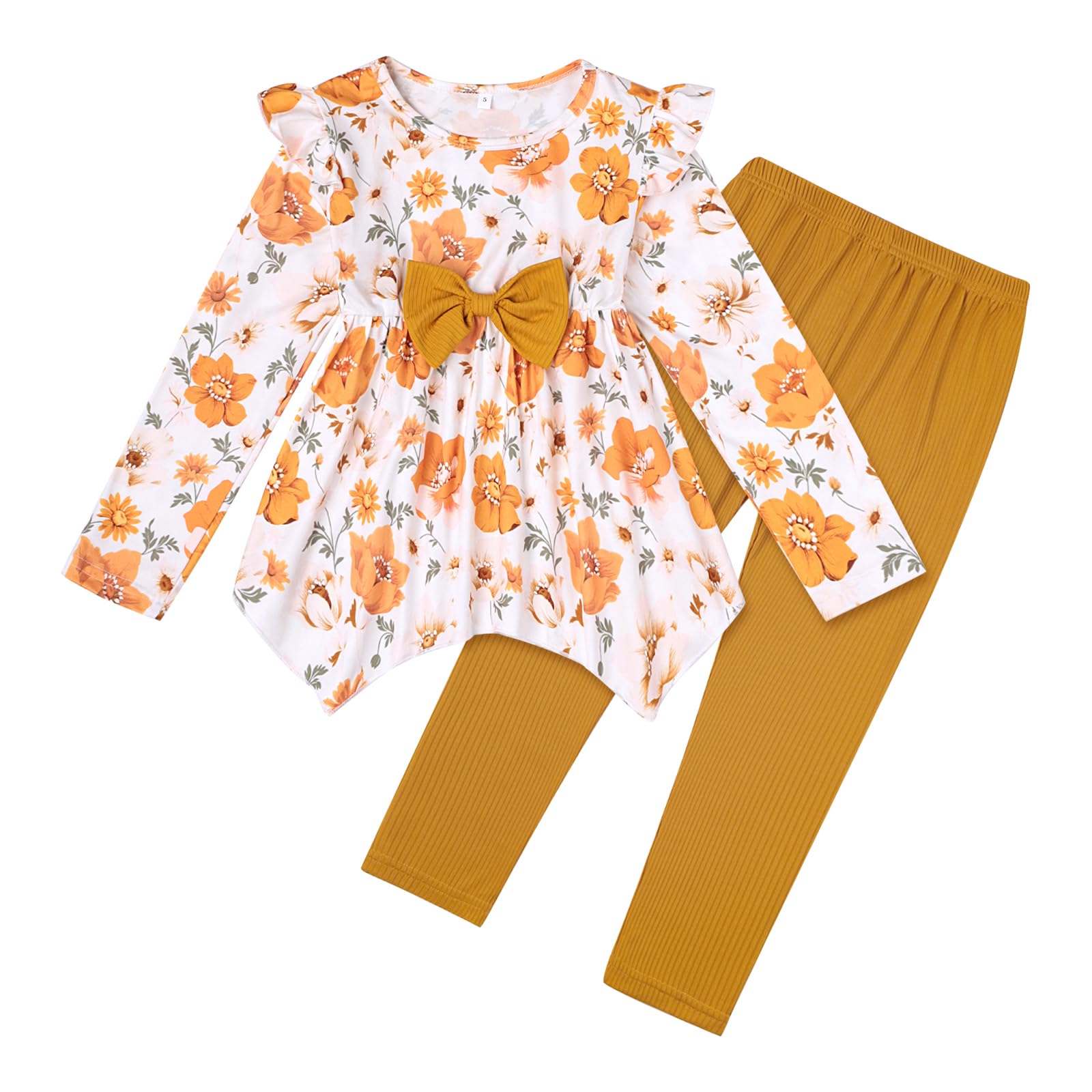 CUTE GIRLS CLOTHING: Cute Little toddler girls Bow-front High low top with Little Daisy Print pant set, adorable girls fall & Winter Two Piece Set.
